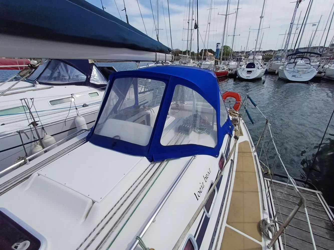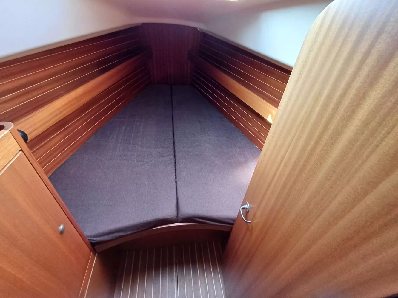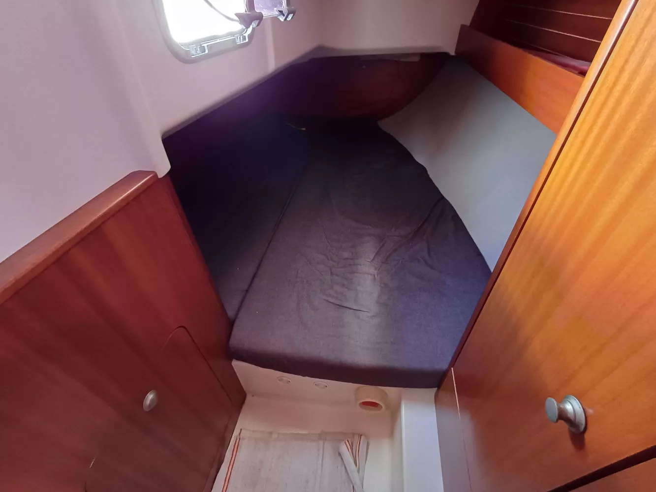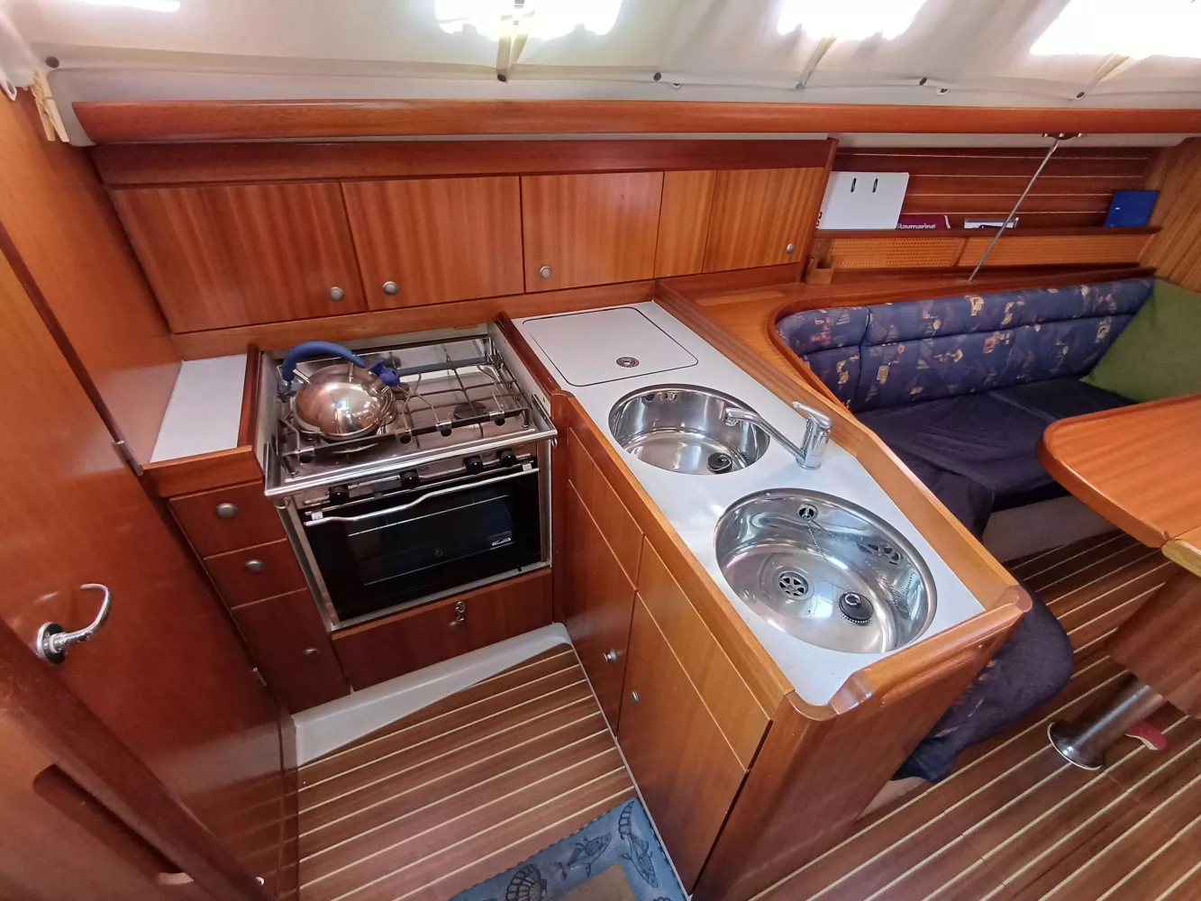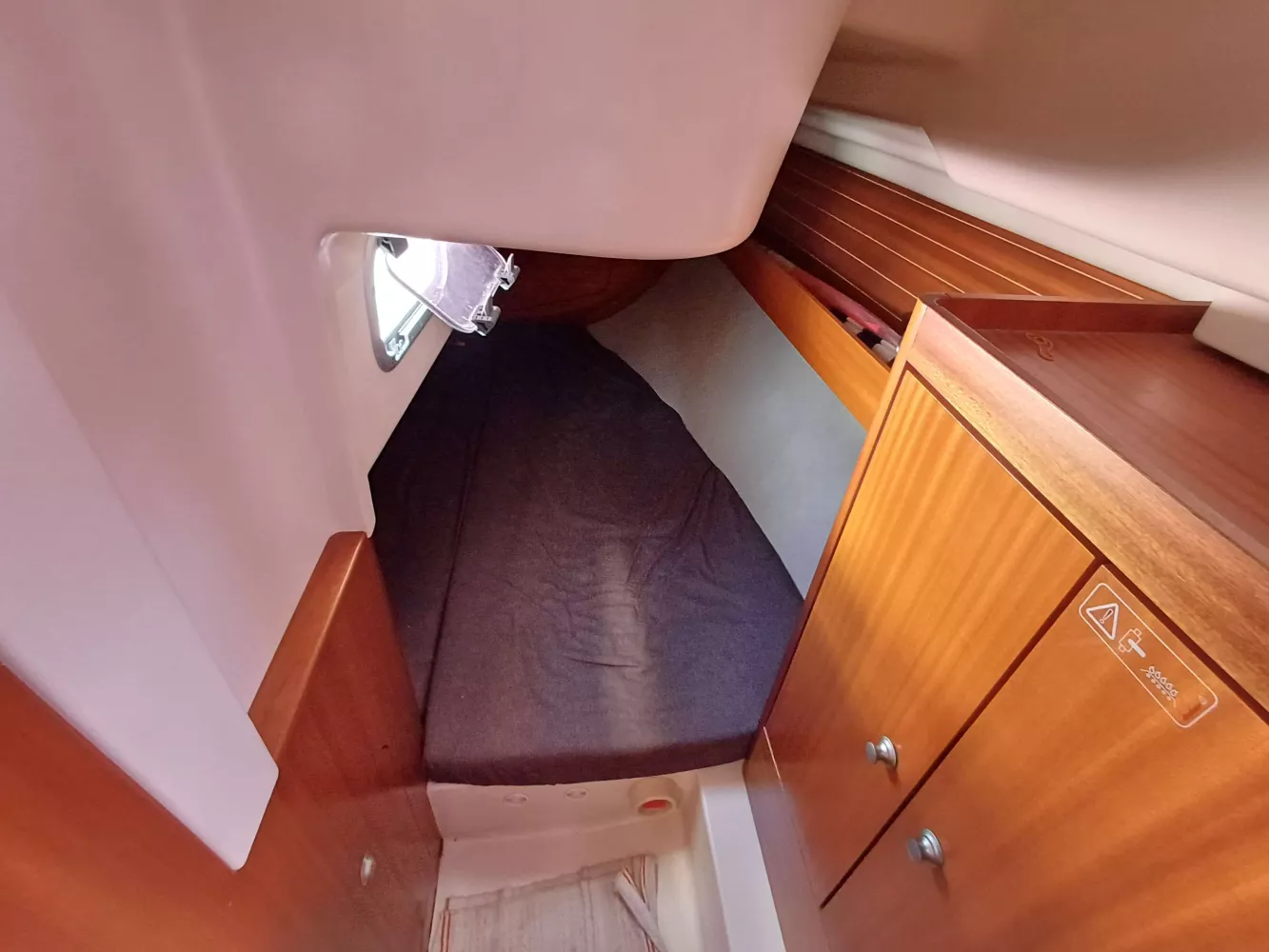 *Intérieur : 2 cabines + 1 salle d'eau avec WC marin, Coin cuisine en L (double évier avec eau douce froide/chaude sous pression, four, réchaud gaz 2 feux, réfrigérateur, rangements), Plancher stratifié, Coin navigateur avec table à carte dans le sens de la marche + électronique, Grand carré avec table, Compartiment salle d'eau avec douche et WC marin, Ballon d'eau chaude, Prise de quai + chargeur, 2 batteries de service + 1 batterie moteur (2021).