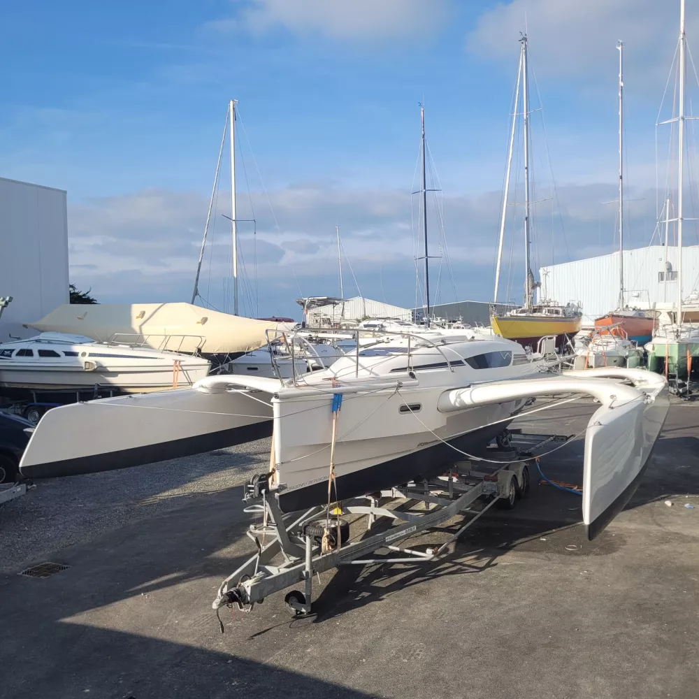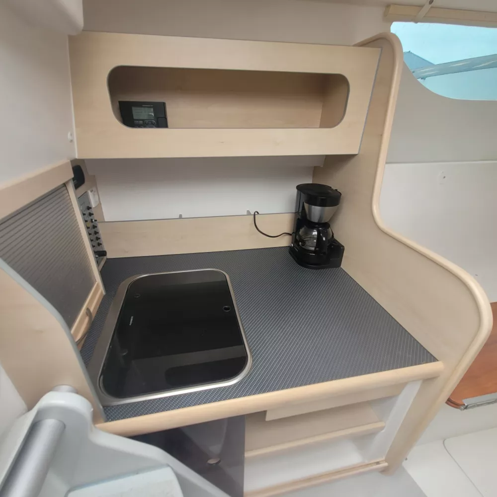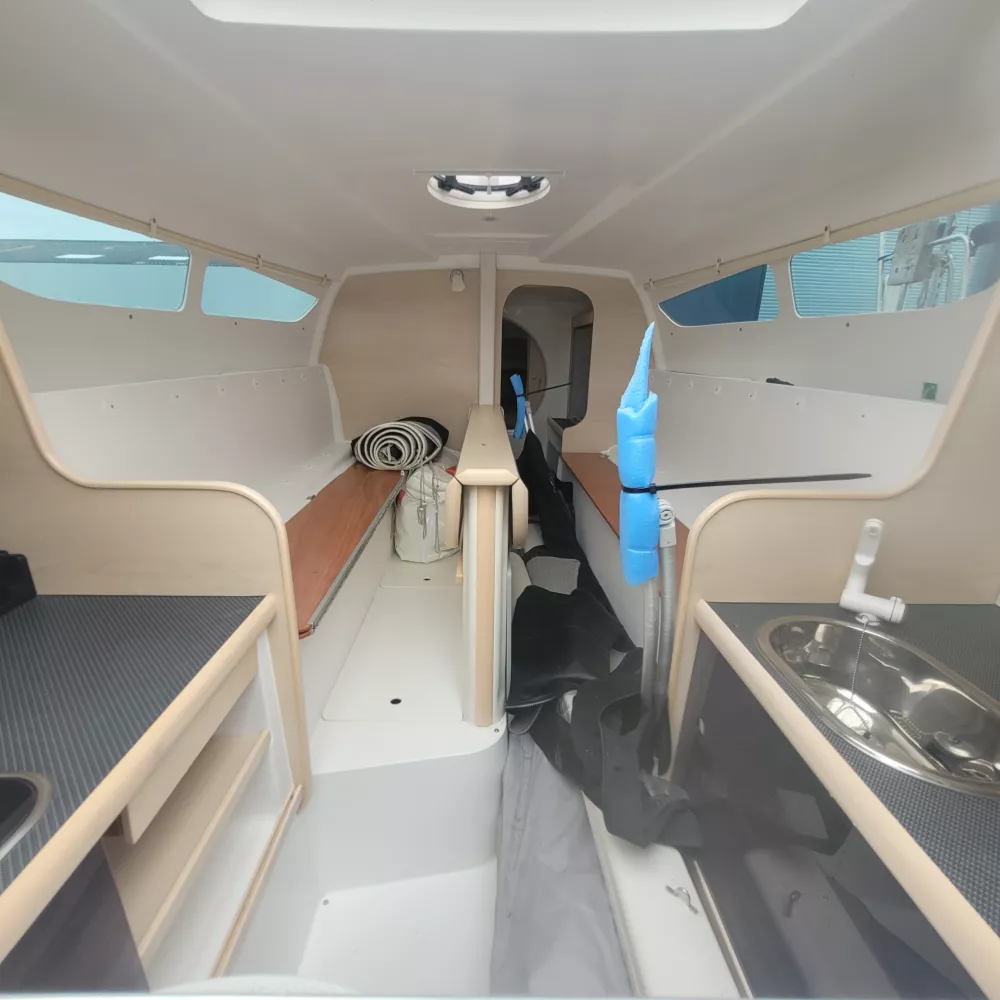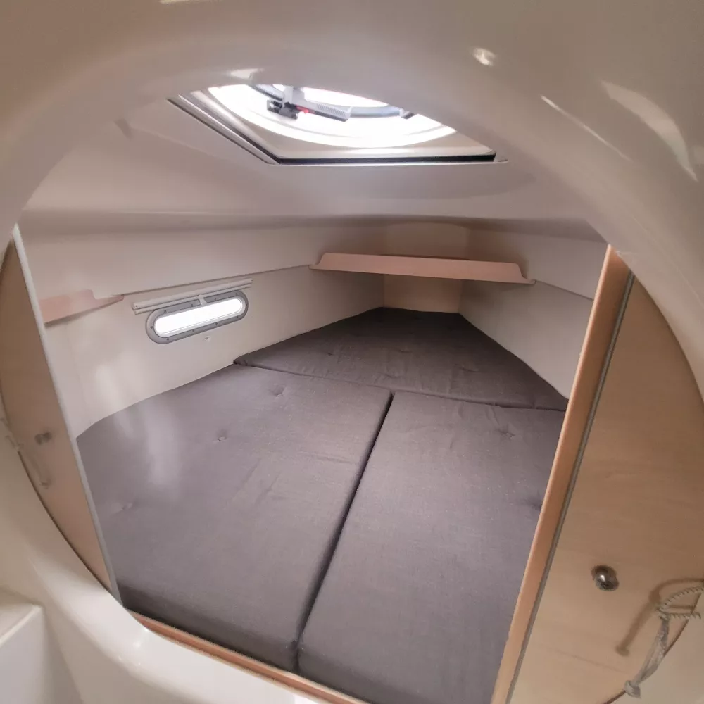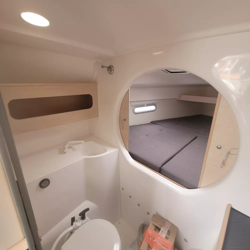 1 cabine double à l’avant, 1 cabine d’appoint à l’arrière, 1 toilette séparée, Mât carbone de 13.60m