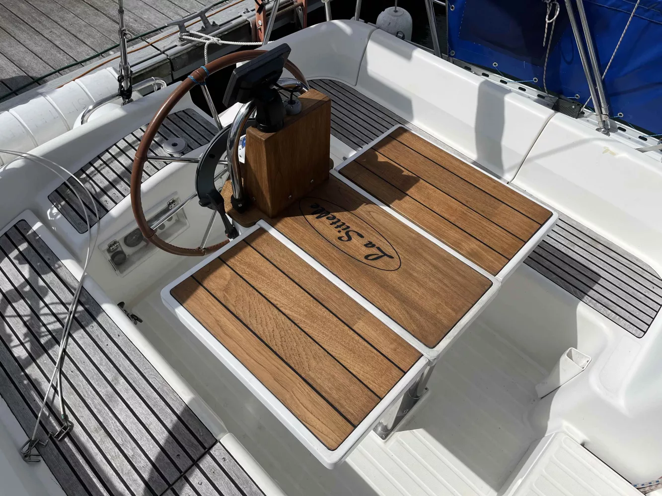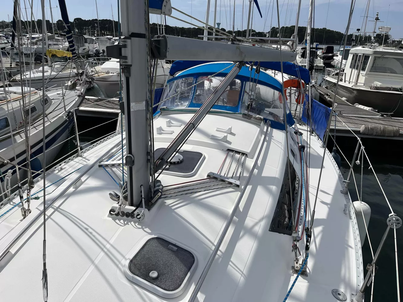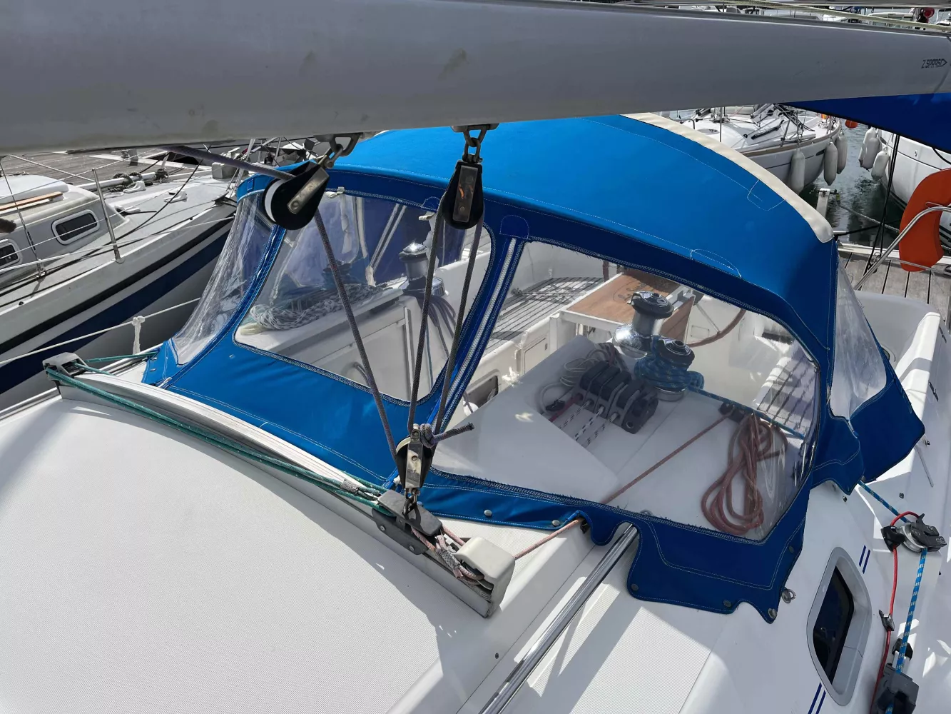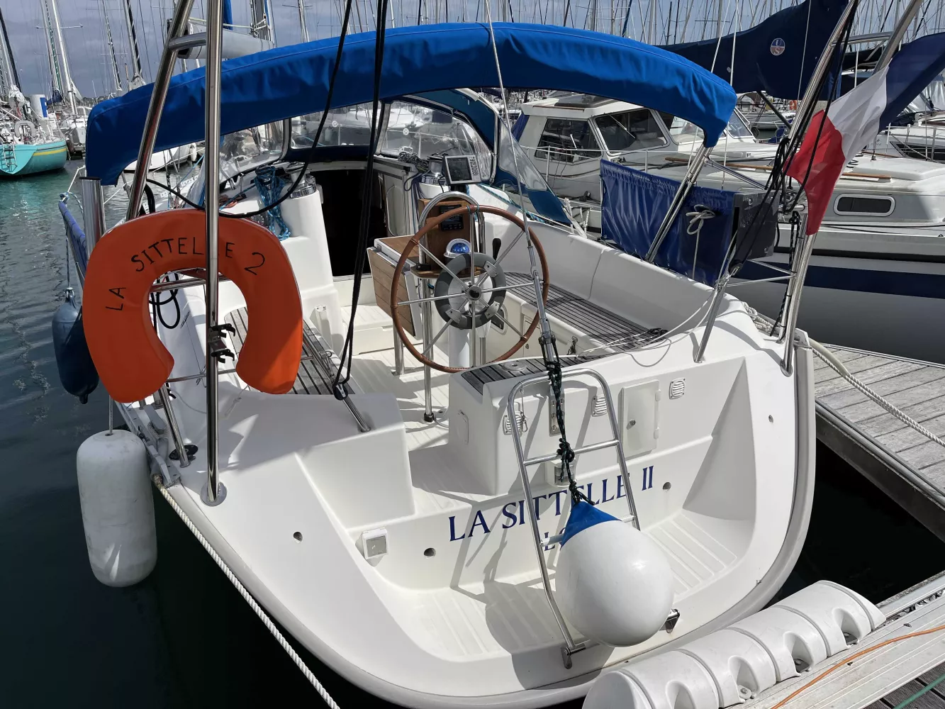 *Extérieur : Capote de roof, Jupe arrière avec échelle de bain et douchette de cockpit, Prise de quai, Répétiteurs dans le cockpit, Emplacement pour bouteille de gaz, 2 grand coffres de rangement dans le cockpit, Portique avec 2 panneaux solaires neufs (100W) et éolienne, Guindeau électrique neuf.