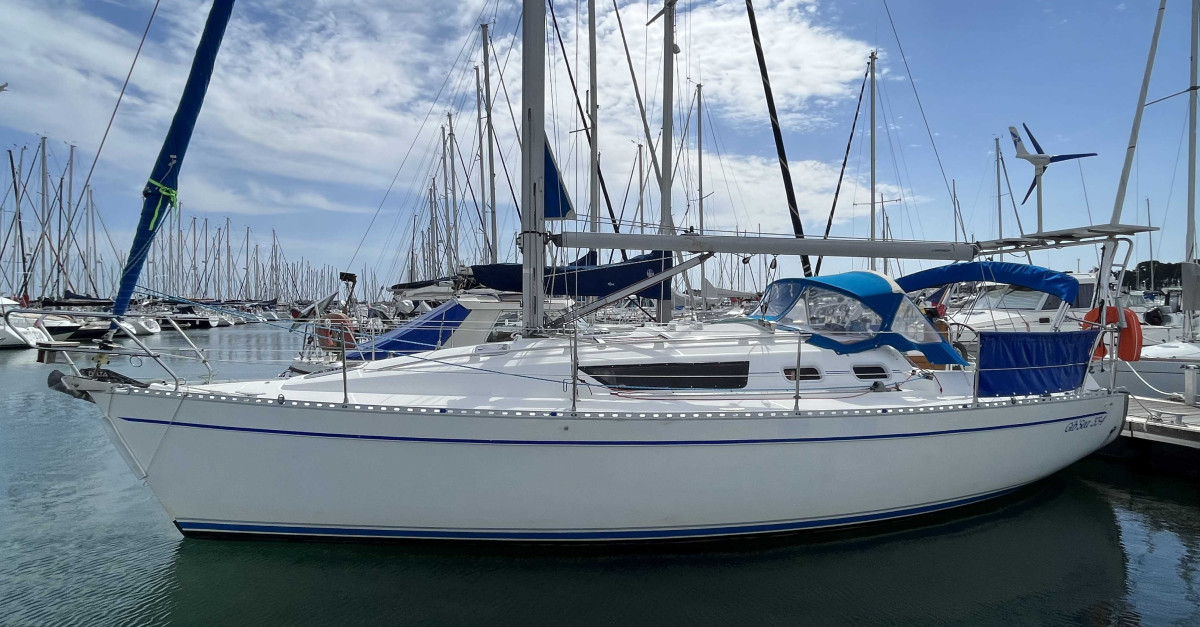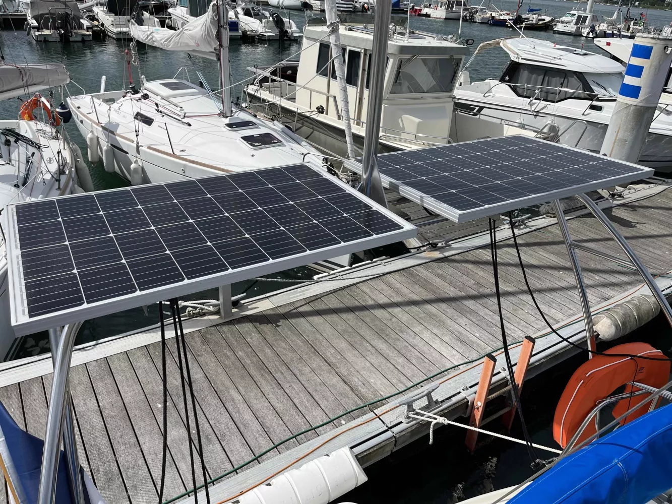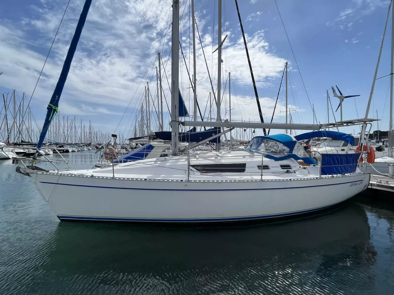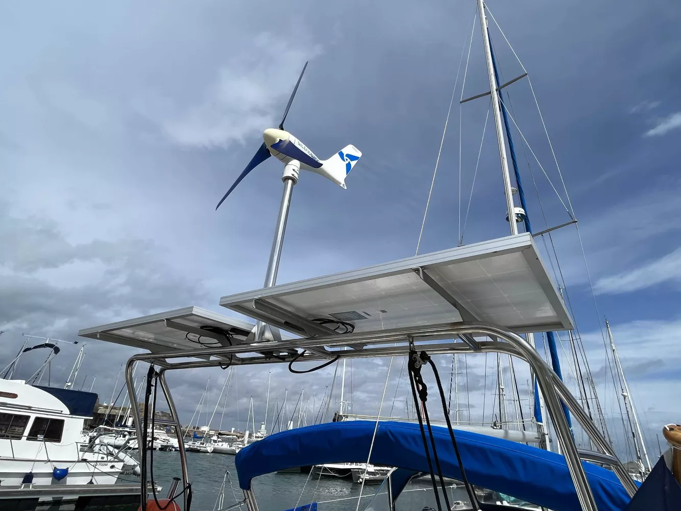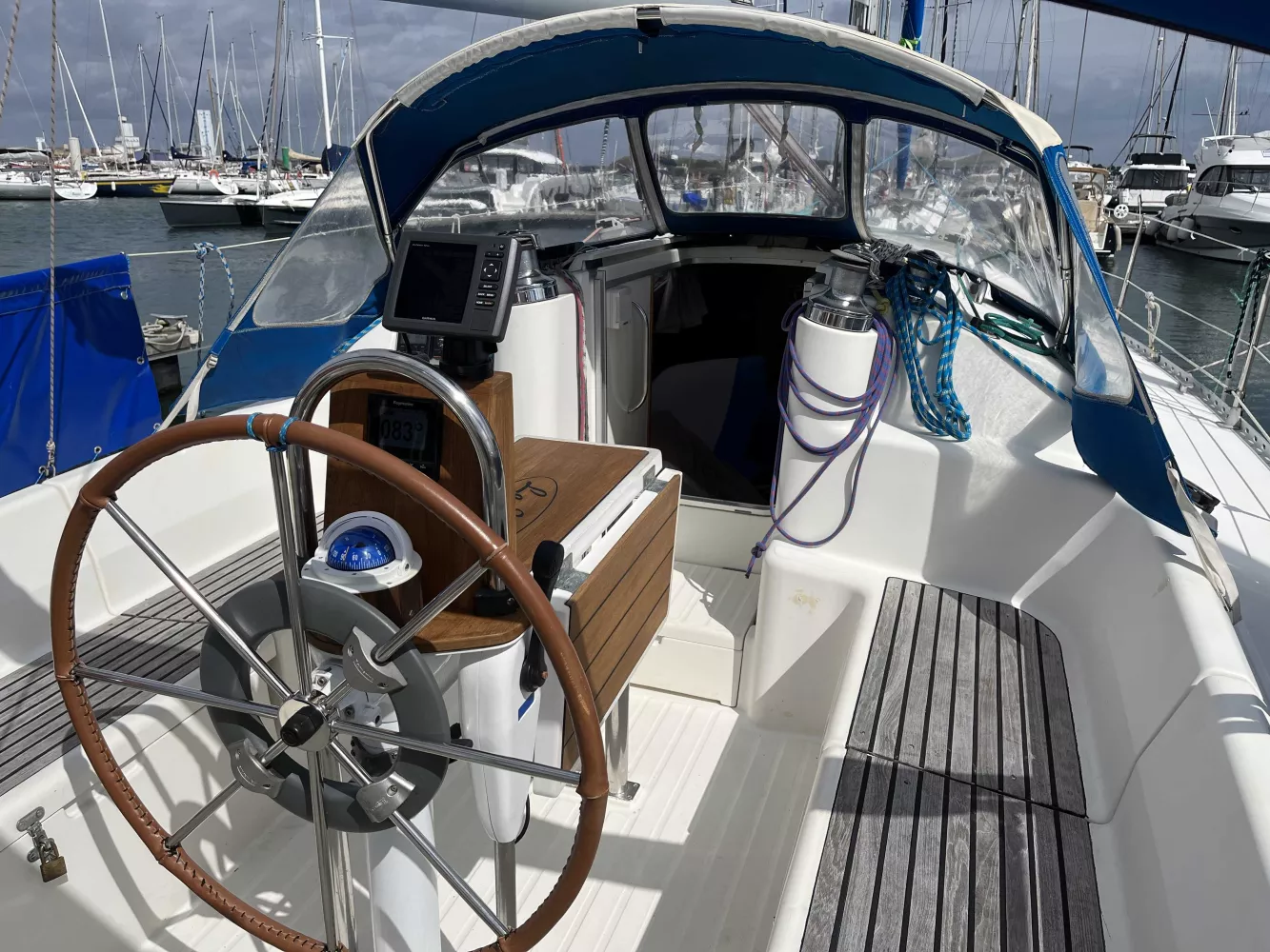 *Extérieur : Capote de roof, Jupe arrière avec échelle de bain et douchette de cockpit, Prise de quai, Répétiteurs dans le cockpit, Emplacement pour bouteille de gaz, 2 grand coffres de rangement dans le cockpit, Portique avec 2 panneaux solaires neufs (100W) et éolienne, Guindeau électrique neuf.