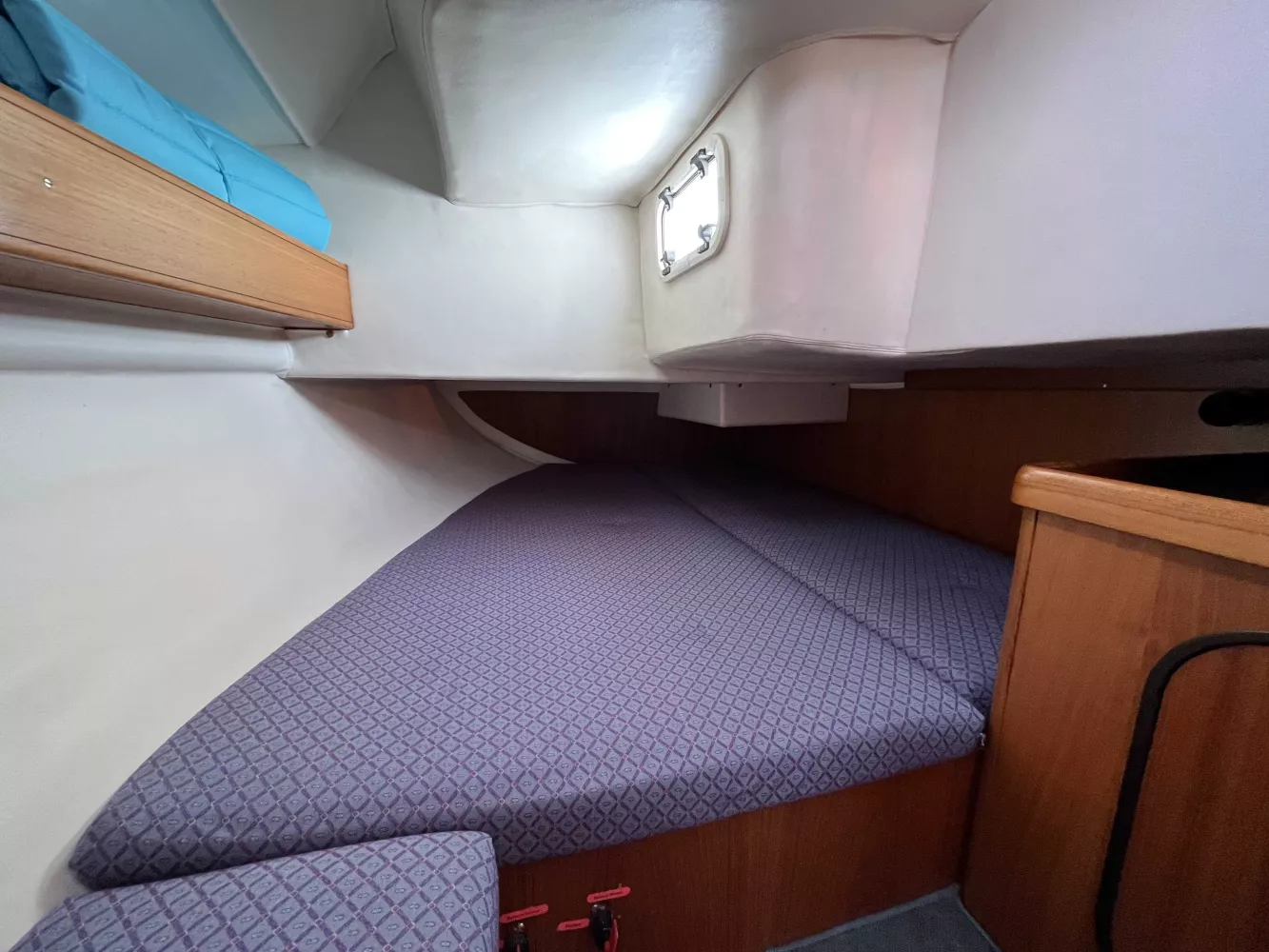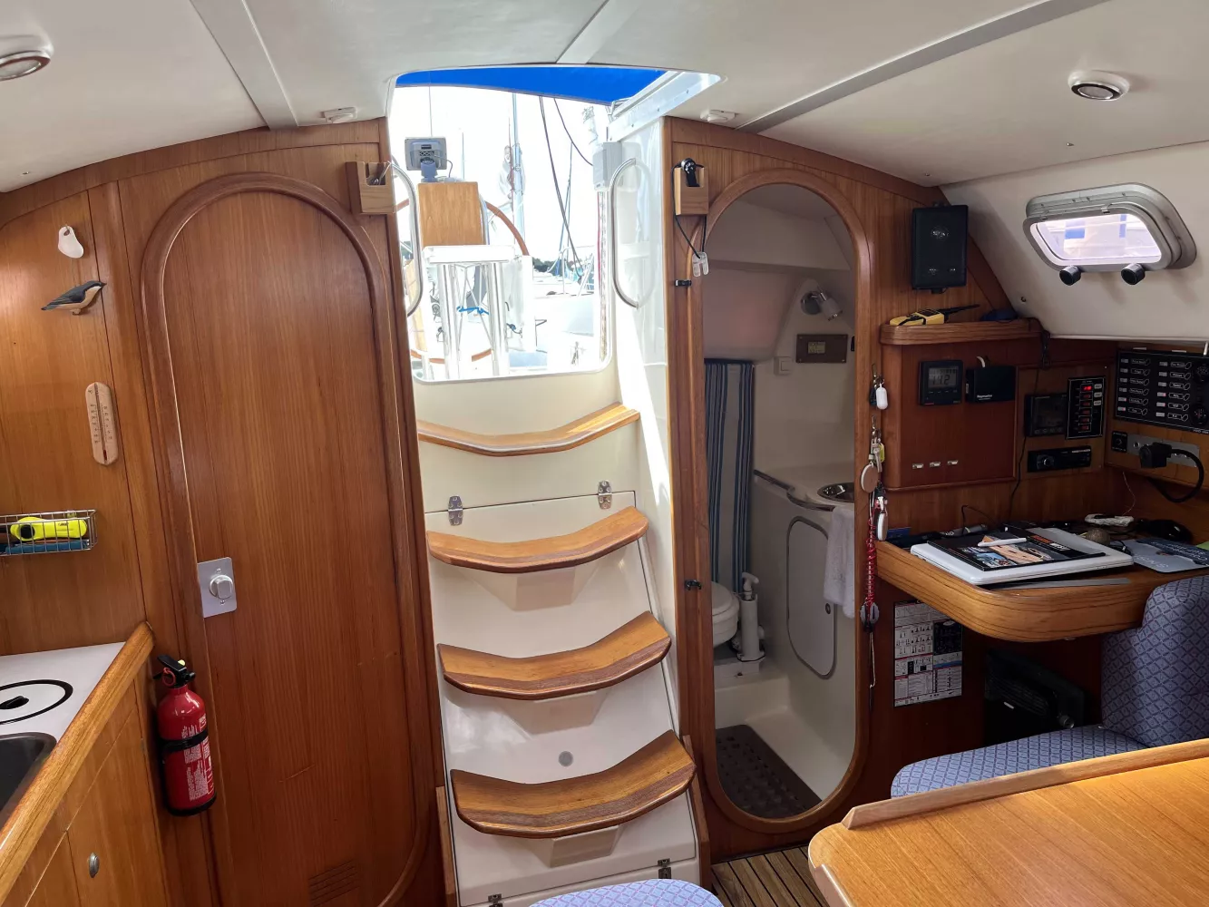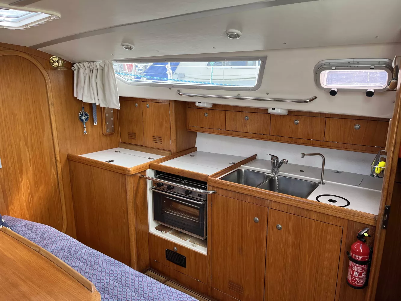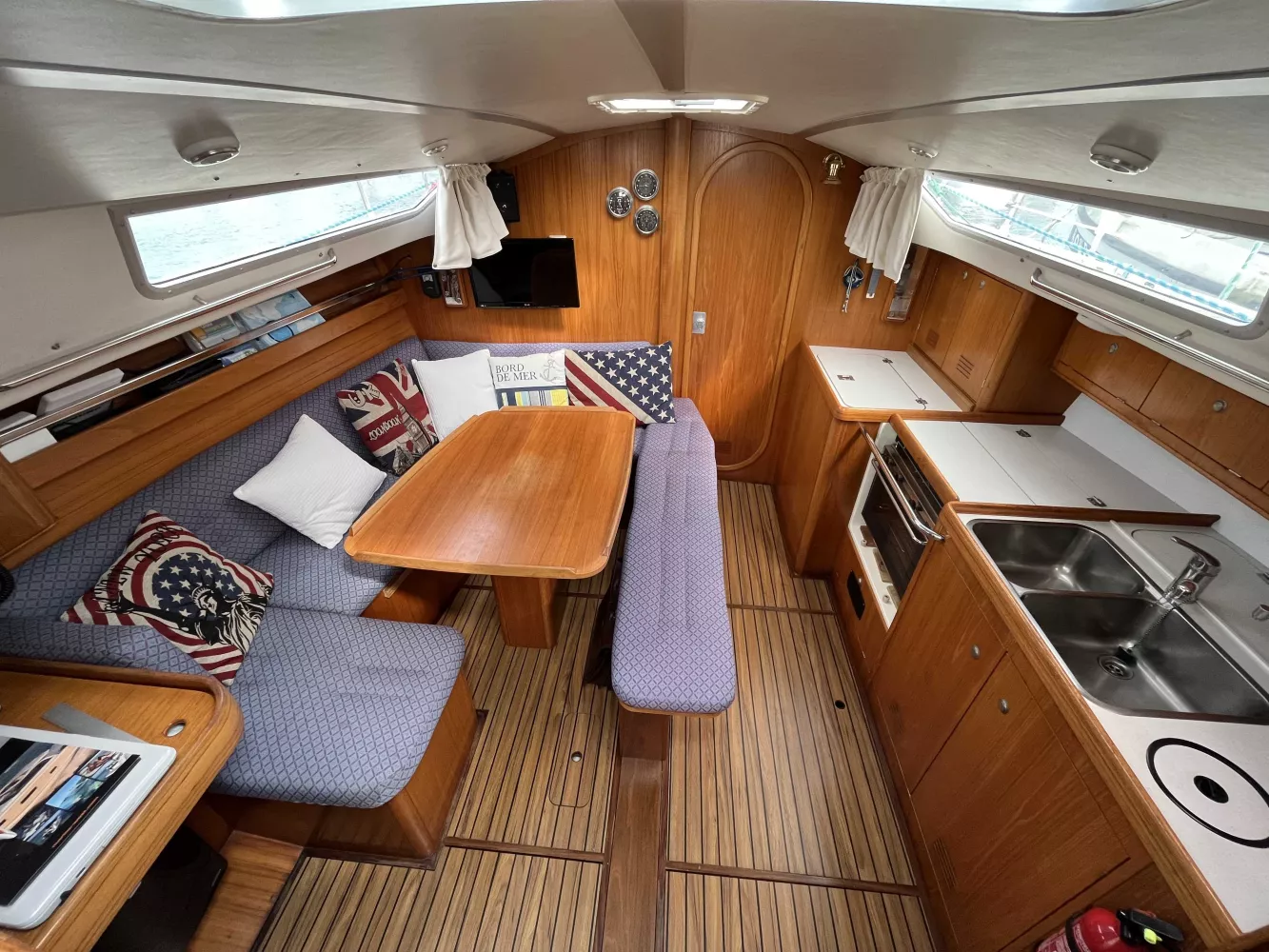 *Intérieur : 2 cabines + 1 salle d'eau avec WC marin, coin cuisine (avec évier, four + réchaud gaz 2 feux, eau douce froide/chaude sous pression), Nombreux rangements, Grand carré avec table transformable en couchage, Coin table à cartes avec l'électronique de bord, Rideaux intérieurs, Ballon d'eau chaude. Les planchers, selleries et vaigrages sont dans un très bon état.