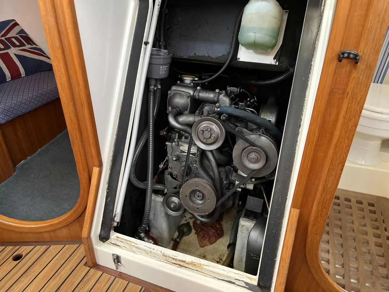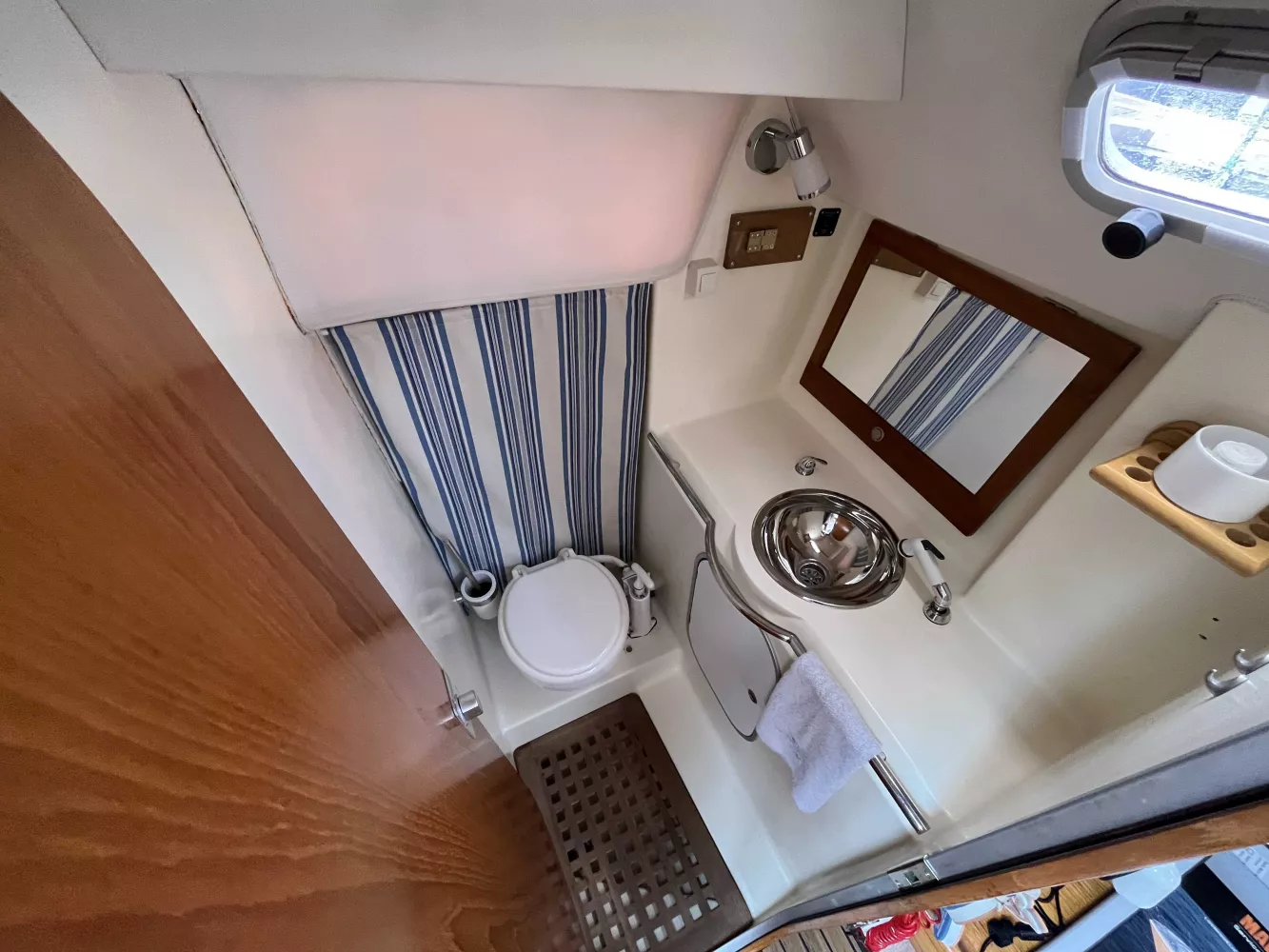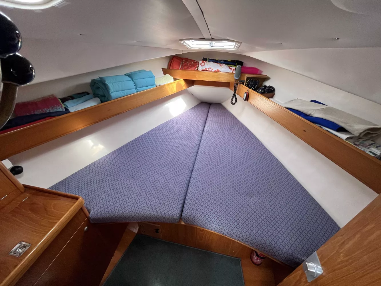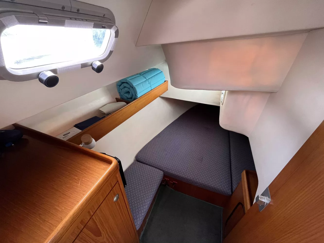 *Intérieur : 2 cabines + 1 salle d'eau avec WC marin, coin cuisine (avec évier, four + réchaud gaz 2 feux, eau douce froide/chaude sous pression), Nombreux rangements, Grand carré avec table transformable en couchage, Coin table à cartes avec l'électronique de bord, Rideaux intérieurs, Ballon d'eau chaude. Les planchers, selleries et vaigrages sont dans un très bon état.