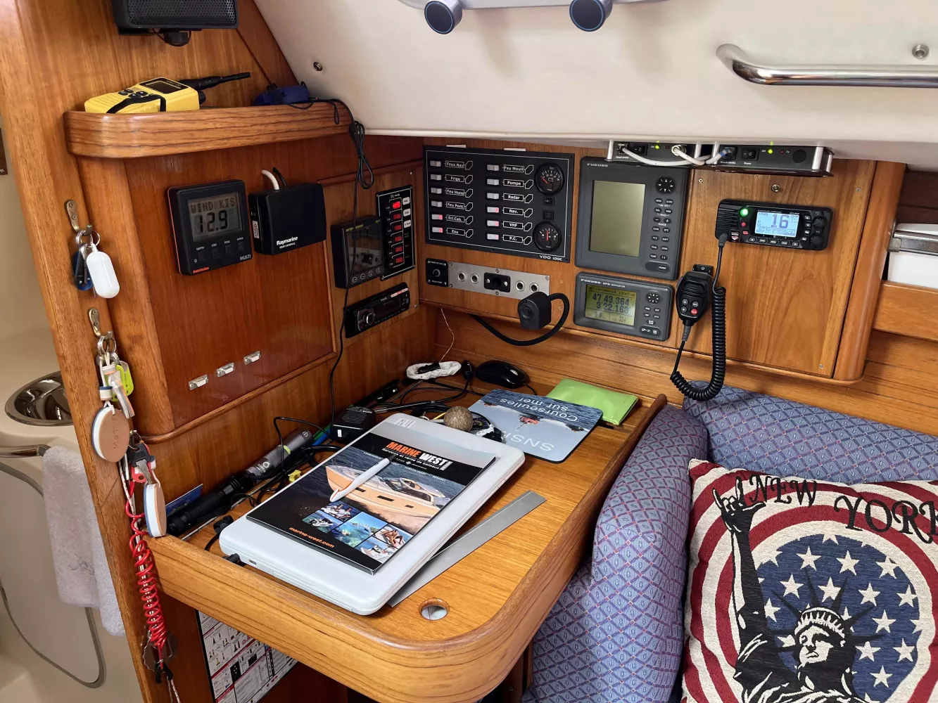 *Électronique/Éléctricité: Pilote automatique, GPS/Traceur Garmin Echomap 52DV, GPS Furuno, Afficheur Autohelm, Sondeur, Loch/Speedo, VHF Fixe, Lecteur radio, Antenne TV, 3 batteries (2021).