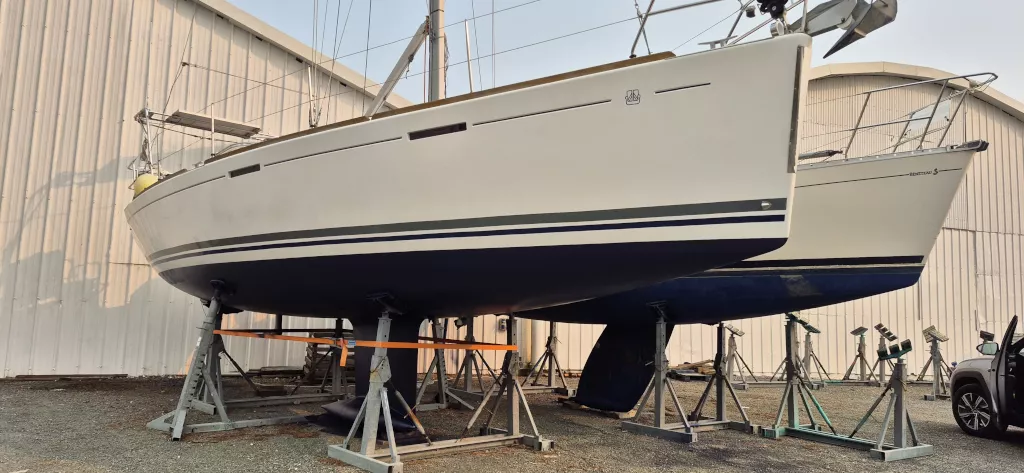 Coque : aérogommage, primer epoxy, traitement du lest et joint de quille, changement de tous les passes-coques et vannes (laiton).