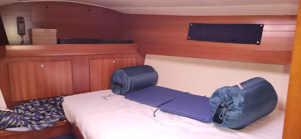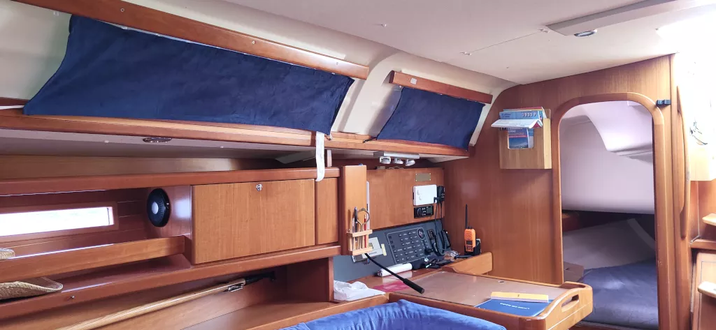 Intérieur : Autoradio stéréo 2024. matelas couchettes neufs, WC jabsco 2024 (boite à eaux noires), convertisseur 220V