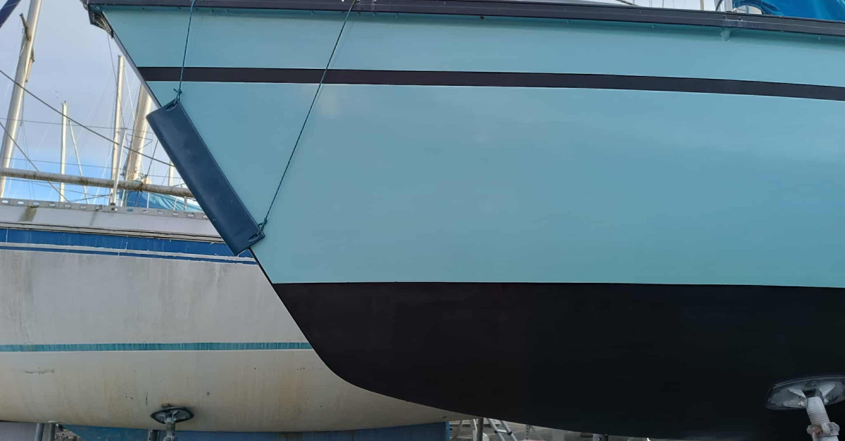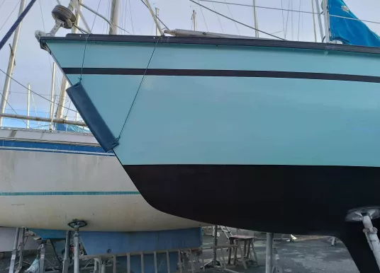 Je n'ai pas de photo de l'intérieur pour le moment, mais en voici de la carène (elles datent de septembre 2024, mais donnent déjà une idée de son état). A l'intérieur, il y a 2 mini fuites, mais rien de grave. Tout le reste est nickel. Housses de mousses grises, étanches et anti-UV. Rideaux bleu turquoise tout neufs.