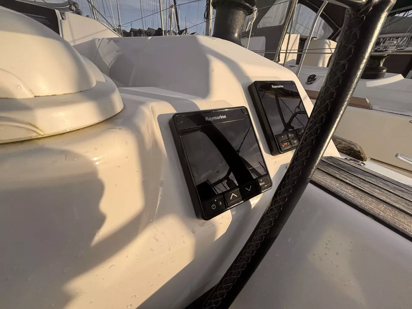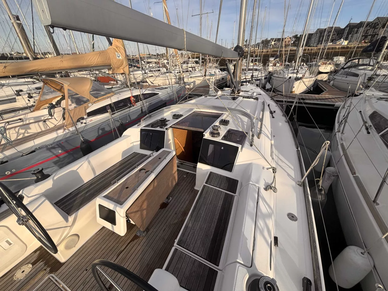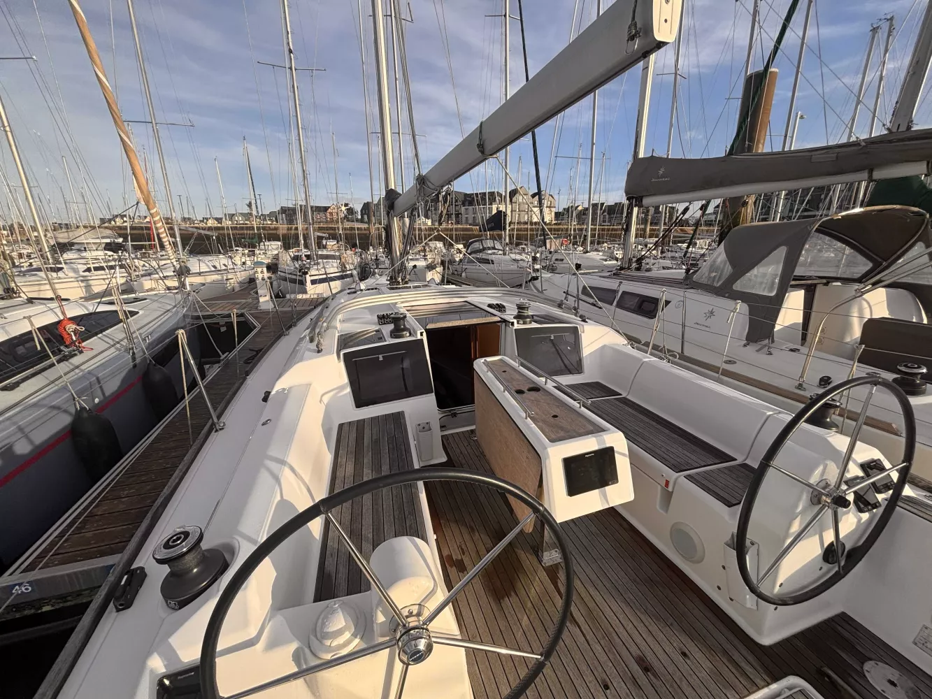 Fond de cockpit et assises teck / VHF ASN / Compas / Girouette / Anémomètre / GPS / Sondeur / Pilote automatique / 4 winchs + manivelle / Double barre à roue / Génois / Grand-voile full batten / Gréement et accastillage de spi ( Pas de spi ) / Guindeau électrique avec ancre Delta / Capote de roof / Plateforme de bain teck + échelle / Douchette eau chaude / eau froide / Eau sous pression / Pompe eau de mer / WC marin / Réfrigérateur / Réchaud + four gaz (2 feux) / Chauffage / Nombreux rangements / Batteries moteur + lithium service / Chargeur de quai 220 V / Pack audio Fusion + haut-parleurs.