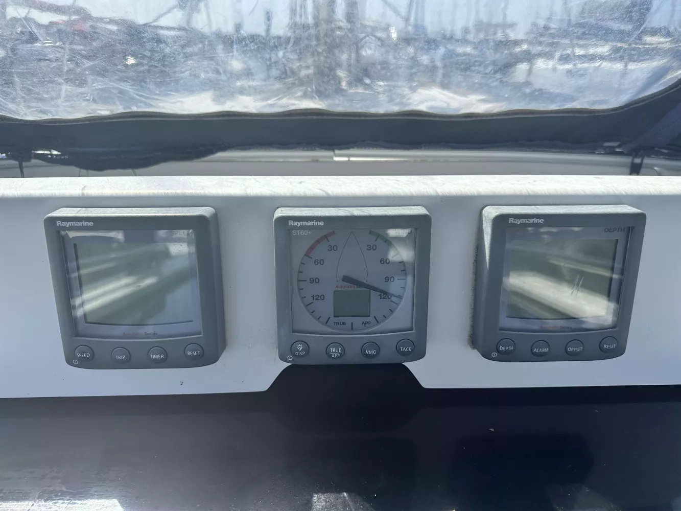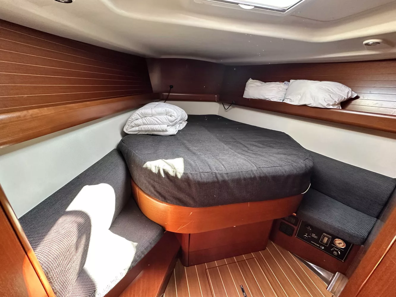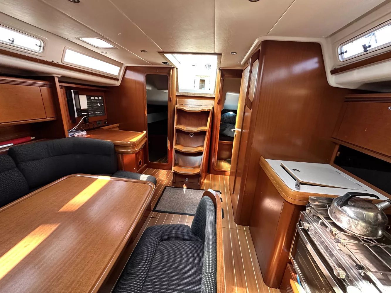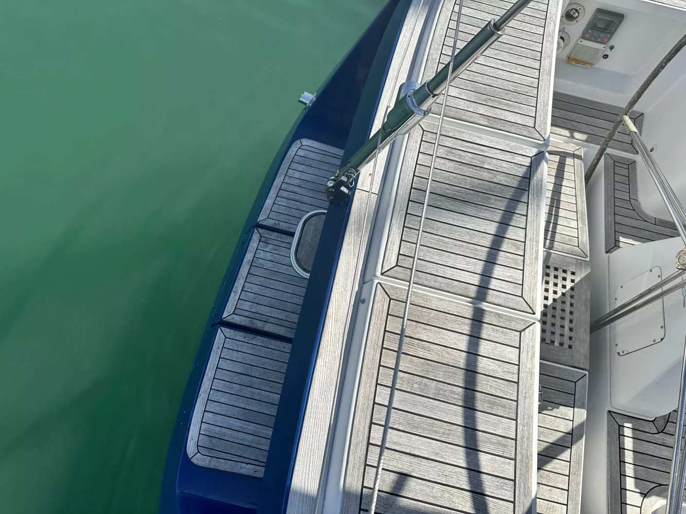 Peinture de coque refaite en 2016, moteur Volvo D2-55 CV 1000 h, joint de sail drive et coude d’échappement remplacés en 2023, vannes et passes-coques remplacés en 2024, toutes les batteries ont été changées en mars 2025, GV full batten North Sails, génois sur enrouleur All Purpose de 2021, Spi asymétrique incidence, lazy bag et lazy jack, hale-bas rigide, pataras réglable, 1 winch électrique, pont en teck, plateforme de bain avec échelle, capote de roof et bimini, guindeau électrique changé en 2015, douchette de cockpit eau chaude, chauffage à air pulsé, convertisseur 800 W 12/220 V, chauffe-eau, WC marin manuel, dessalinisateur à réviser, GPS Garmin Echomap UHD 72 CV au poste de barre (2022), loch/sondeur/speedo Raymarine ST60, girouette-anémomètre Raymarine ST60, pilote auto, radar Furuno 1623, VHF fixe Raymarine RAY54E, système audio Fusion MS-RA70, annexe 3D Tender Twin Vib Air 250 (2022).