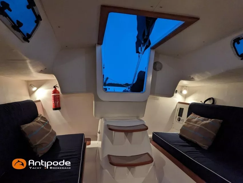 J 100, 2008, Volvo D1 13 B, 12 cv (195.8 h), Aménagement 2 couchages banquettes carré et 1 lit dans pointe avant , 1 WC marin + évier, Option balcon avant chandeliers et filières, Passavants teck, Fond de cockpit latté teck, Taud d'hivernage avec aérateurs, Mât carbone implanté sur la quille, bome aluminium, Grand-voile classique - BX Incidences 2020, Rail de guindant de grand voile + chariots de lattes, Enrouleur de génois avec tambour sur le pont - Harken, Génois sur enrouleur - BX Incidences 2020, Spinnaker asymétrique - Europ Sails, Pataras avec vérin hydraulique (en cours de révision), Pilote automatique de barre franche - Raymarine ST 1000 2018 (connectiques refaites en 2024), Centrale de navigation - Tacktick, Pack Girouette anémomètre - Tacktick, 2 répétiteurs pieds de mât - Tacktick, 1 commande à distance pour contrôle répétiteutrs pied de mât - Tacktick, Glacière portative IGLOO, Prise de quai 220 V + chargeur de batteries, Batterie moteur, Batteries service, Pompe à main eau douce, Pas d'équipement de sécurité, Annexe , Visible Bretagne. Pour plus d'informations ou pour fixer un rendez-vous de visite, contact : Jean-Baptiste Lemaire 06 10 25 00 03 - jb@antipode-yachts.com