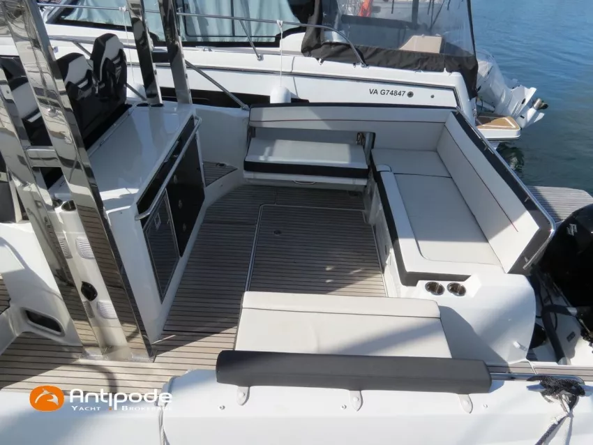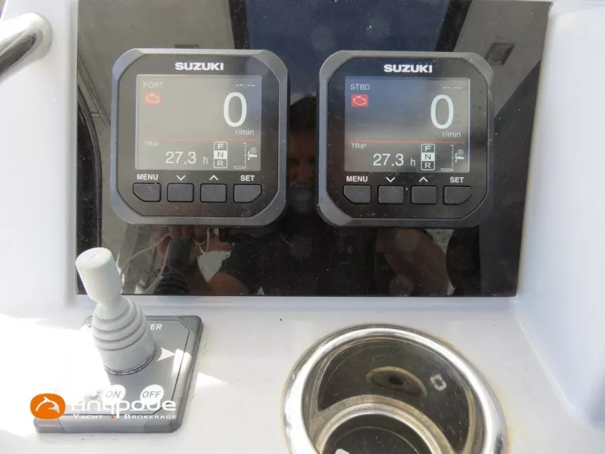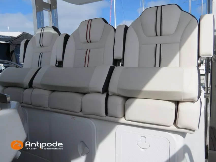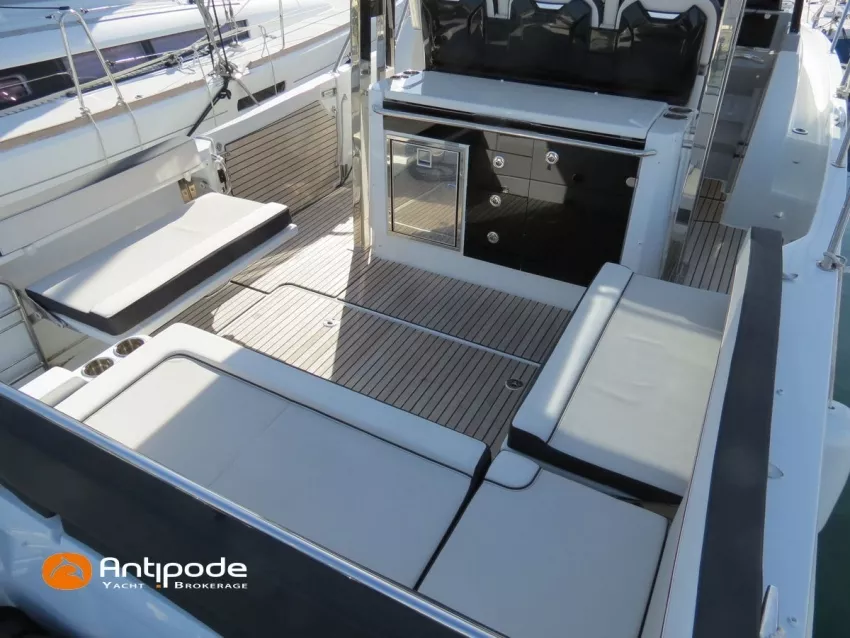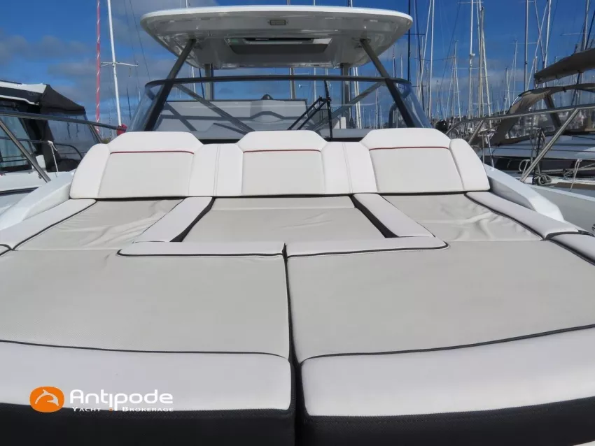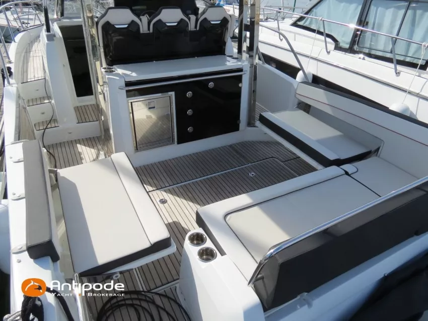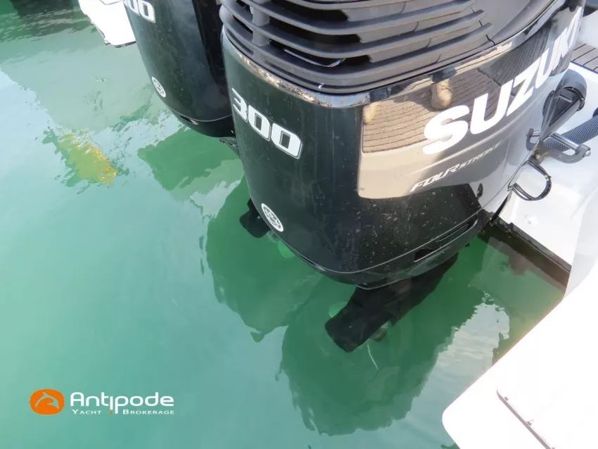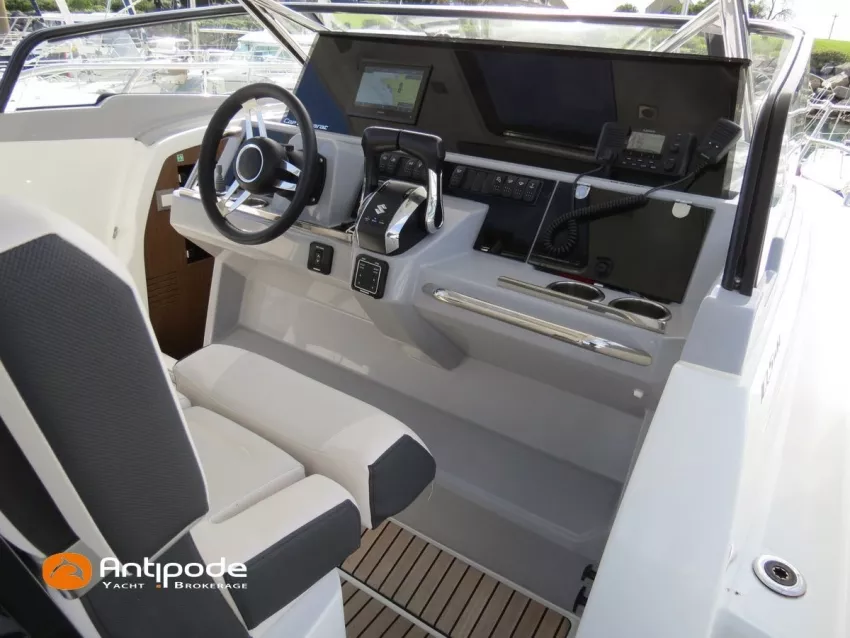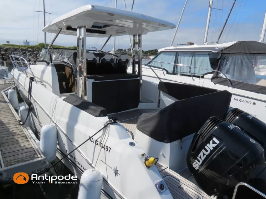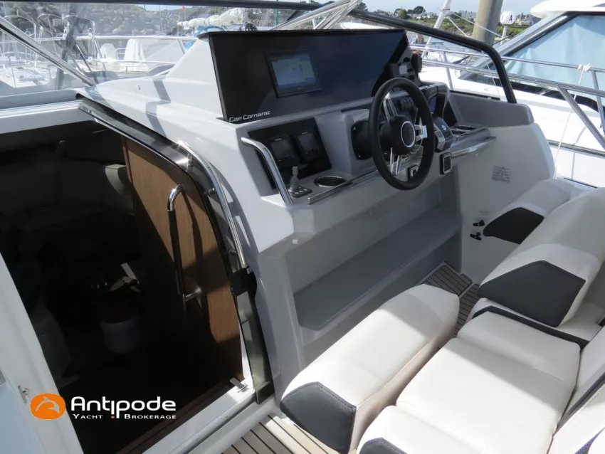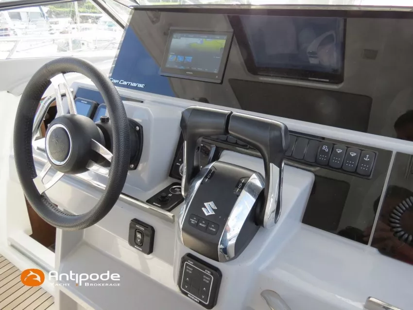CAP CAMARAT 10.5 WA, 2024, 1ère main, SUZUKI DF300 AP (x2), 2x300 cv (27 h), Propulseur d'étrave, Version S2, Version avec cabine arrière fermée par une porte, Finition Première Silvertex Ice, Selleries carré et cabine PVC Marlin Pure White, Table de carré convertible en couchette double, Moustiquaires de hublots et panneaux de pont, Banquette latérale repliable à babord, Fond de cockpit latté teck, Jupes arrières lattées teck, T-Top cockpit, Selleries de cockpit + taud, Coussins bains de soleil avant + taud, Commande guindeau au poste de pilotage, Plateforme latérale, Mat de ski, Taud de console de cuisine cockpit, Taud de pupitre poste de pilotage, Flaps automatiques Zipwake, GPS / lecteur de carte au poste de pilotage - Garmin GPS Map 923xsv, Cartographie électronique, VHF ASN - Garmin VHF 100, Unité réfrigérante 12 V avec freezer - porte frontale - 80 L, 2 ème unité réfrigérante dans le cockpit - 49 L, Chauffe-eau 220 V, Gazinière 2 feux, Gazinière 1 feu (console cockpit), Lavabo et eau chaude / eau froide dans le cockpit, Four à micro-ondes, Prise de quai 220 V + chargeur de batteries, Prises intérieures 12 & 220 V, Réservoir rigide eaux noires (80 litres), WC électrique, Douchette de cockpit eau chaude / eau froide, Essuie glace et lave glace, Feux de navigations à Leds, Eclairages ambiance intérieurs et exterieur à Leds, Mouillage principal, Amarres et défenses, Visible Bretagne. Pour plus d'informations ou pour fixer un rendez-vous de visite, contact : Jean-Baptiste Lemaire 06 10 25 00 03 - jb@antipode-yachts.com