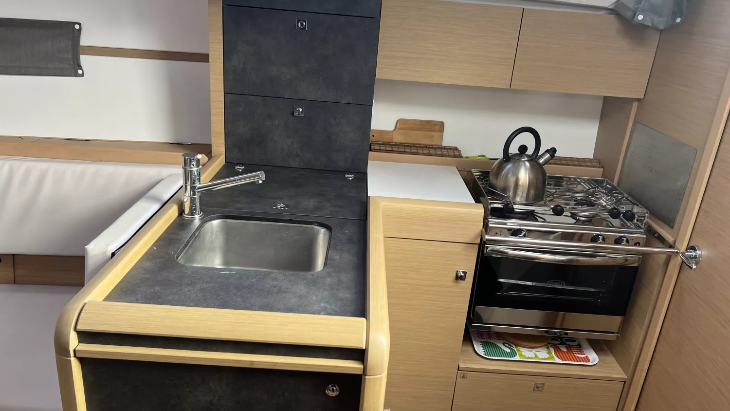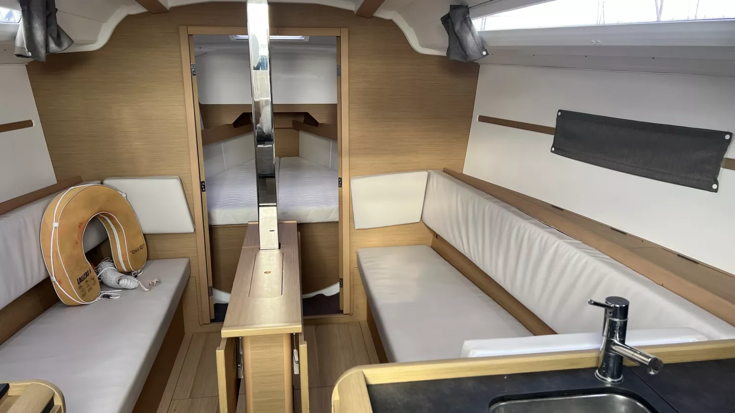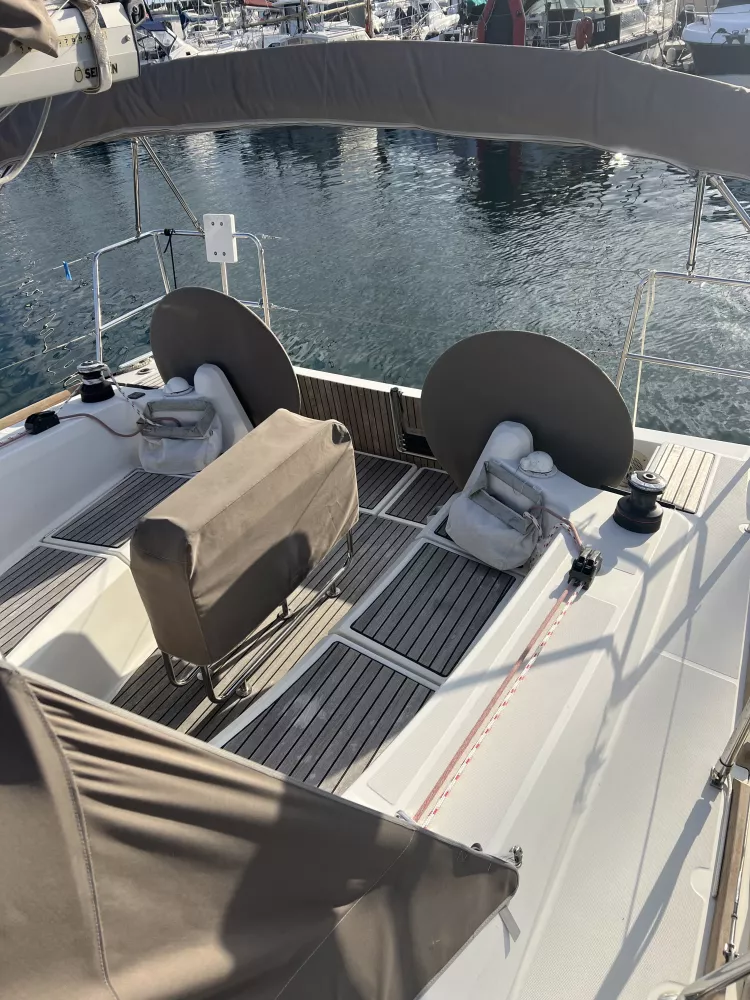 Feux de navigation, Échelle de bain, Table de cockpit en teck, Cockpit teck, Plateforme de bain en teck, Guindeau électrique.