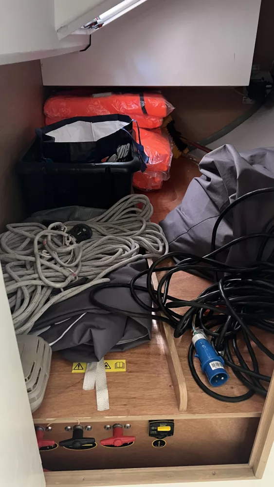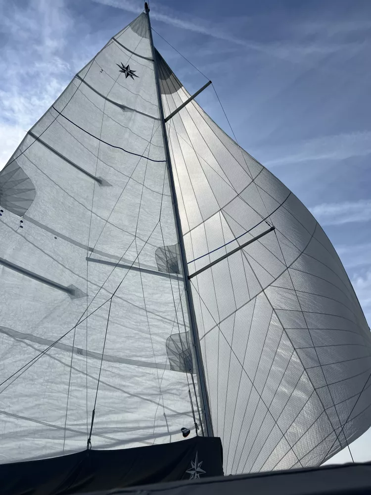 grand voile, enrouleur de génois + code 0 + Bimini top + capote de descente + taud de barre a roue + taud de table cockpite.