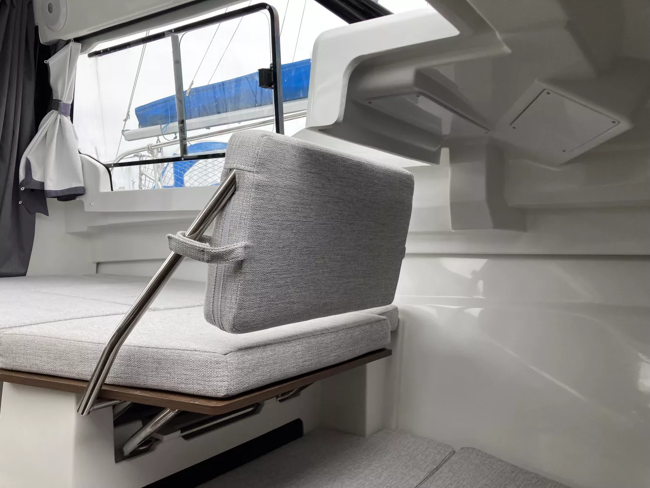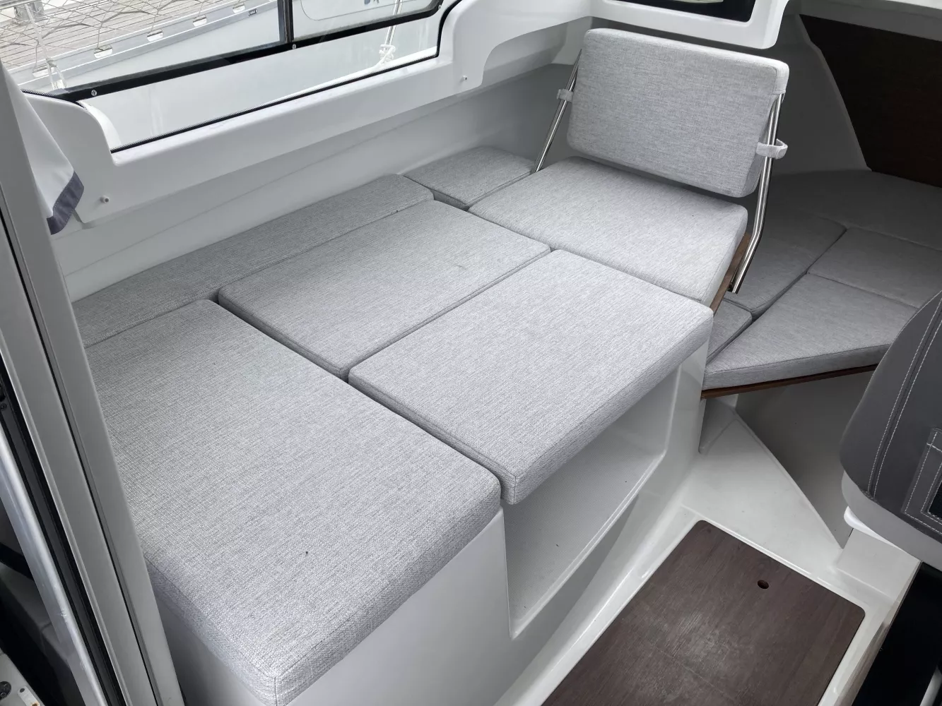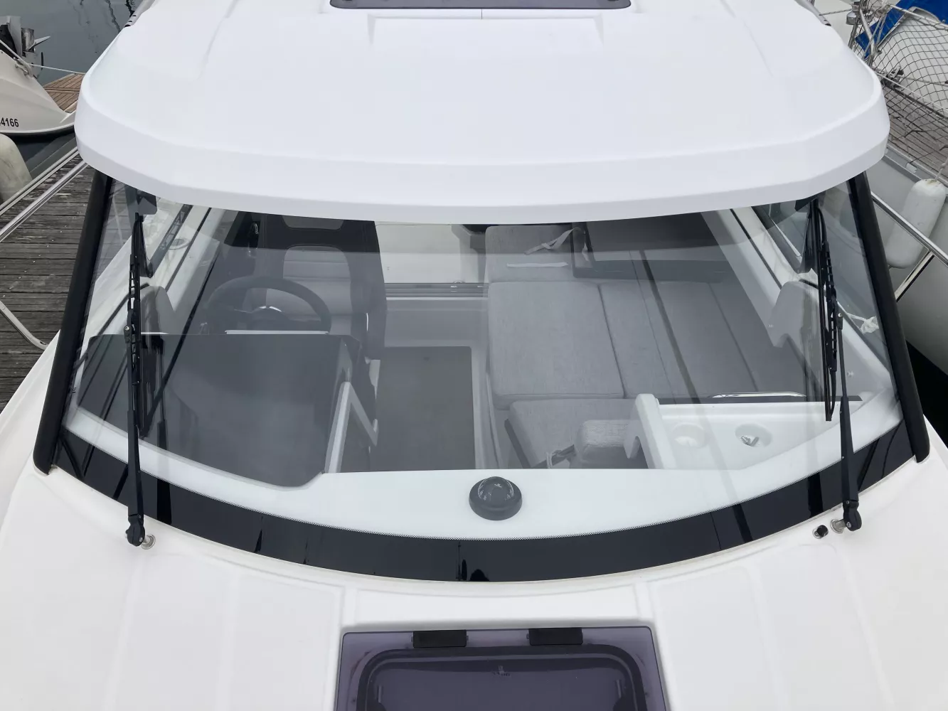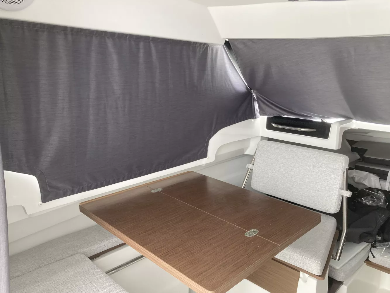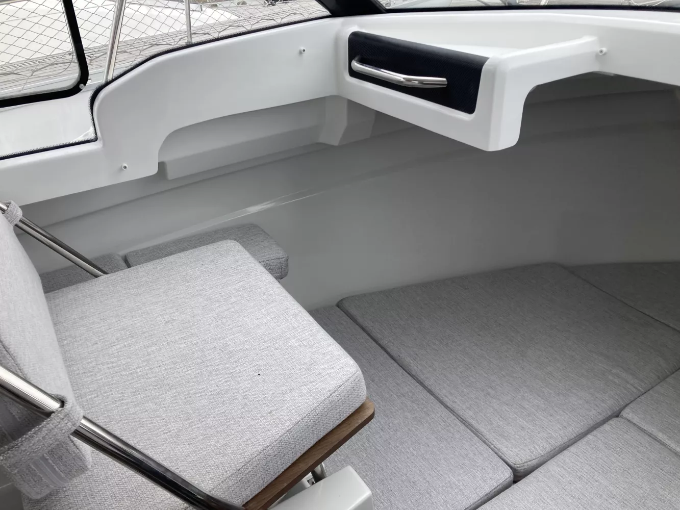 Version avec compartiment fermé et hublot avant // Finition Première // Pack électronique GARMIN // Pack audio FUSION RA70N // Guindeau électrique // Carré de cockpit en U transformable en bain de soleil // Taud de soleil de cockpit // Plateformes de bain // Propulseur d’étrave // Pack circuit eau douce // Cuisine luxe // Réchaud gaz // Couchage carré + cabine // Rideaux intérieurs de timonerie // WC marin avec réservoir à eaux noires // Circuit lave-glaces.