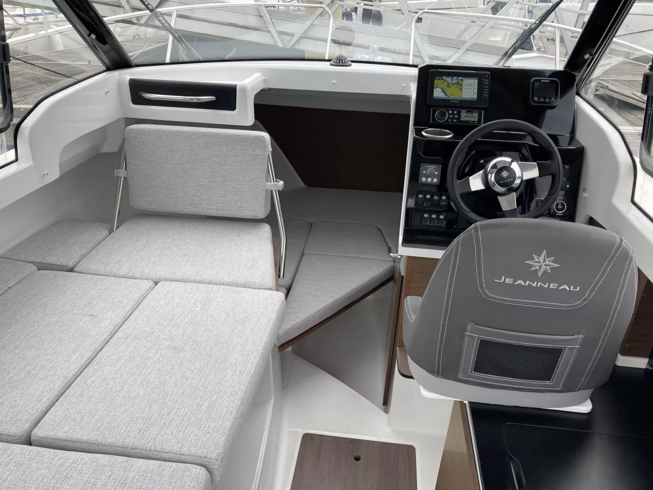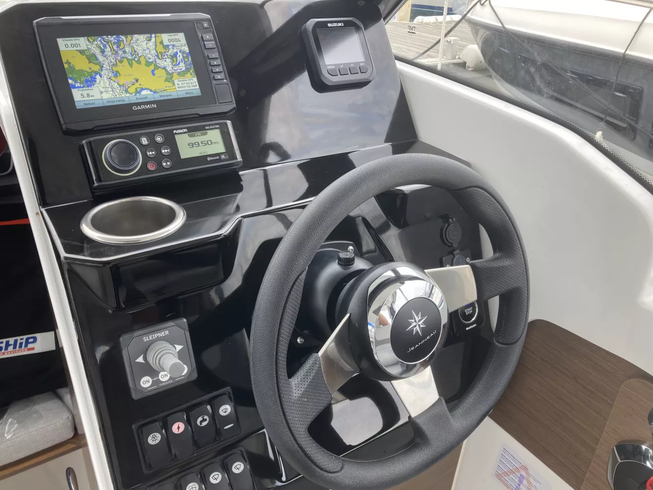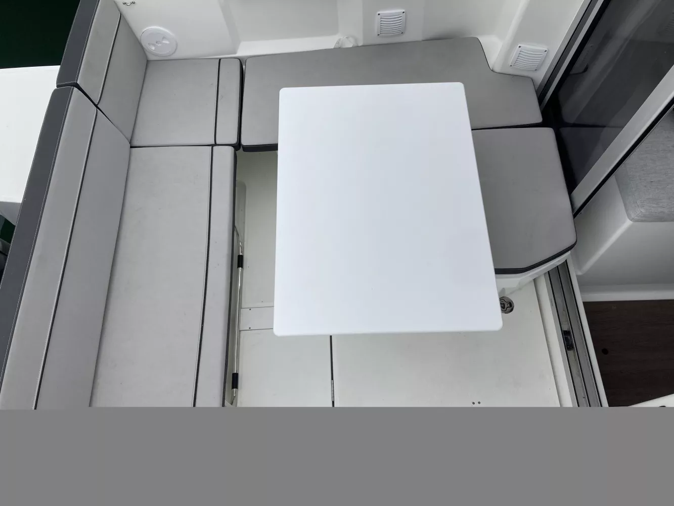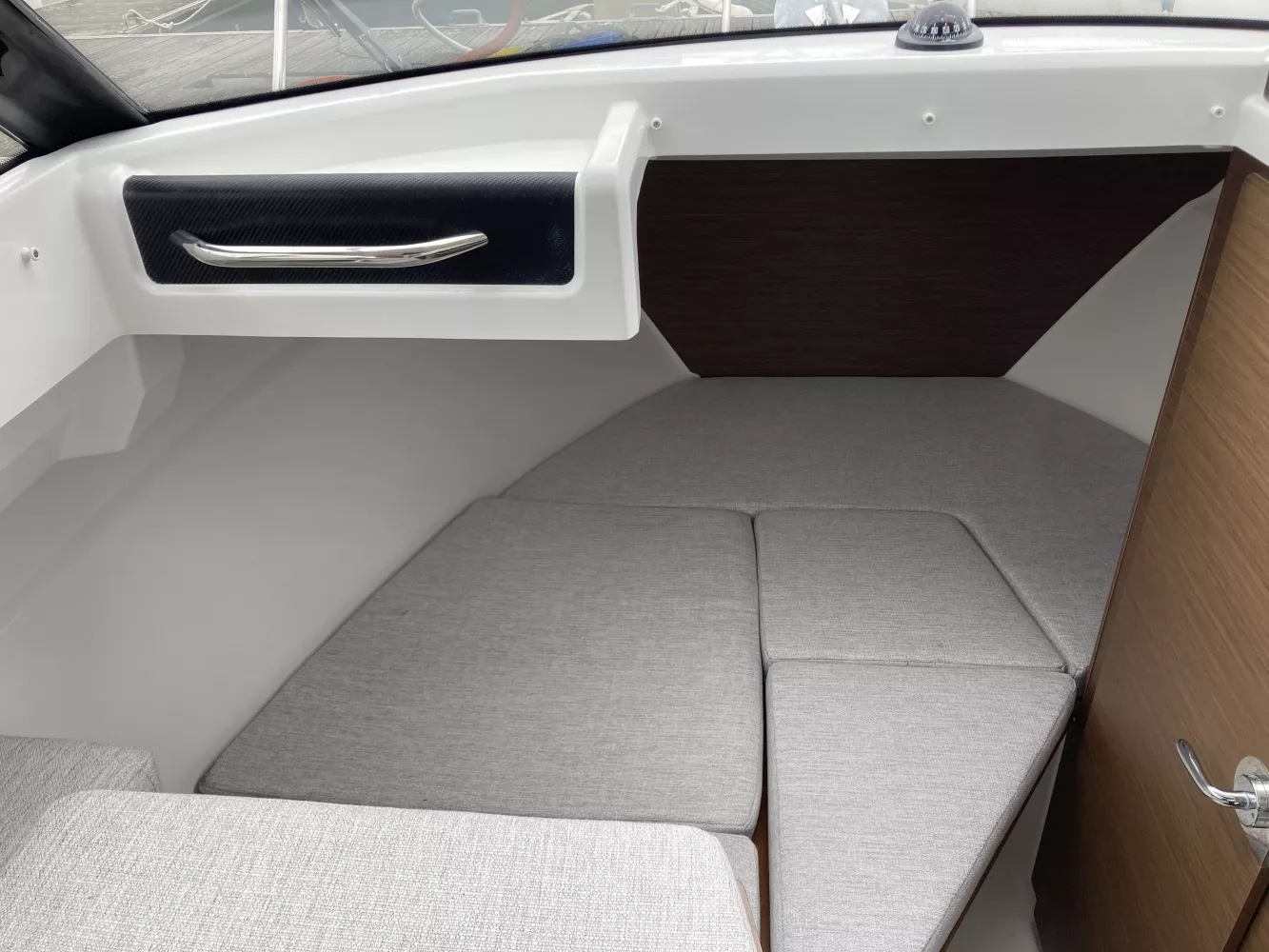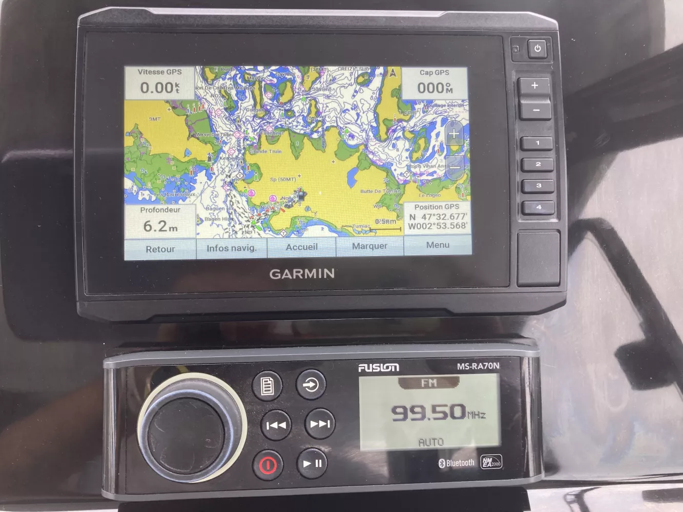 Version avec compartiment fermé et hublot avant // Finition Première // Pack électronique GARMIN // Pack audio FUSION RA70N // Guindeau électrique // Carré de cockpit en U transformable en bain de soleil // Taud de soleil de cockpit // Plateformes de bain // Propulseur d’étrave // Pack circuit eau douce // Cuisine luxe // Réchaud gaz // Couchage carré + cabine // Rideaux intérieurs de timonerie // WC marin avec réservoir à eaux noires // Circuit lave-glaces.