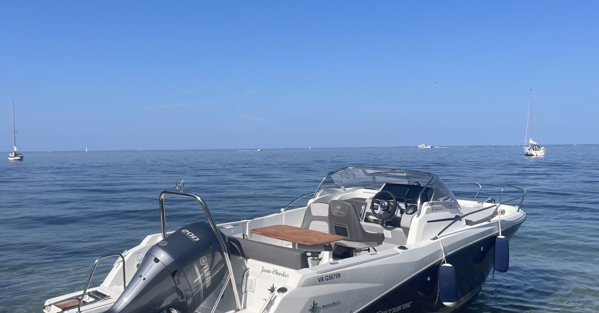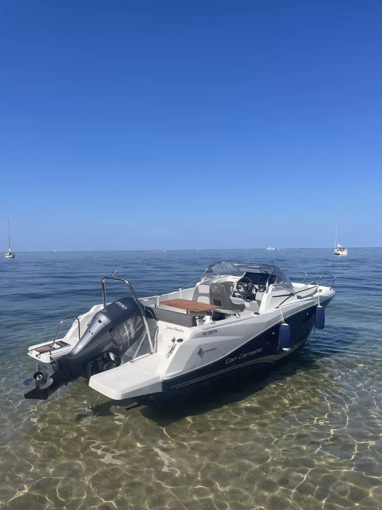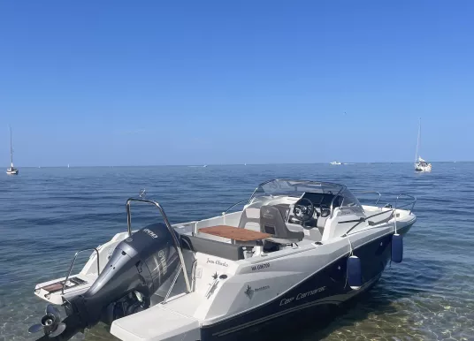 Bateau et moteur de 2023 en très bon état avec 118h, entretenu et hiverné chaque saison par professionnel. Finition première Equipé avec une banquette arrière + dossier, deux banquettes latérales avec coussins, table de cockpit luxe en bois, bain de soleil avant et coussin de cabine pour couchage double. Plateformes de bain en polyester, mat de ski (arche), guindeau électrique, douchette de cockpit, pack électronique Garmin échomap 92sv, commande moteur manette électrique, écran tactile CL5, clef sans contact EKS avec anti-démarrage. Kit amarrage, kit mouillage et armement de sécurité côtier.