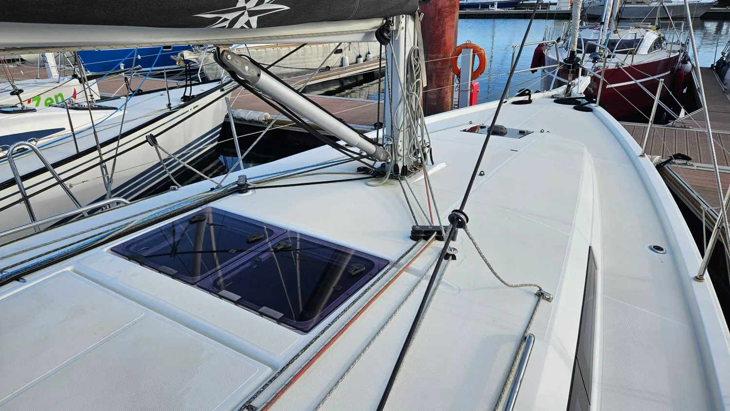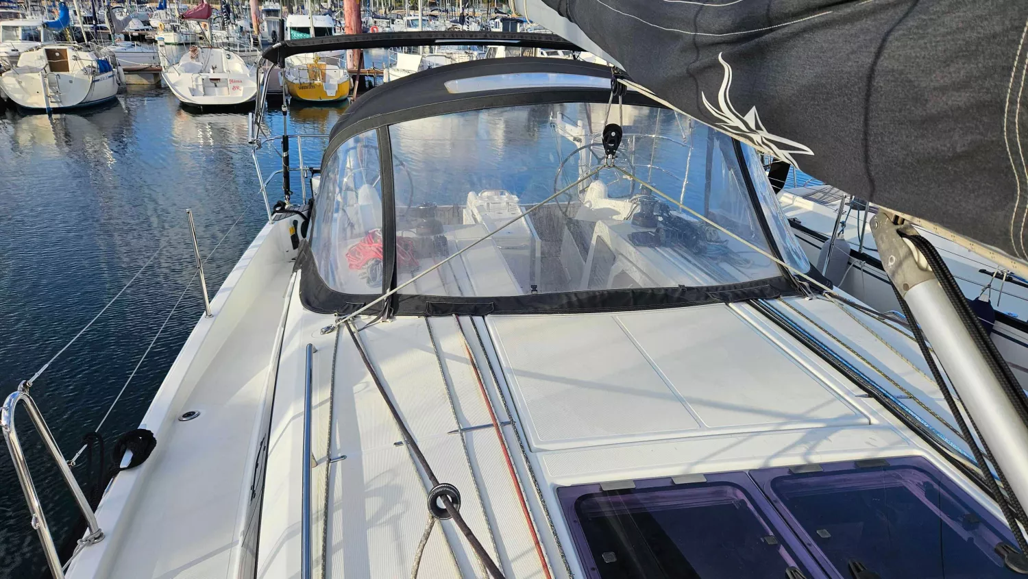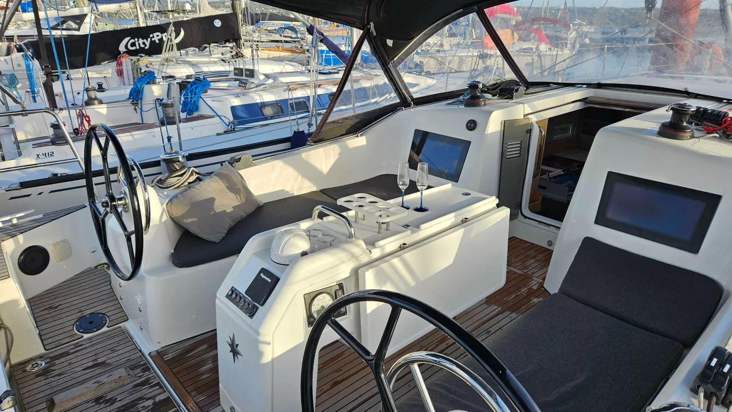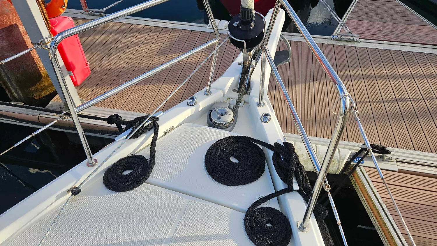 Capote de roof haute transparence avec lampe a led (gris anthracite), Chauffage air pulsé (fuel), Fond de cockpit teck + assises, Hélice 3 pales repliable, Housses barres à roue (gris anthracite), Housse table cockpit (gris anthracite), Pack Cruising