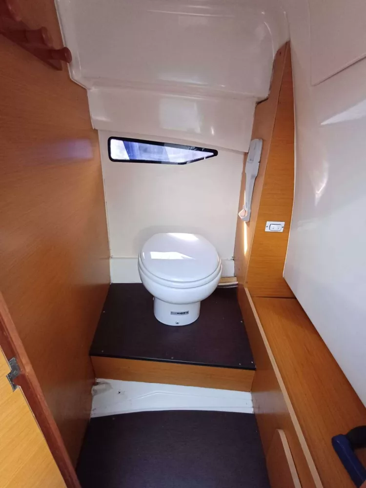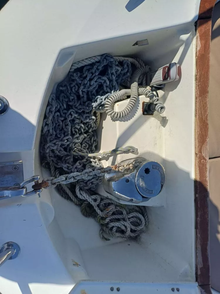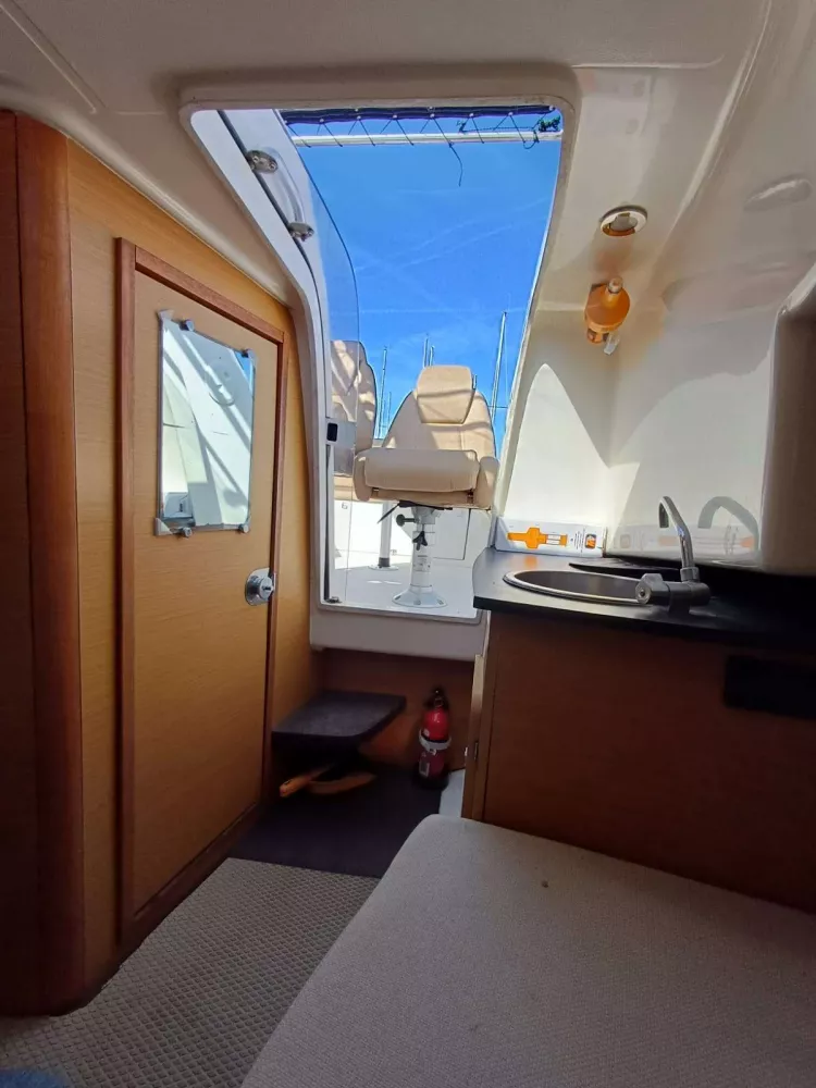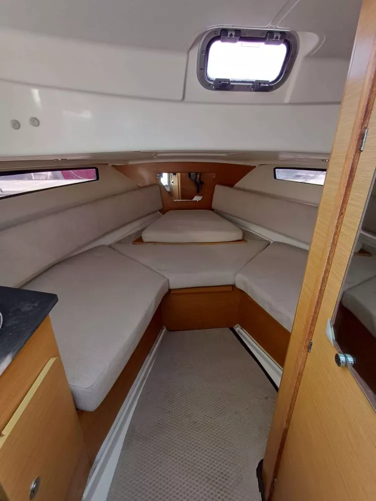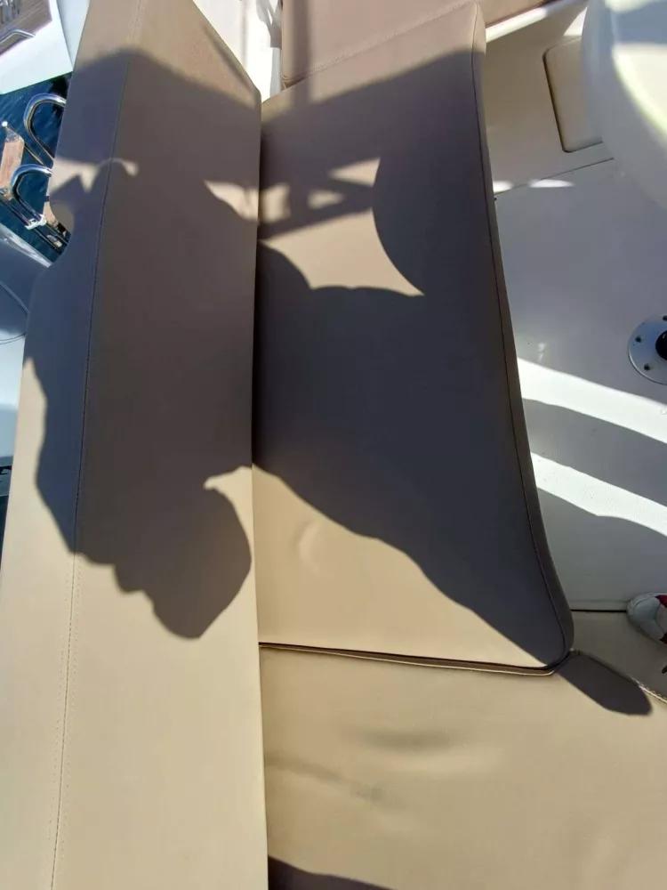 *Équipements extérieurs : Banquette bâbord rétractable, coussins de bain de soleil avant, coussins de cockpit arrière + dossier, bimini, échelle de bain, table de cockpit amovible à l'arrière, nombreux rangements, 2 sièges bolster amovibles, 2 porte-cannes, douchette de cockpit avec eau sous pression (50L), T-TOP.