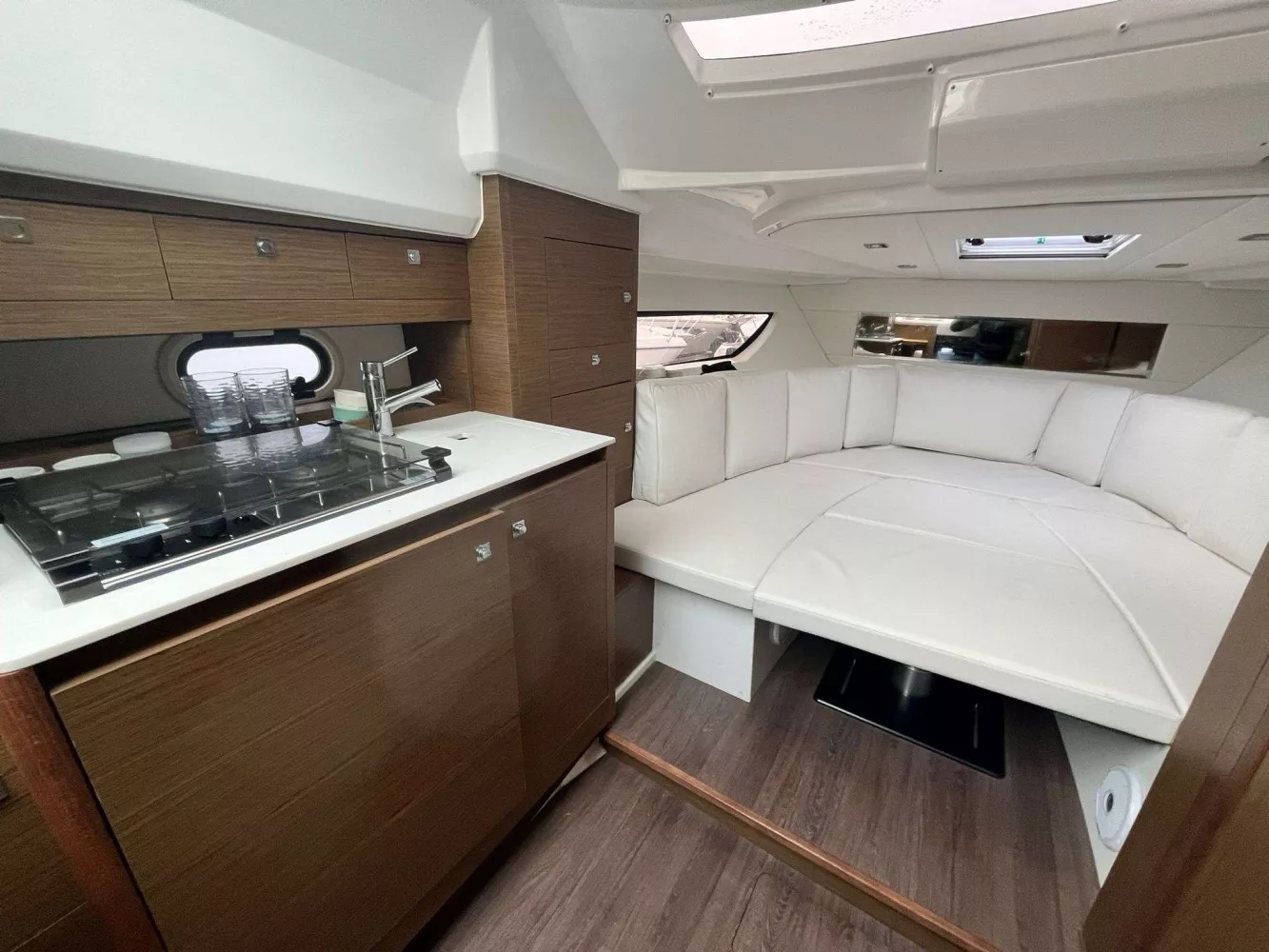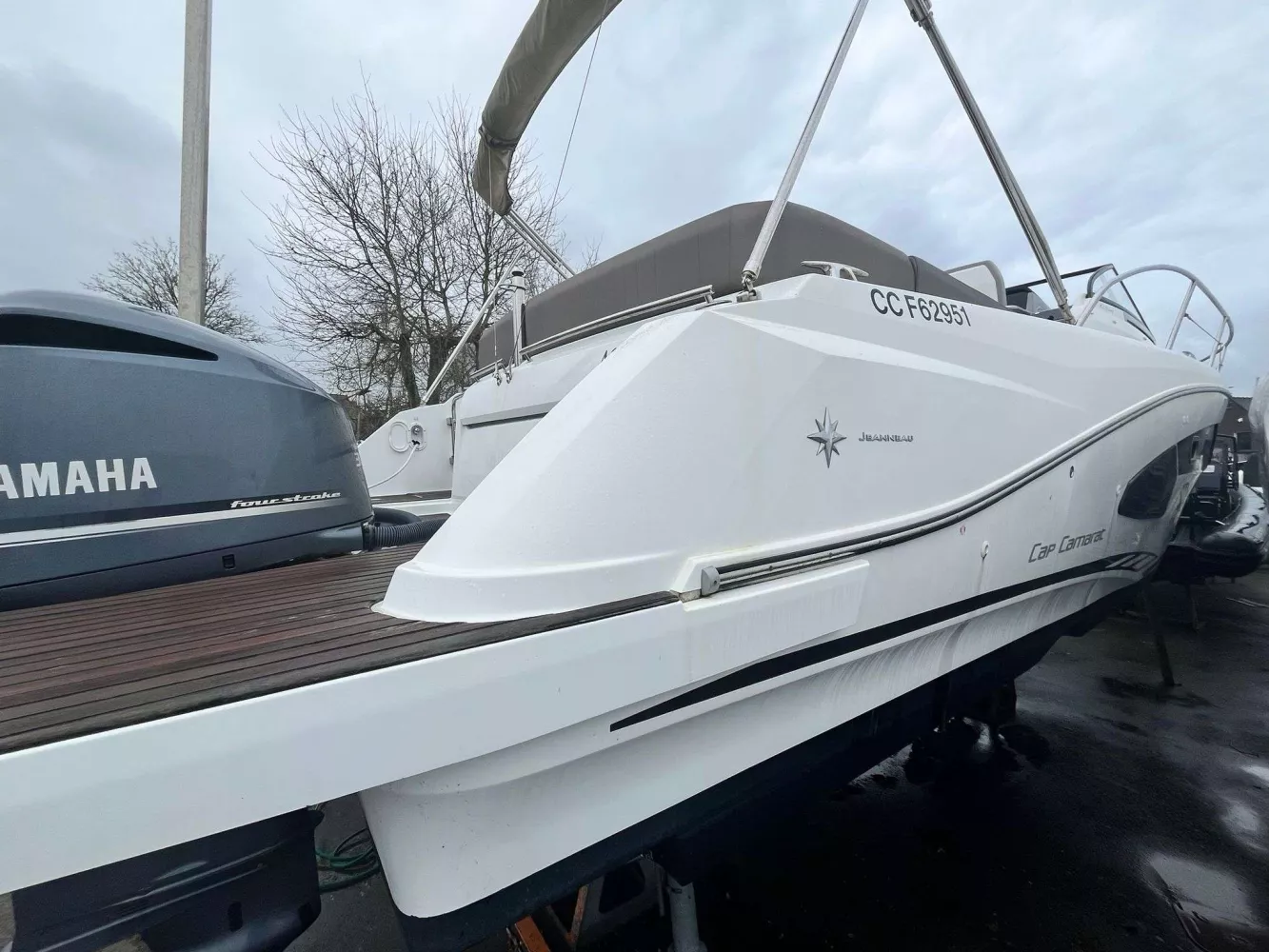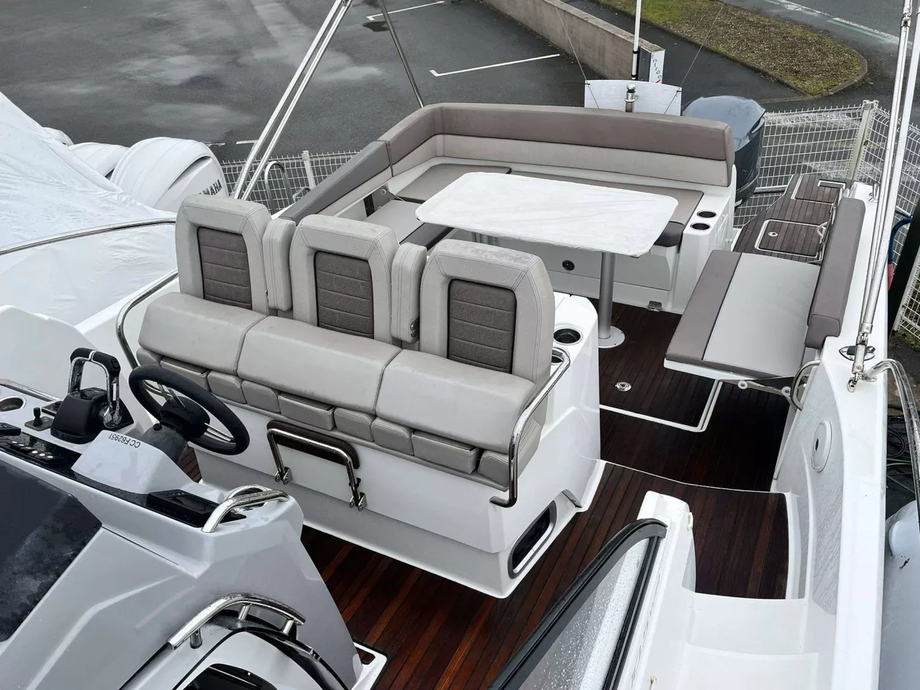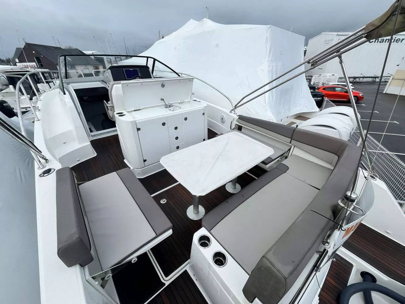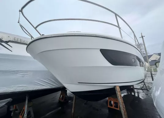 • FINITION PREMIERE incluant : Guindeau électrique, eclairage int/ext led, chargeur de quai + prise 220v, chauffe eau, flaps électriques, frigo intérieur 80L