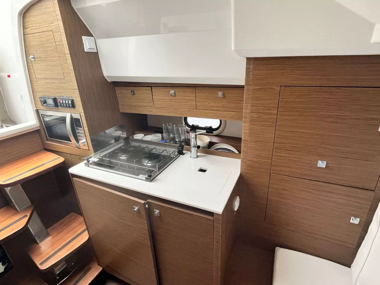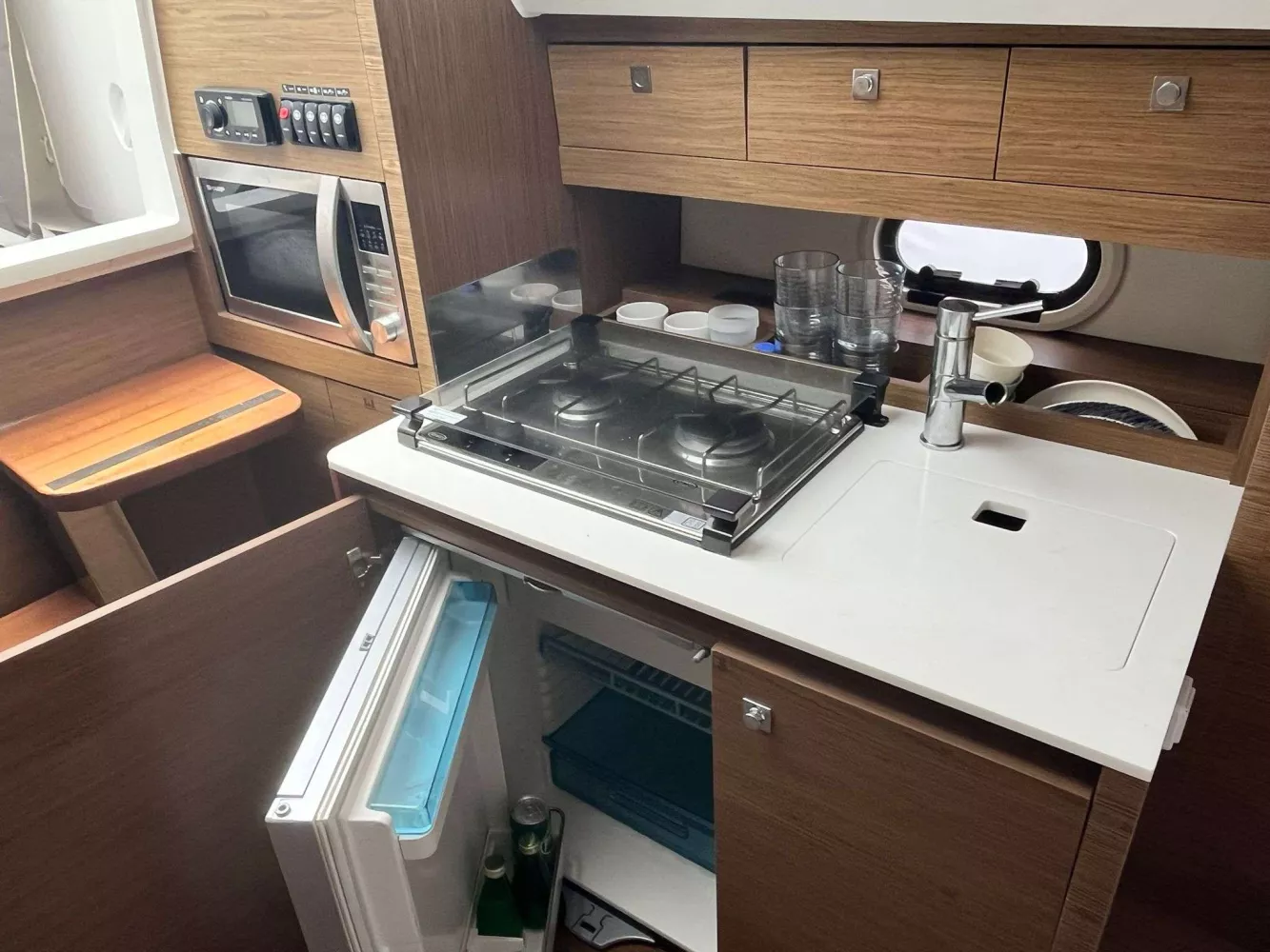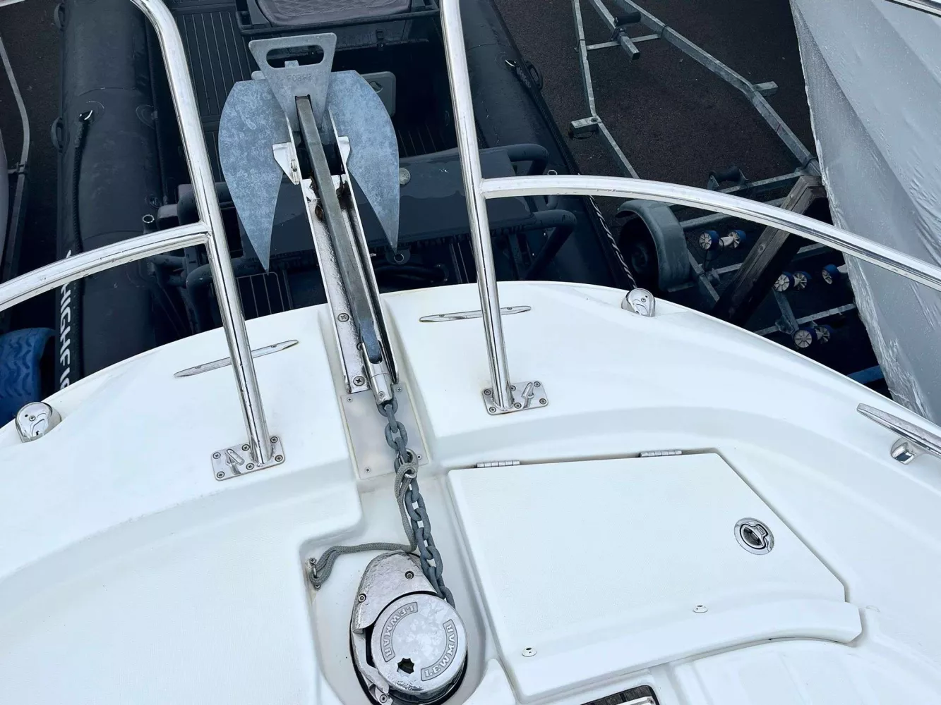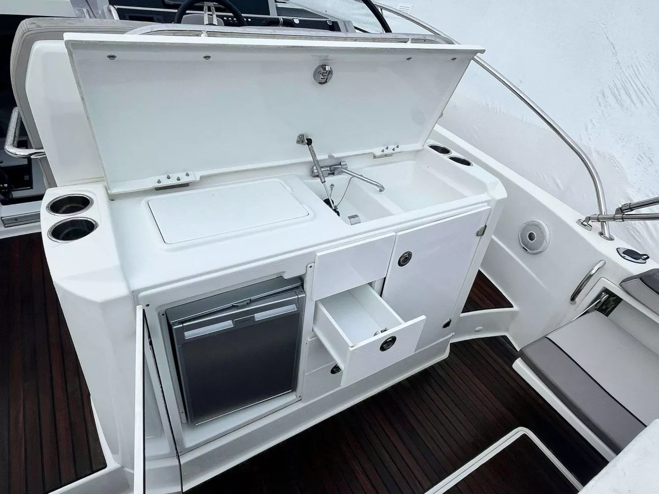 • FINITION PREMIERE incluant : Guindeau électrique, eclairage int/ext led, chargeur de quai + prise 220v, chauffe eau, flaps électriques, frigo intérieur 80L