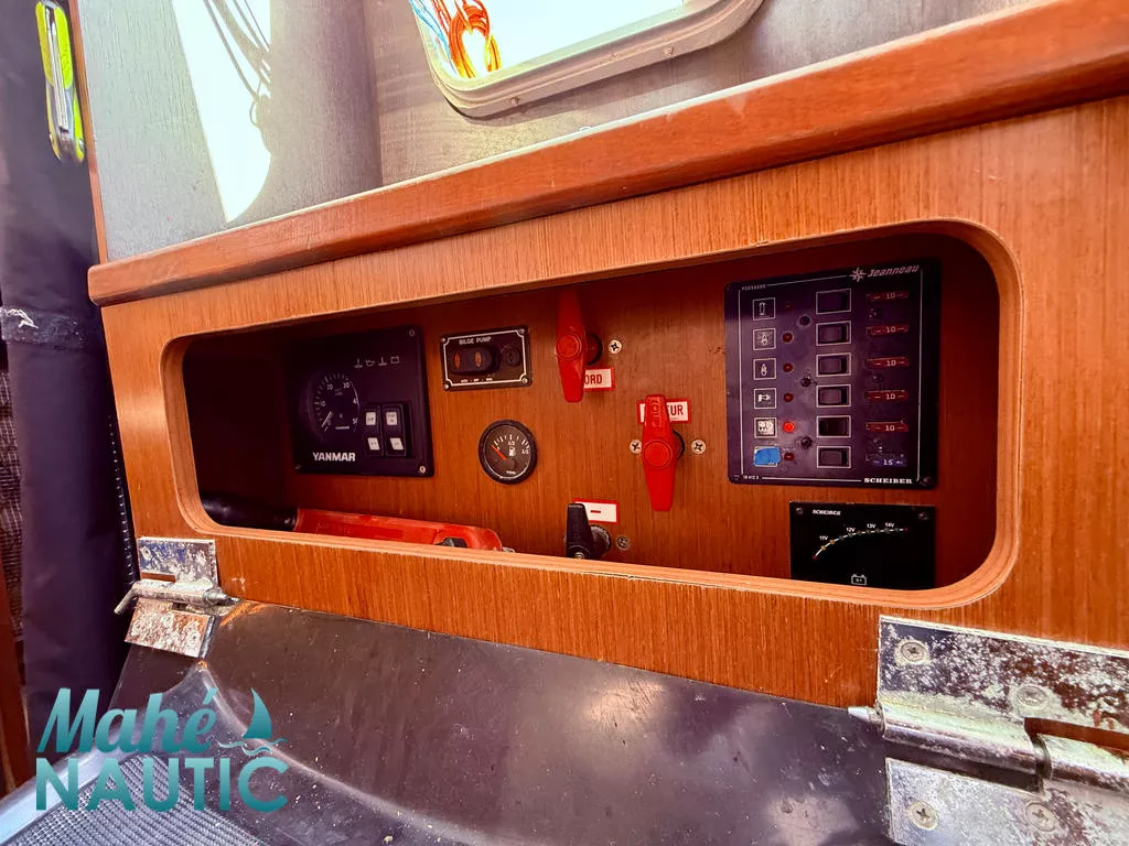 pompe à pied eau de mer, réchaud 2 feux, glacière 60L, rangements), 1 coin navigateur