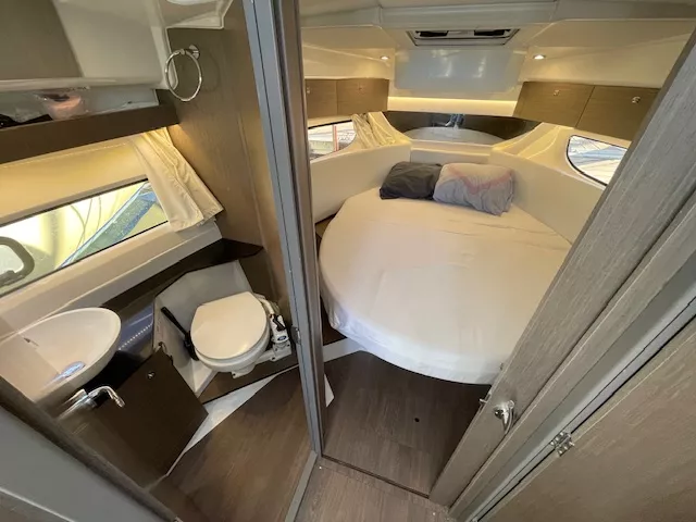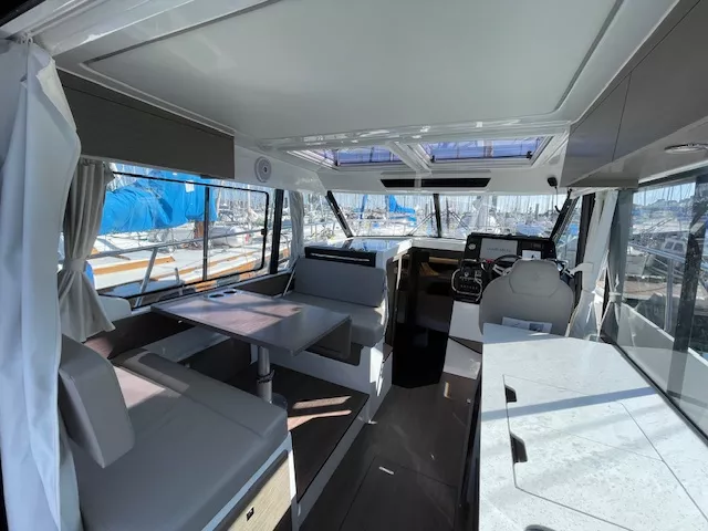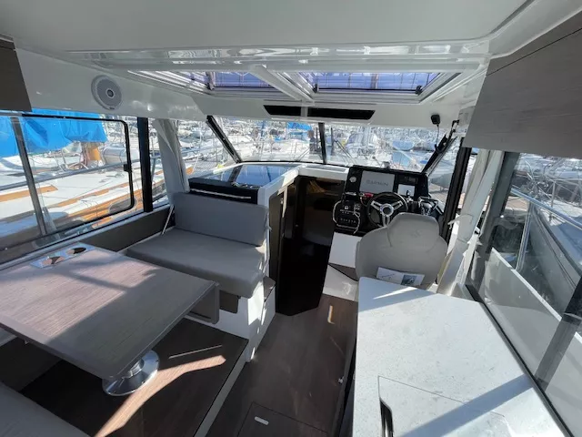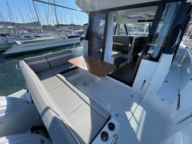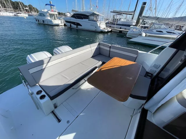 OPTIONS : CARRE DE COCKPIT EN U AVEC TABLE + BAIN DE SOLEIL- CASQUETTE DE COCKPIT - FERMETURE ARRIERE DE COCKPIT - ECHELLE POUR COFFRE DE COCKPIT - GALERIE DE RANGEMENT POUR STAND UP PADDLE SUR LE TOIT - TABLE DE COCKPIT BOIS - BAIN DE SOLEIL AVANT AVEC DOSSIERS RELEVABLES - CHAUFFAGE FUEL A CIRCULATION D’EAU AVEC PRODUCTION EAU CHAUDE