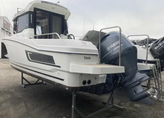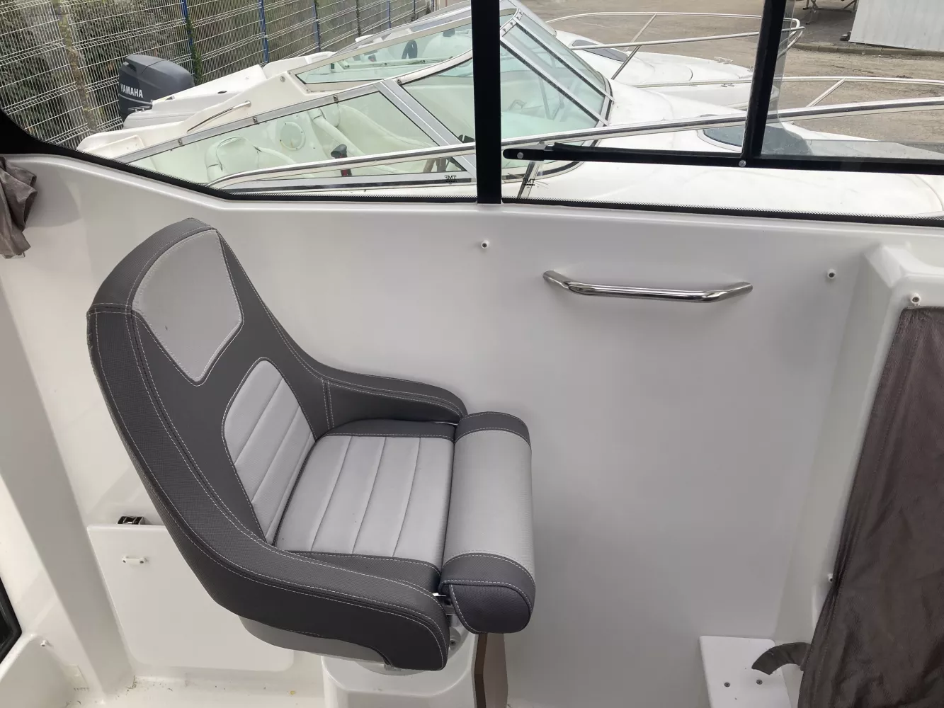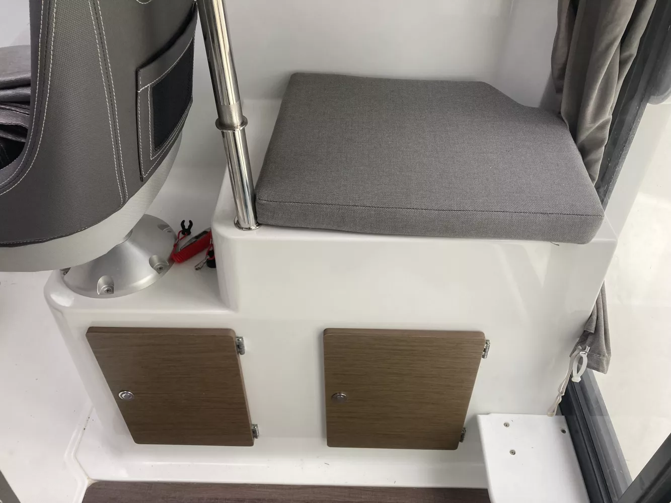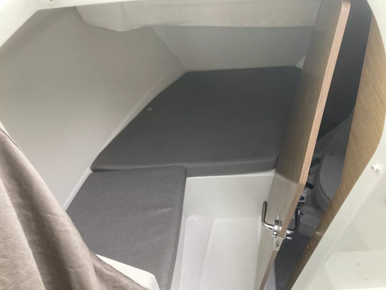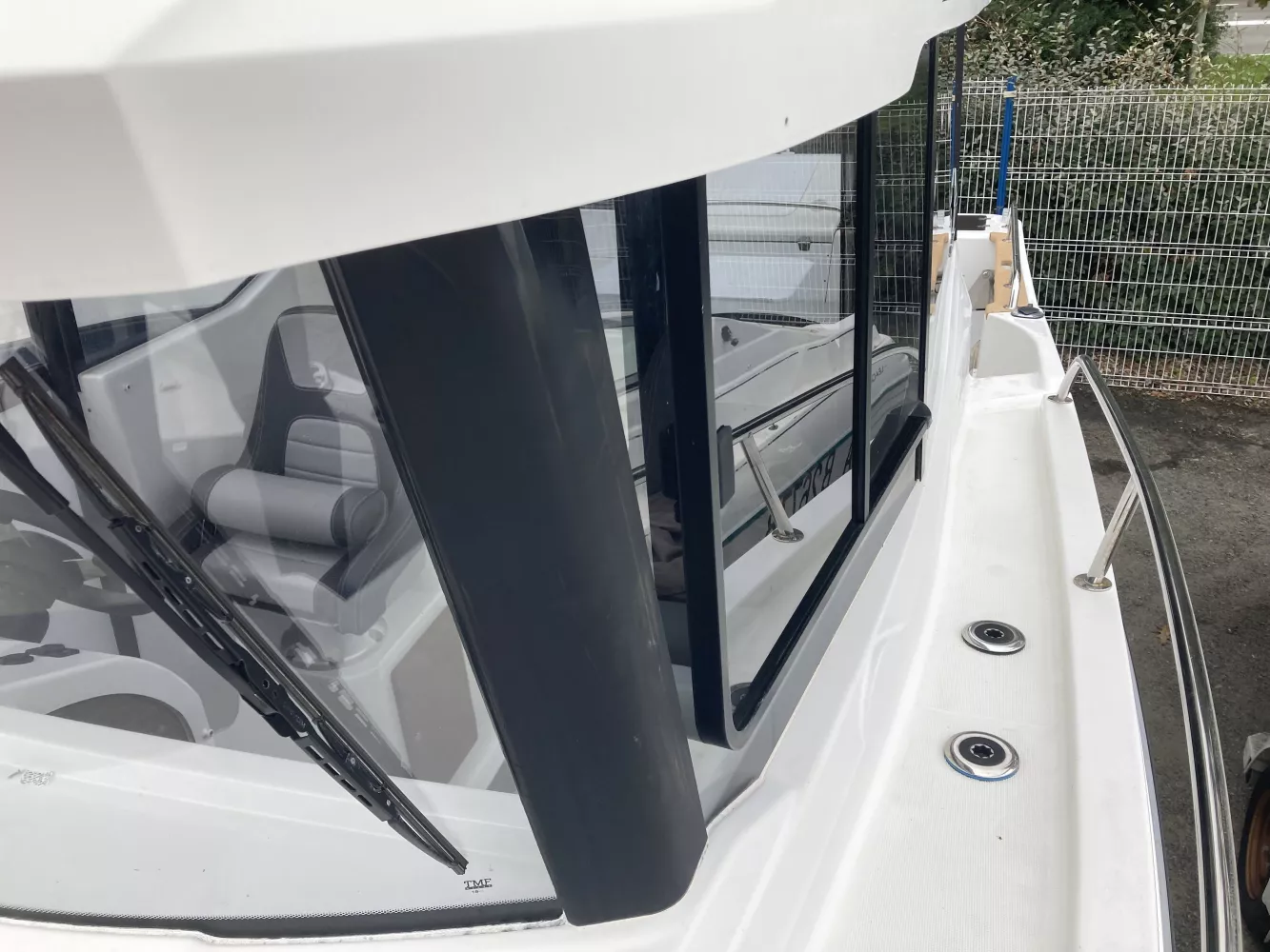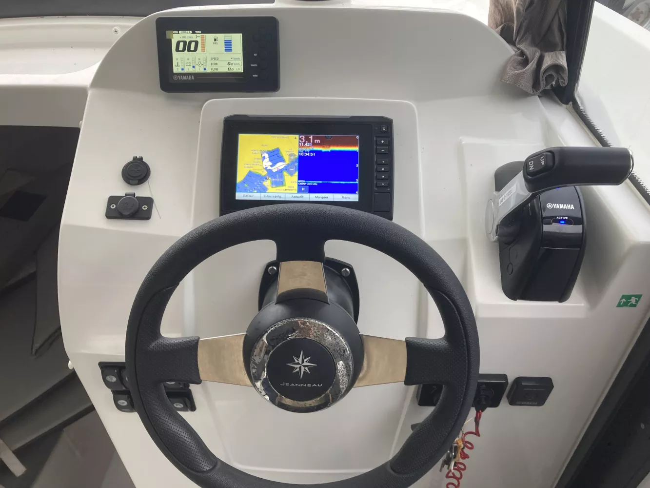 Équipements : Version avec double commande déportée dans le cockpit // Compartiment fermé et hubot ouvrant // Finition Première // Pack électronique GARMIN 7" // Guindeau électrique // Plateformes de bain lattées teck // Banquette latérale repliable luxe // Pack circuit eau douce // Kit peche // Vivier avec prise d'eau de mer // Table de cockpit // Coussins de cockpit avant et arrière // Douchette de cockpit // Rideaux intérieurs de timonerie // WC marin avec réservoir à eaux noires // Armement de sécurité cotier // Kit amarrage // Kit mouillage.