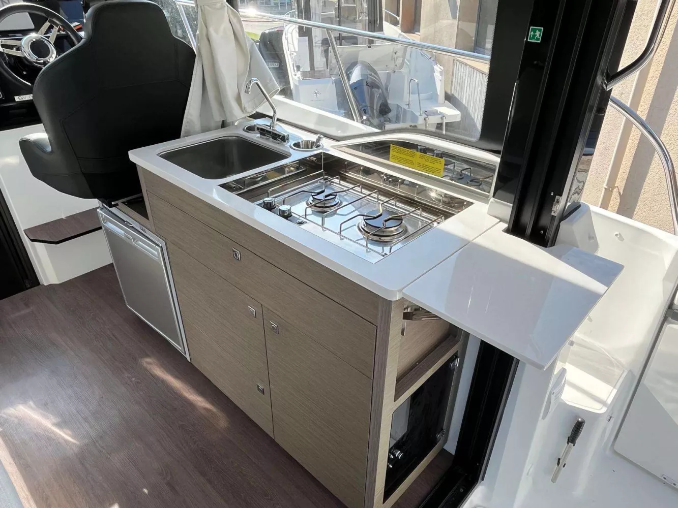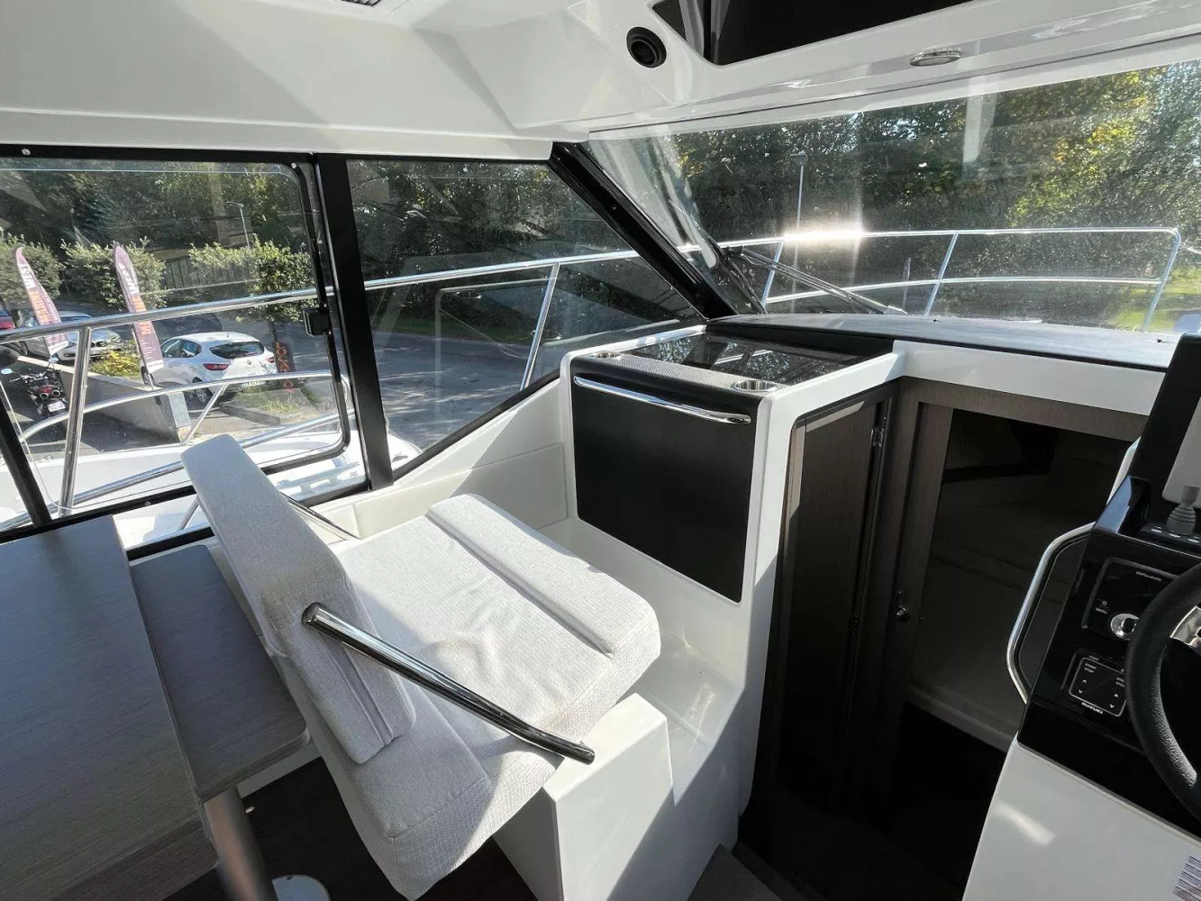 • PACK CONFORT Comprenant : Propulseur d’étrave, Commande guindeau au poste de pilotage, Plan de travail en corian, Prise de quai 220V + chargeur + chauffe eau, WC électrique eau douce,