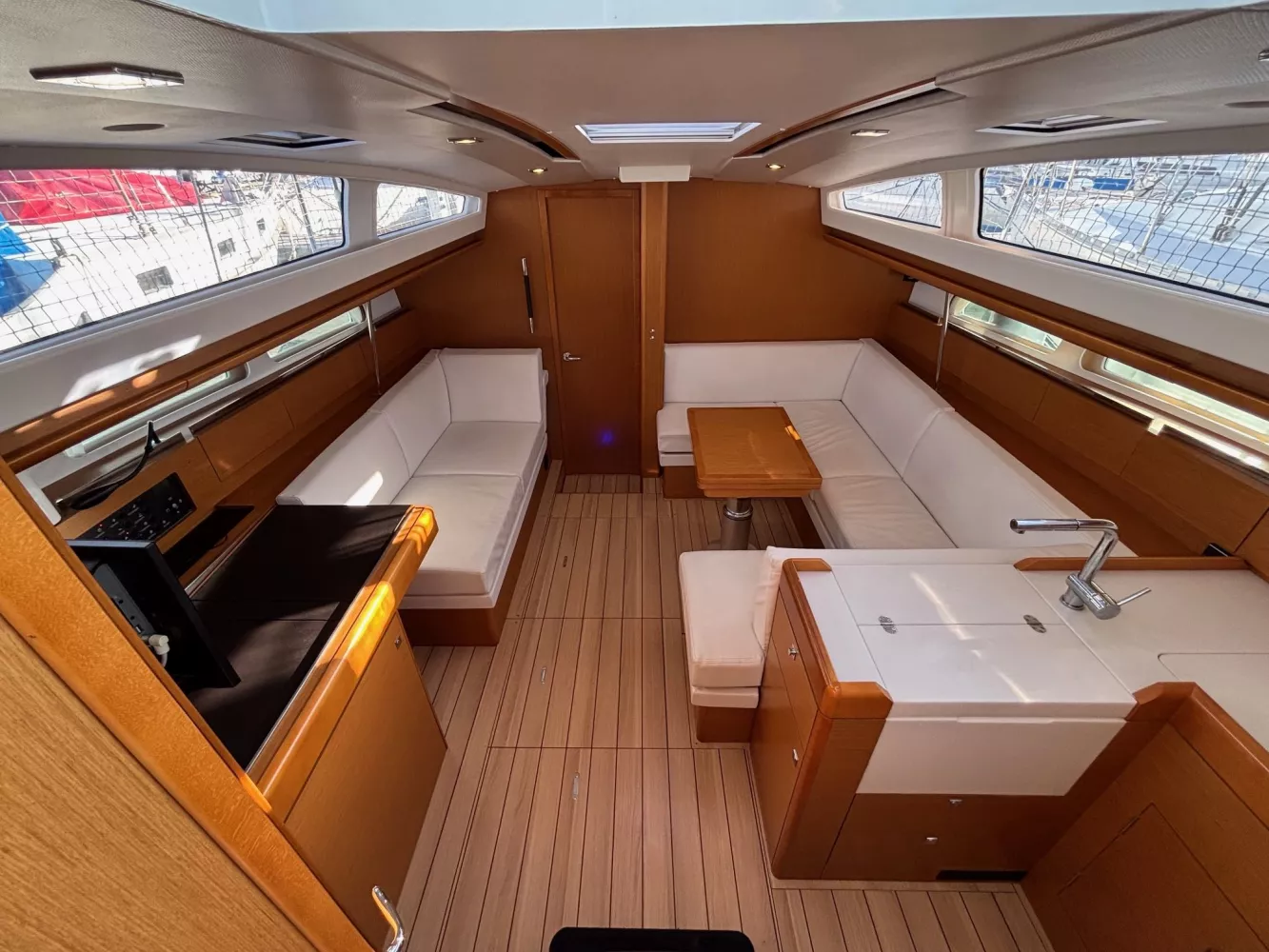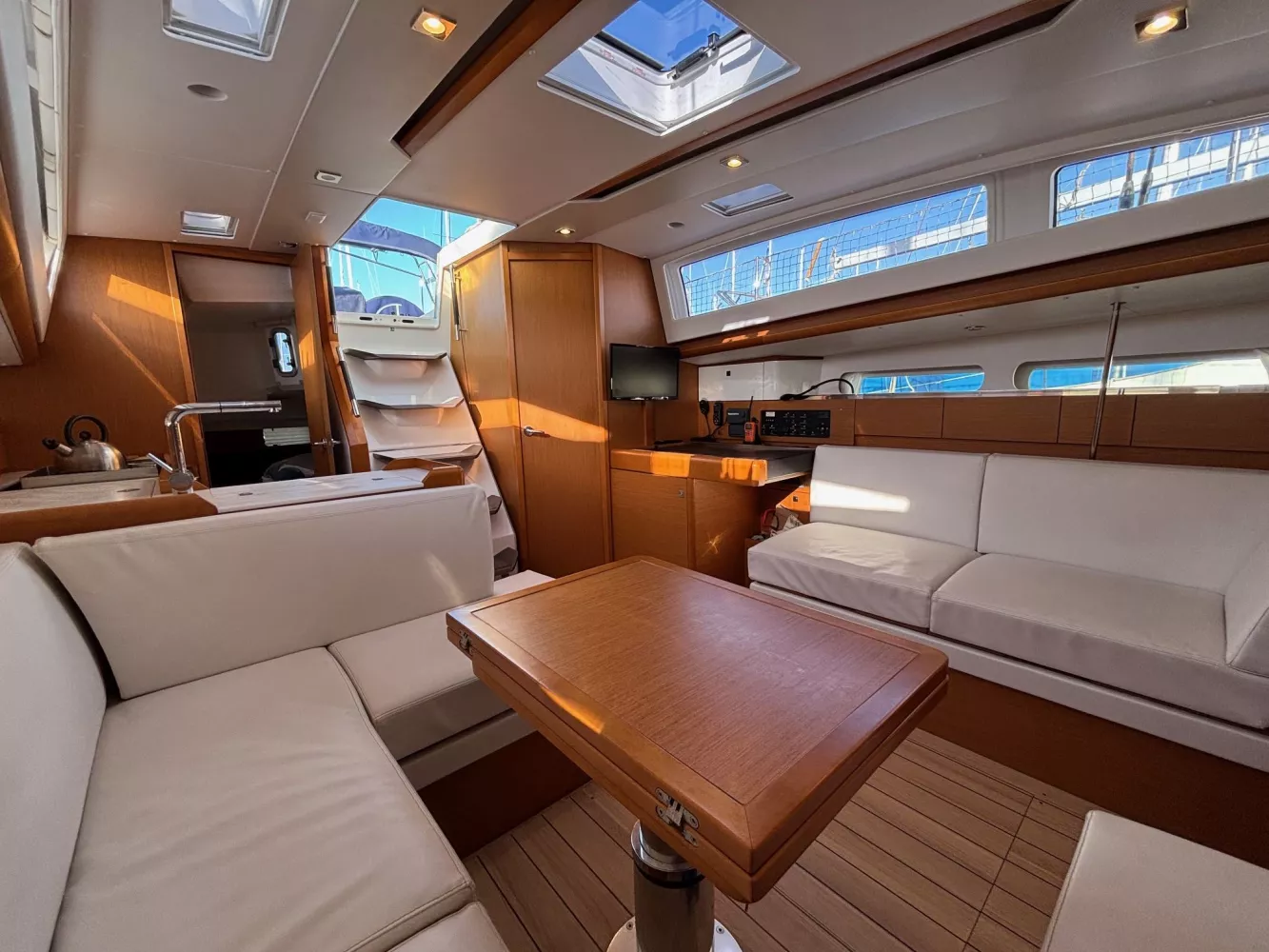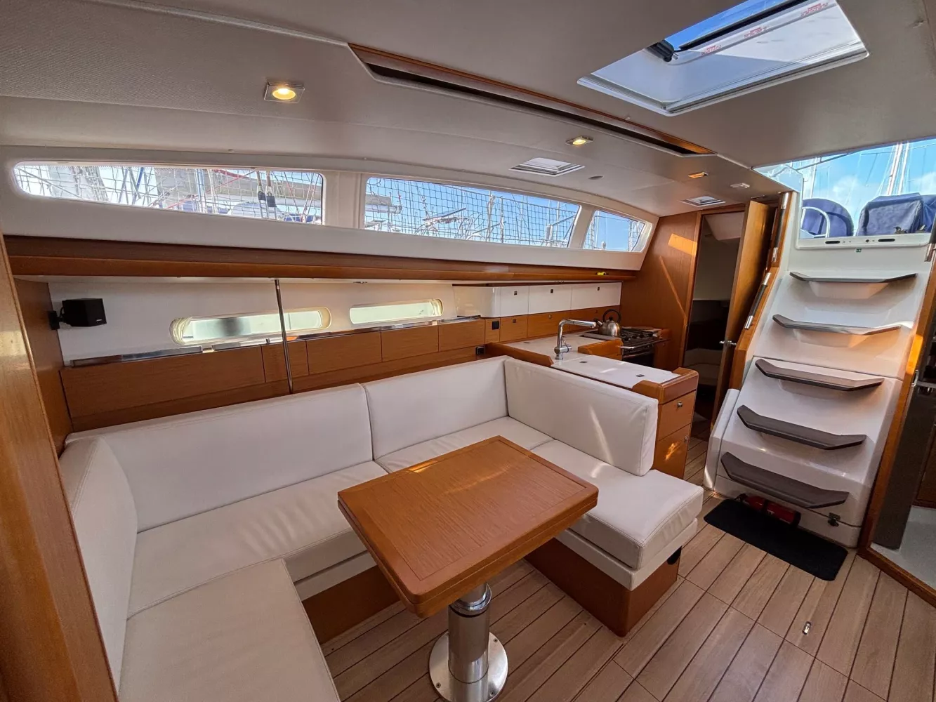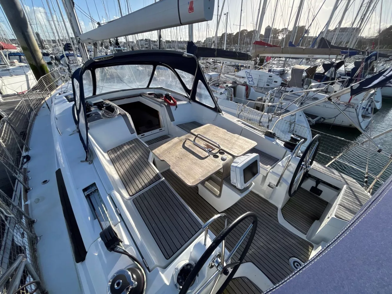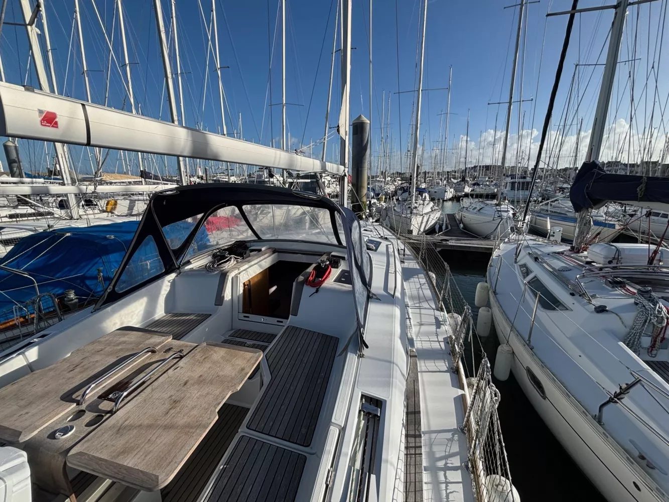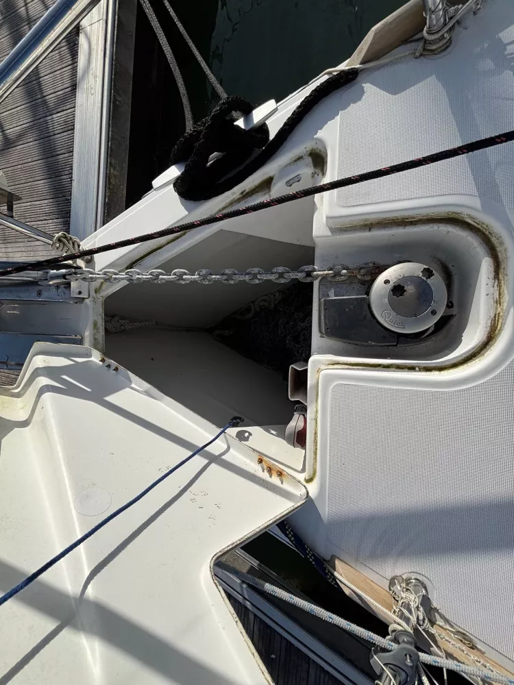 Version 2 cabines / 2 salles d’eau / petit tirant d’eau monosafran / Eau douce : 500 litres / Carburant : 200 litres / Grand-voile sur mât enrouleur / Génois enrouleur / Gréement de spi asymétrique / Accastillage de spi / Winch de roof à tribord / Kit amarrage et kit mouillage / Pack électronique offshore full Raymarine / Télécommande pilote / Pilote automatique / GPS sur pod orientable / Traceur / Sondeur / Guindeau électrique / Double commande de guindeau + compteur / Deuxième davier pour l’ancre + sous-barbe / Taquet au maitre-bau / Prise de quai 220 V / Chargeur de batteries / Batteries de bord supplémentaires / Four luxe avec grill / Store pour panneaux et hublots + moustiquaires pour panneaux / Douchette de cockpit eau chaude / Dossiers relevables dans lit cabine avant / Table de carré repliable sur pied télescopique / Couchette double de carré / Portes dans les filières / FUSION RA205 avec Bluetooth / Haut-parleurs BOSE dans le carré / Porte de frigo verticale / Télévision / WC électrique Quiet Flush arrière bâbord / WC manuel avant tribord / Chauffage fuel air pulsé / Séparateur de douche dans la salle d’eau / Capote de roof / Bimini avec éclairage fibres optiques / Haut-parleurs extérieurs / Table de cockpit / Fond de cockpit en teck / Housses de barres à roue / Support moteur HB / Portique avec panneaux solaires / 2 panneaux solaires 150 W / Annexe à fond gonflable avec quille en V de 2,50 m de longueur / Propulseur d’étrave / Radeau de survie / Armement semi-hauturier 6 personnes.