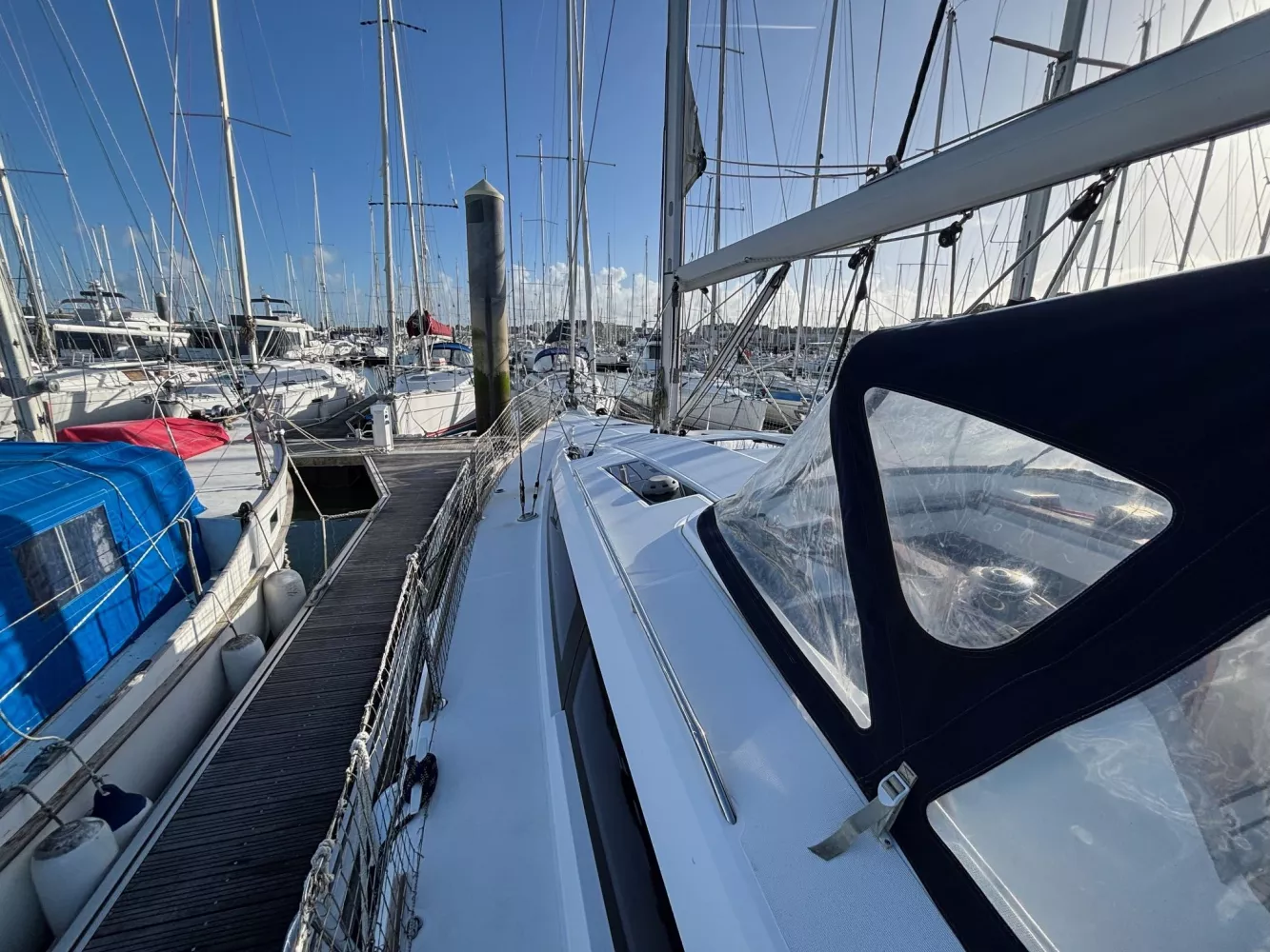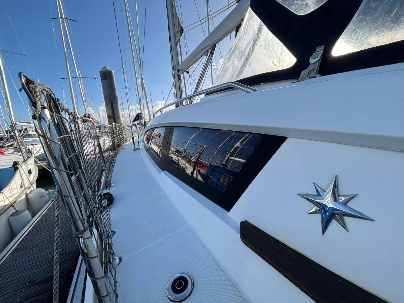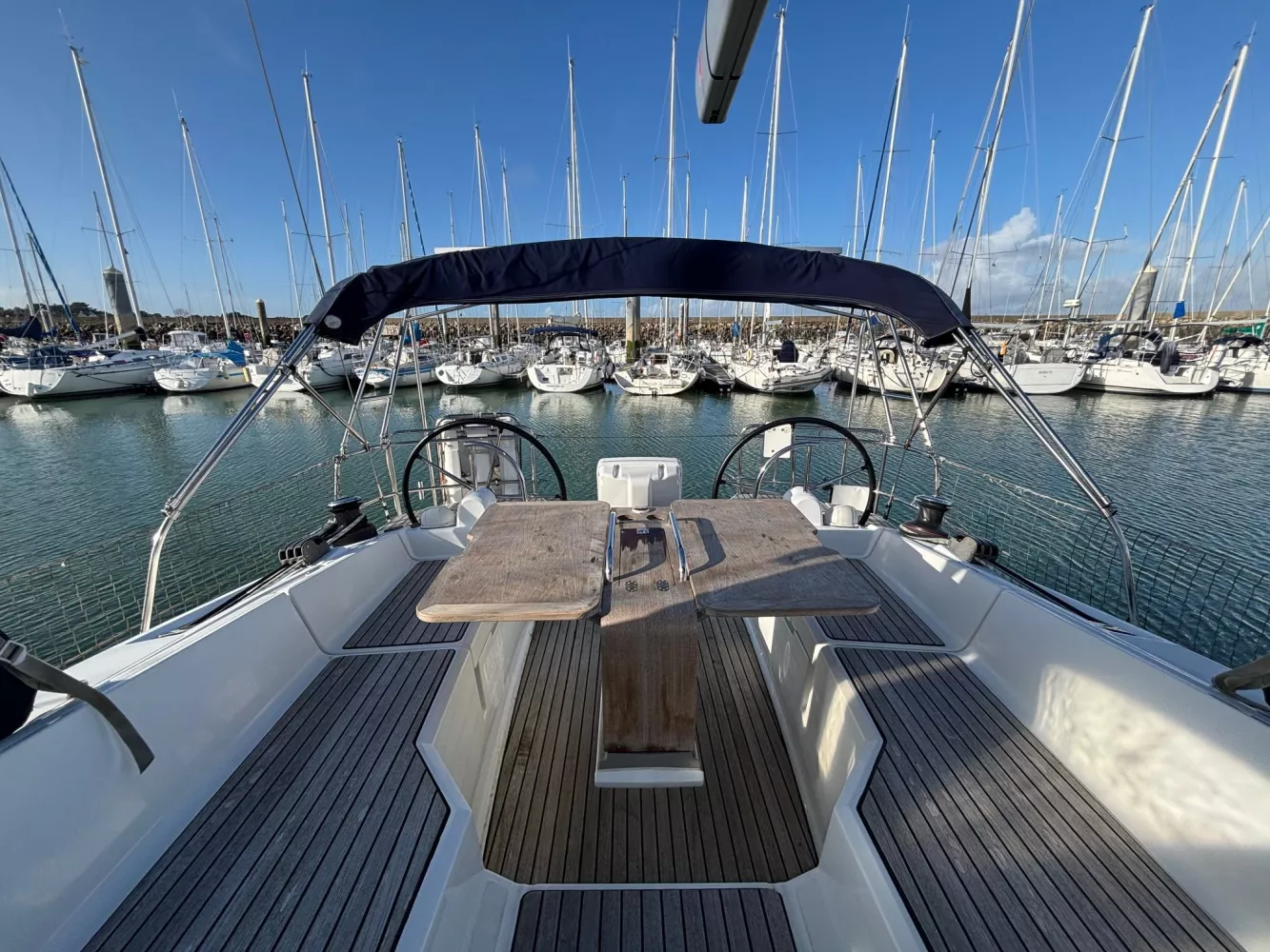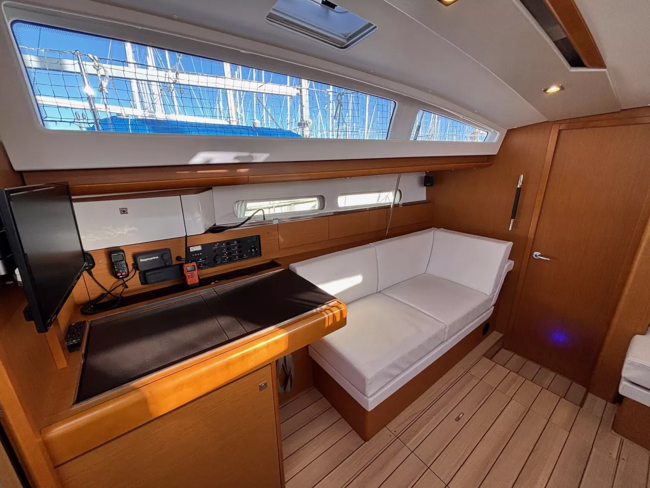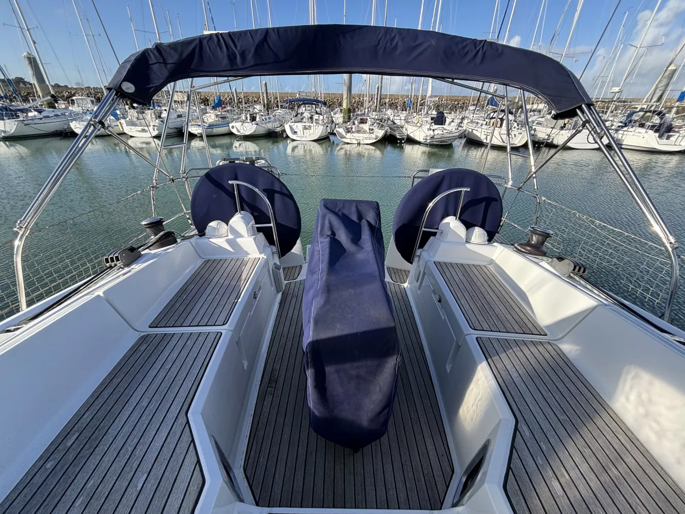 Version 2 cabines / 2 salles d’eau / petit tirant d’eau monosafran / Eau douce : 500 litres / Carburant : 200 litres / Grand-voile sur mât enrouleur / Génois enrouleur / Gréement de spi asymétrique / Accastillage de spi / Winch de roof à tribord / Kit amarrage et kit mouillage / Pack électronique offshore full Raymarine / Télécommande pilote / Pilote automatique / GPS sur pod orientable / Traceur / Sondeur / Guindeau électrique / Double commande de guindeau + compteur / Deuxième davier pour l’ancre + sous-barbe / Taquet au maitre-bau / Prise de quai 220 V / Chargeur de batteries / Batteries de bord supplémentaires / Four luxe avec grill / Store pour panneaux et hublots + moustiquaires pour panneaux / Douchette de cockpit eau chaude / Dossiers relevables dans lit cabine avant / Table de carré repliable sur pied télescopique / Couchette double de carré / Portes dans les filières / FUSION RA205 avec Bluetooth / Haut-parleurs BOSE dans le carré / Porte de frigo verticale / Télévision / WC électrique Quiet Flush arrière bâbord / WC manuel avant tribord / Chauffage fuel air pulsé / Séparateur de douche dans la salle d’eau / Capote de roof / Bimini avec éclairage fibres optiques / Haut-parleurs extérieurs / Table de cockpit / Fond de cockpit en teck / Housses de barres à roue / Support moteur HB / Portique avec panneaux solaires / 2 panneaux solaires 150 W / Annexe à fond gonflable avec quille en V de 2,50 m de longueur / Propulseur d’étrave / Radeau de survie / Armement semi-hauturier 6 personnes.