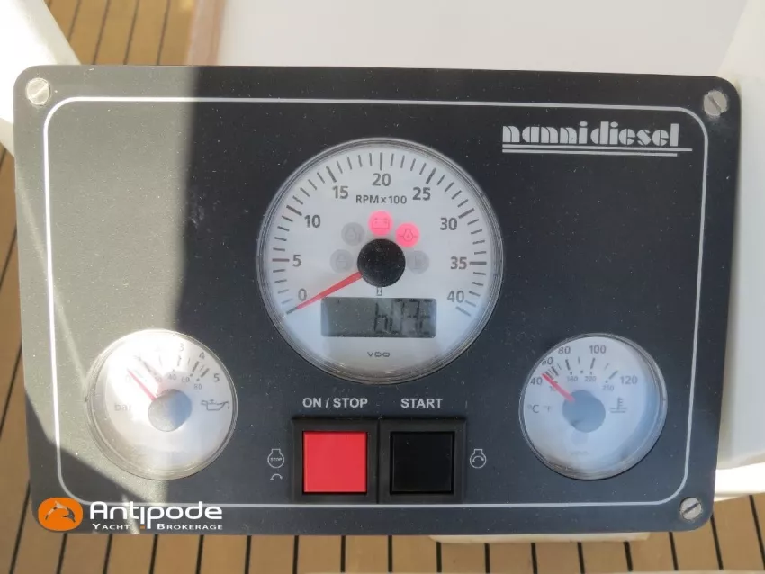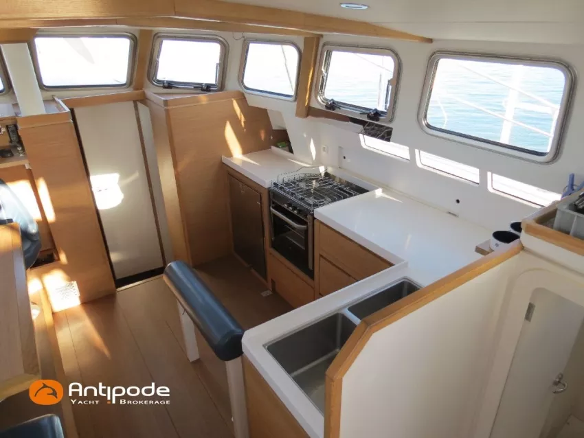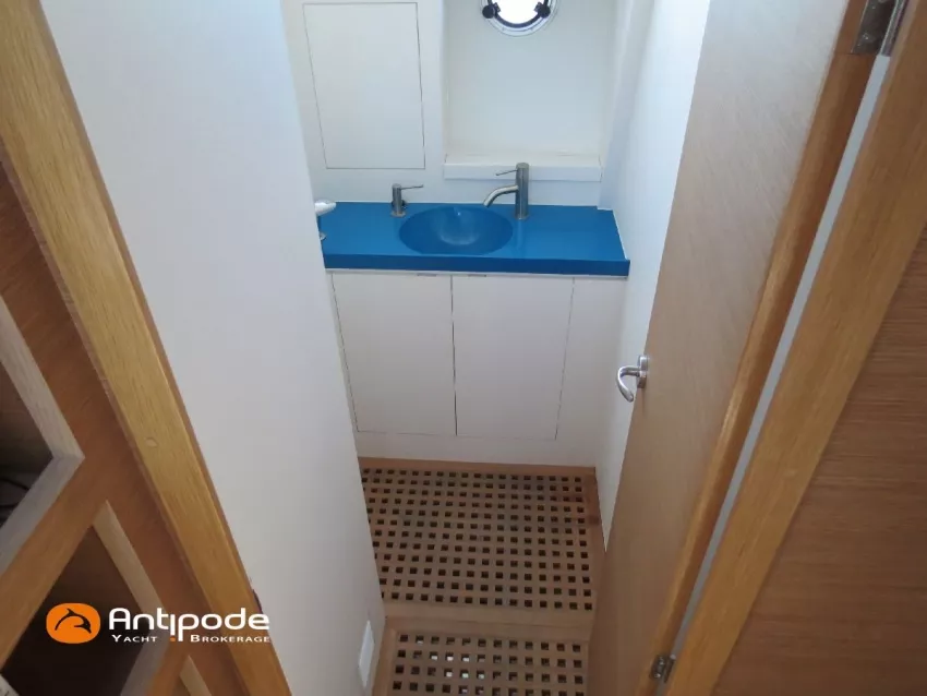 META JPB 52 dériveur intégral aluminium Strongall, plan Jean-Pierre Brouns, 2021, 1ère main, 2 X NANNI N 4.65, 2 X 65 cv (603 h), Isolation coque par projection de granulés de lièges collées, Carré panoramique surélevé à babord, 1 cabine arrière, avec grand couchage central double et 2 couchettes latérales, 1 meuble bureau, 2 cabines avant (1 lit double dans la cabine babord, 2 lits superposés dans la cabine tribord), Atelier, rangements, buanderie arrière babord, Selleries carré cuir, Sommiers à lattes dans toutes les cabines, 2 winchs primaires électriques - Andersen 62, 2 winchs électriques pour réglages et manoeuvres - Andersen 52, Système de barre à roue basculant sur axe 3 positions, Capote de roof, Bimini top cockpit sur structure rigide, Guindeau électrique - Lofrans Falkon 24 V, Coffre rangement radeau de survie sur la plage arrière, Portique arrière avec système de relevage d'annexe, Mât carbone 2 étages BDF - Lorima, Gréement dormant Rod, Grand-voile full batten - X-VOILES Hydranet, Rail de guindant de grand voile + chariots de lattes - Antal, Prises de ris automatiques, Génois sur enrouleur - X-VOILES Hydranet, Trinquette sur enrouleur - X-VOILES Hydranet, Pilote automatique in board - NKE Gyro , 2 systèmes d'entrainements du pilote (1 hydraulique, 1 mécanique), Centrale de navigation - NKE, Radar avec radôme sur support de mât - JRC JMA 1030 RADAR, Transpondeur AIS (émetteur récepteur) - Icom MA 510 TR, VHF avec double poste cockpit - Icom M 423 G, Telephone et connection internet - Sailor Fleet One Immarsat, Interface PC, Informatique (PC + windows), Unité réfrigérante porte frontale, Congélateur, Machine à laver le linge, Prise de quai 220 V + chargeur de batteries - Victron 80 amp 24 V, Convertisseur 24 V / 220 V - Victron Phoenix 24/800, Chauffage EBERSPACER, Dessalinisateur 12 V - Aquabase, Réservoirs rigide eaux noires - 2 X 40 l, Réservoirs rigides eaux grises - 2 X 120 l, Panneau solaire sur support inclinable portique, Panneau solaire souple amovible, Eolienne - Superwind, Radeau de survie - ISO 9650-1 6 p, Visible Bretagne. Pour plus d'informations ou pour fixer un rendez-vous de visite, contact : Jérôme Le Joubioux 06 07 45 71 73 - jerome@antipode-yachts.com