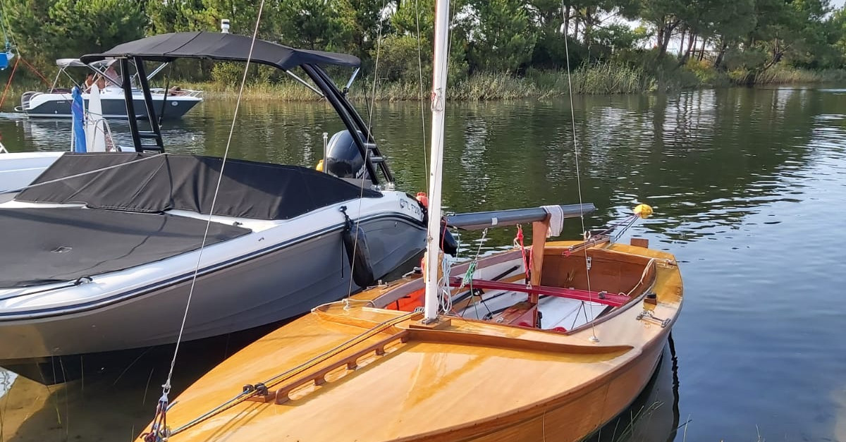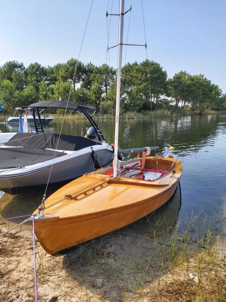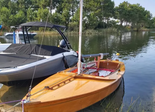 dériveur léger en contreplaqué et acajou. 250kg dont 37kg de dérive. très bon état. vernis Epifane refait (12 couches). laque époxy de marque soromap pour les œuvres vives. peinture international. 1 gv+2focs+ 1 tangon. accastillage harken neuf et en partie d'origine. safran refait . pas de travaux à prévoir. petits équipements divers( gilets etc.). remorque en bon état avec pneus neufs.