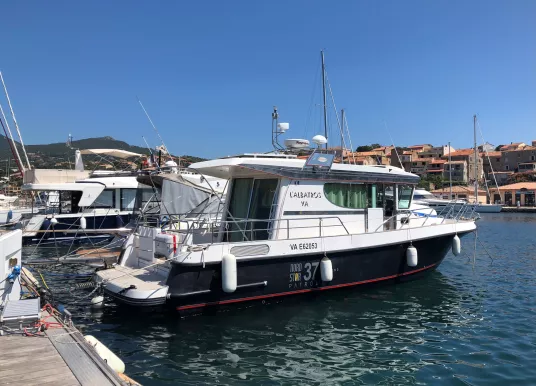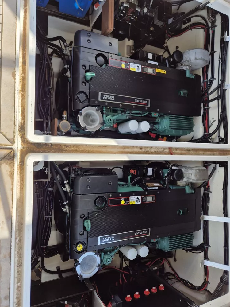 - Propulsé par 2 moteurs diesel Volvo D6-330 de 330 cv chacun (environ 500 h), en Z-drive, ce bateau garantit puissance, manœuvrabilité et performance. L’entretien moteur est rigoureusement suivi avec hivernage annuel à terre.