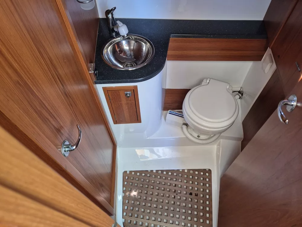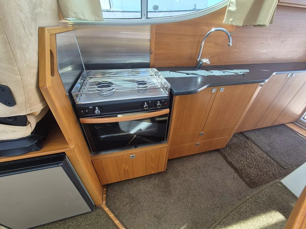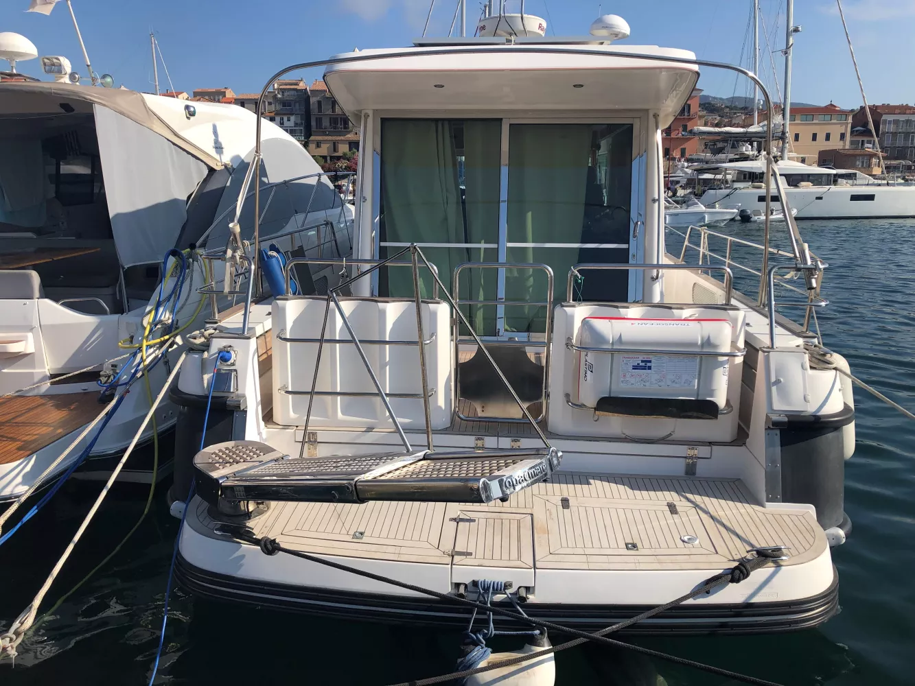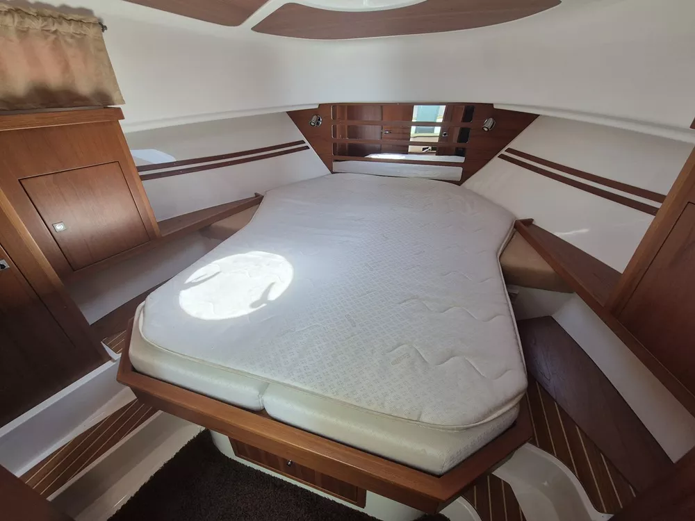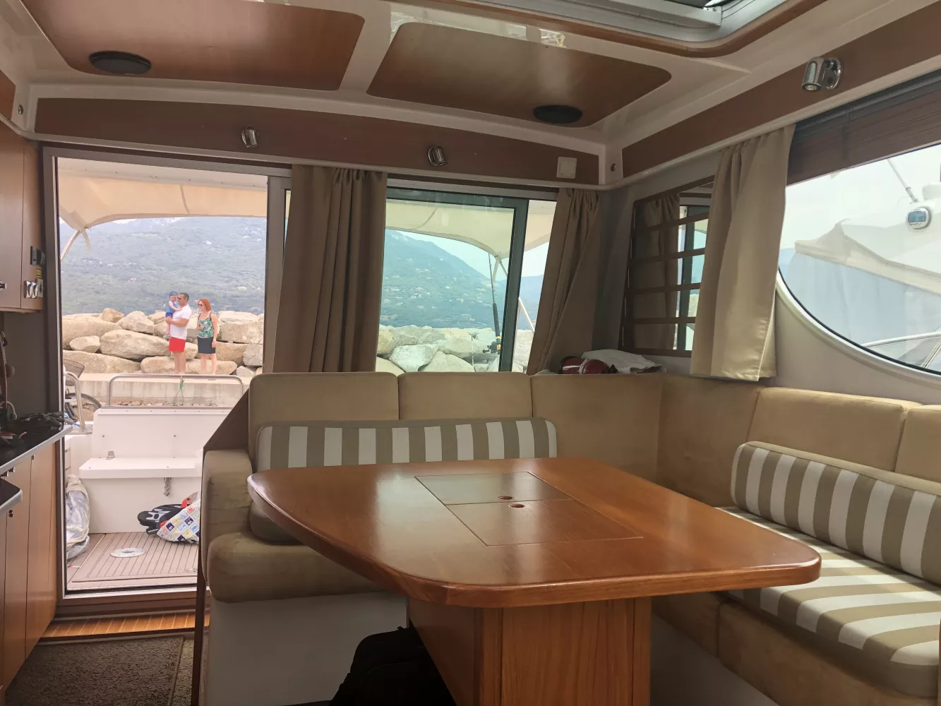 La timonerie est extrêmement bien pensée avec 2 portes latérales coulissantes, une baie arrière ouvrante et un toit ouvrant électrique, favorisant l’aération et la vie intérieure/extérieur fluide vers le grand cockpit arrière.