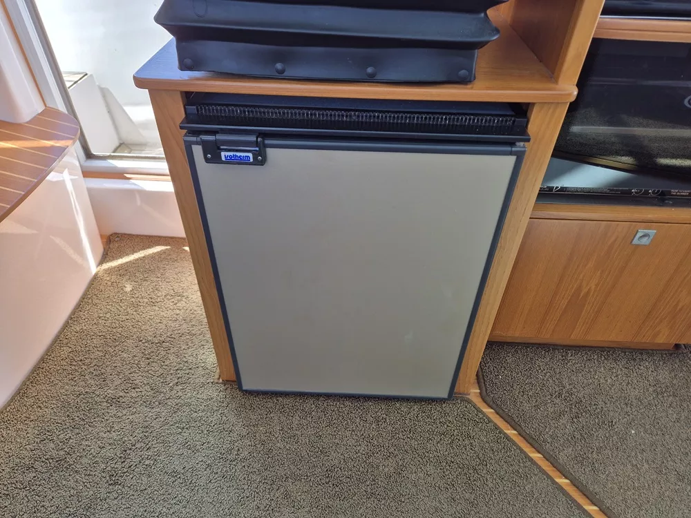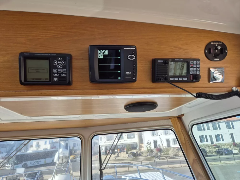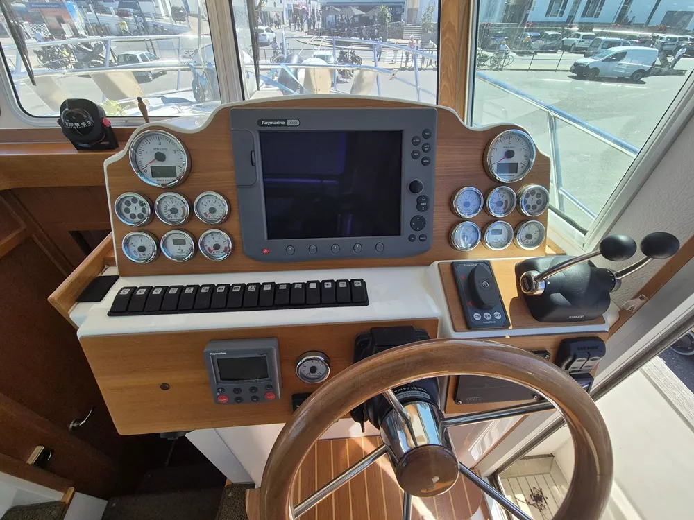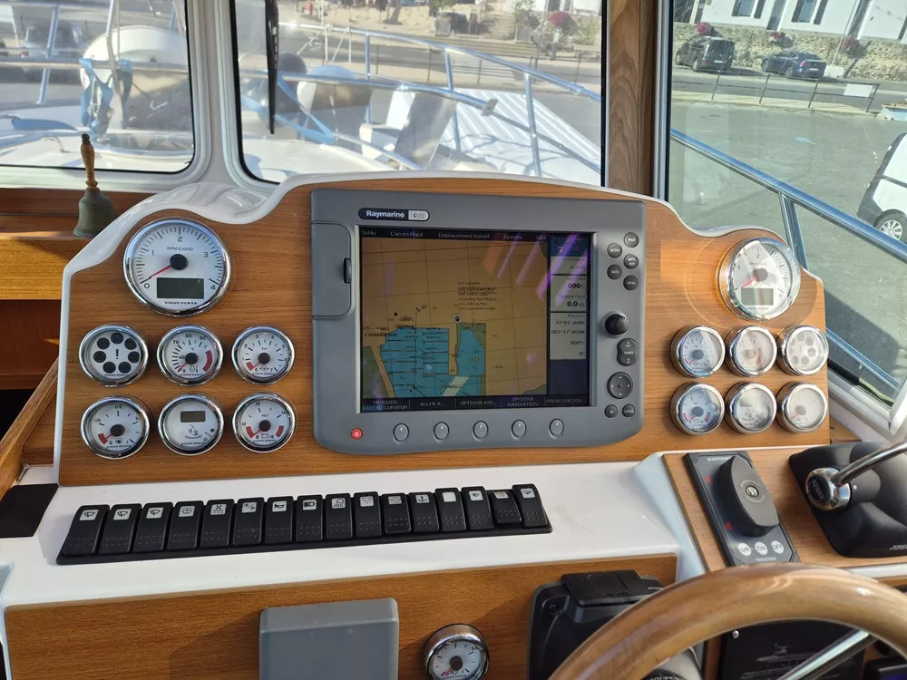 Avec ses 11,96 m de longueur hors-tout, sa largeur de 3,80 m et sa carène planante à V prononcé, le Nord Star 37 assure une excellente tenue à la mer. La coque en polyester monolithique est revêtue d’un élégant gelcoat bleu marine, renforçant son allure élégante et marine. Le pont imitation teck et les finitions inox (balcons, mains courantes) confèrent à ce bateau un style à la fois chaleureux et robuste.