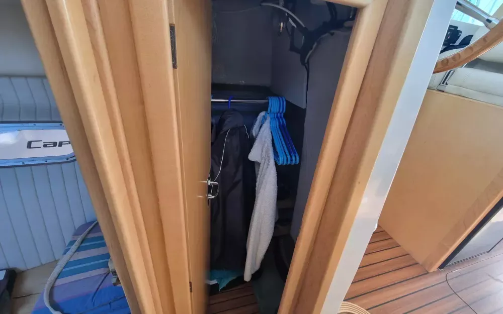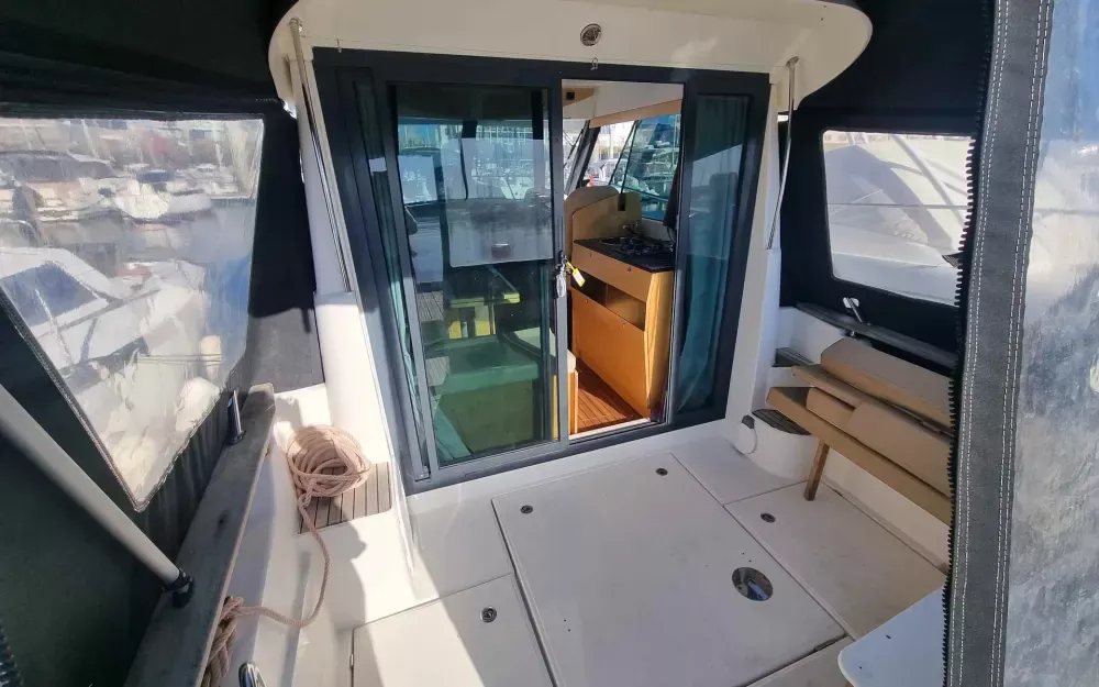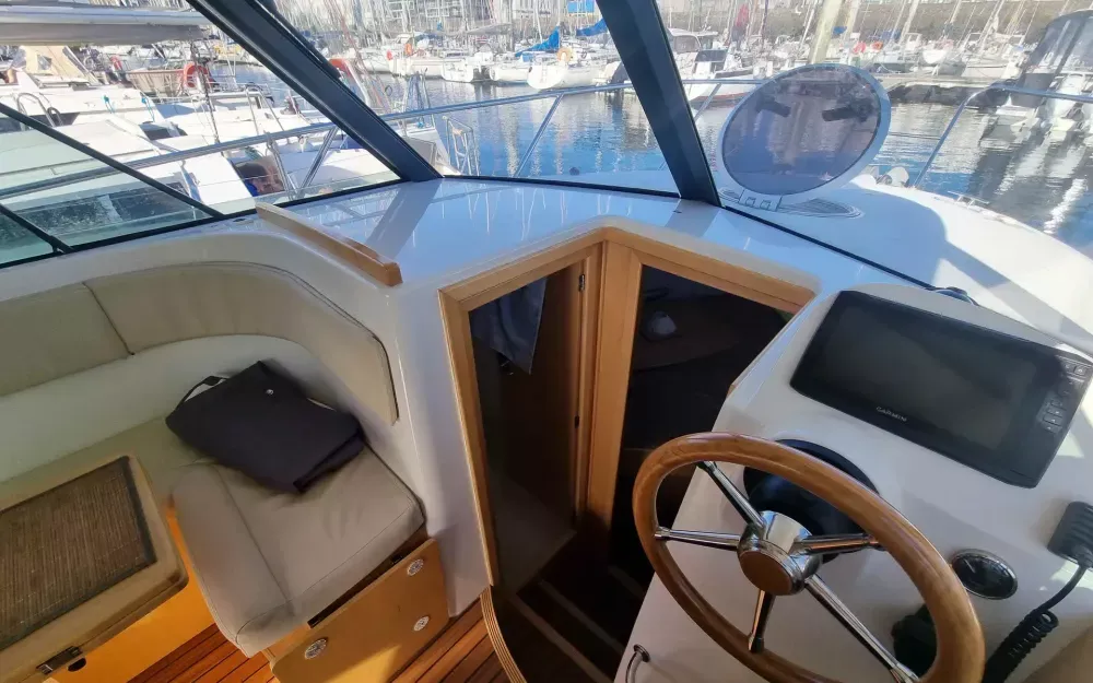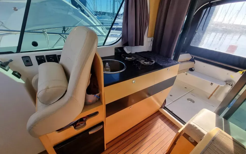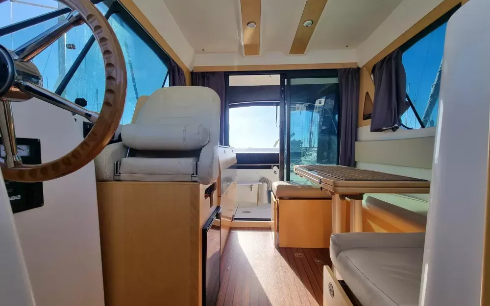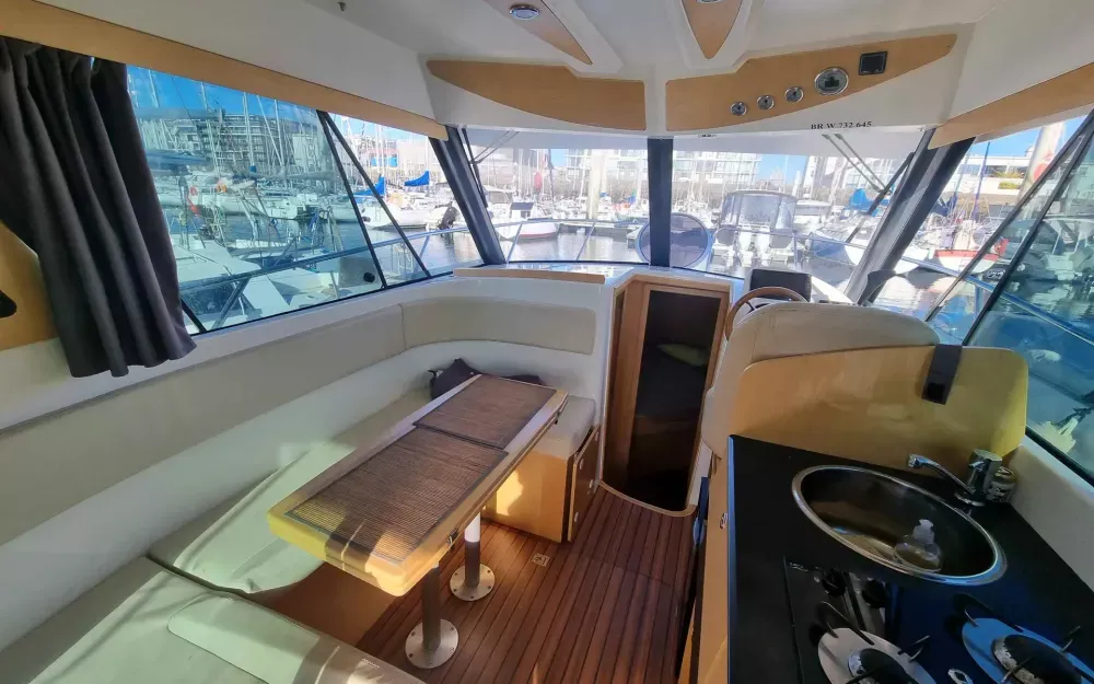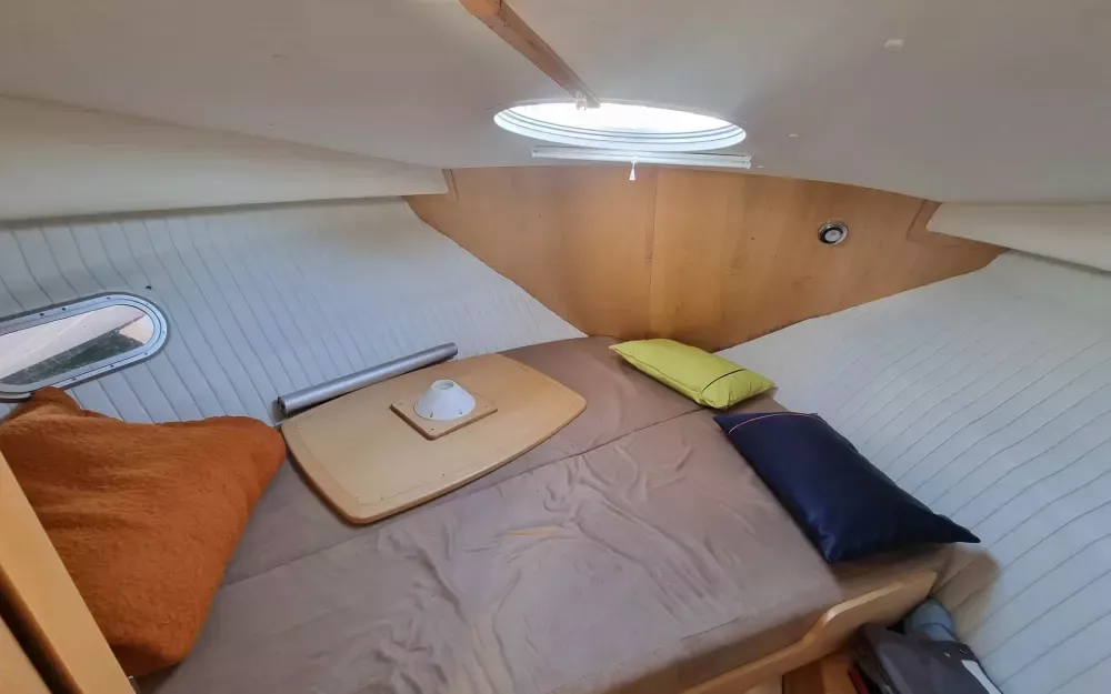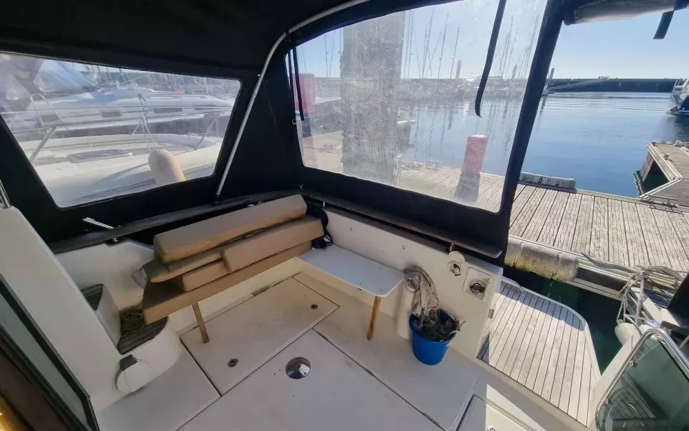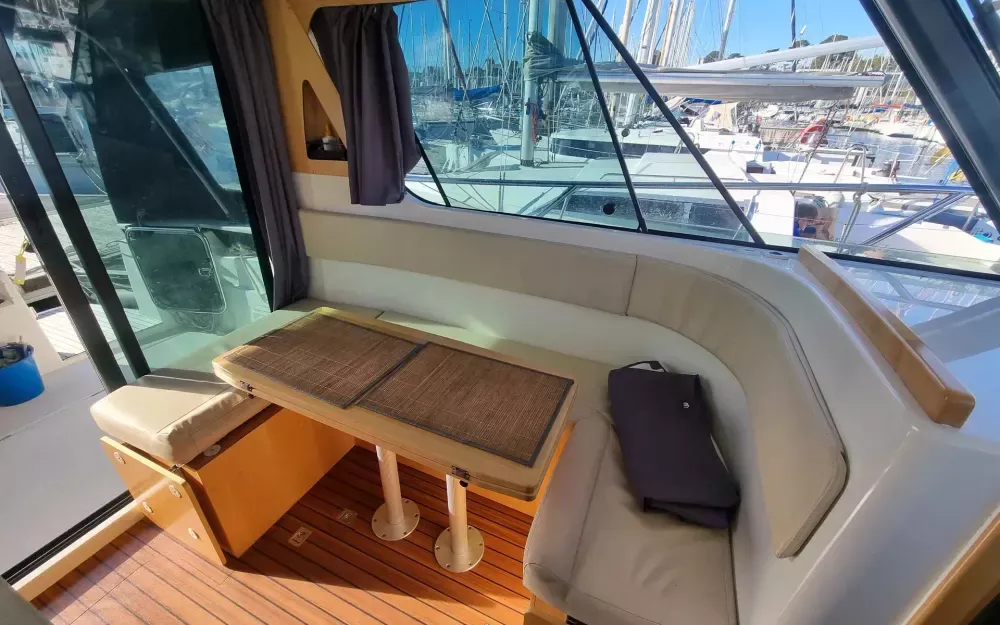 •Salon de cockpit, banquette babord, avec selleries et table en bois avec pied et embase