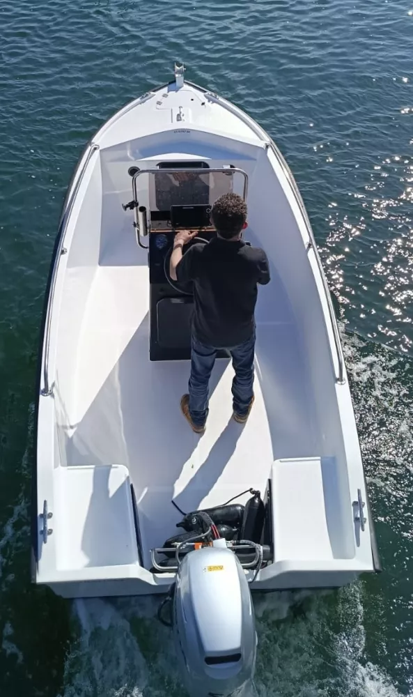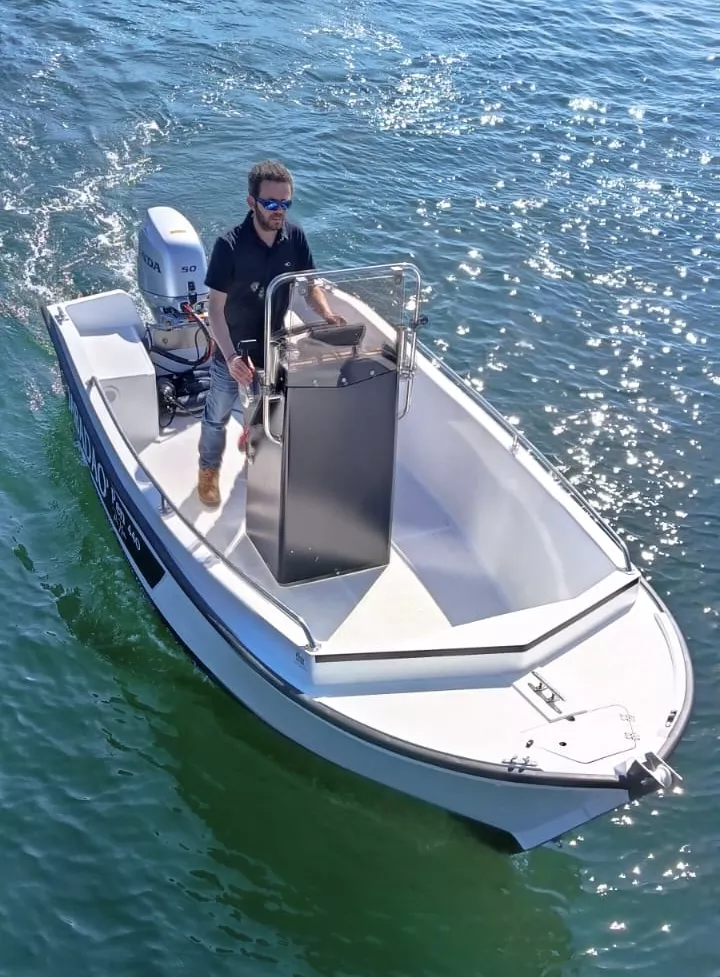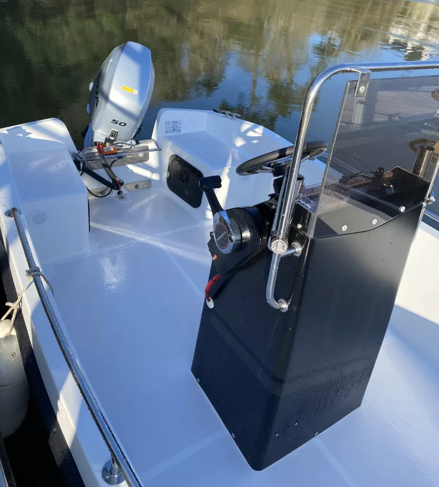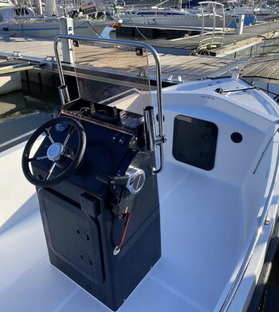 Equipé d'une console avec pare-brise, cette dernière ainsi que les francs bords sont équipés de mains courantes en inox.