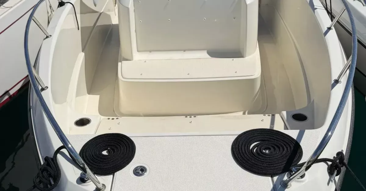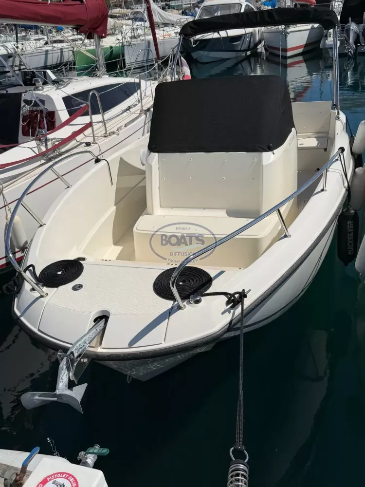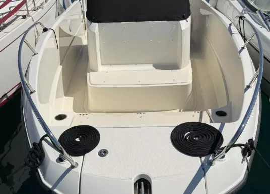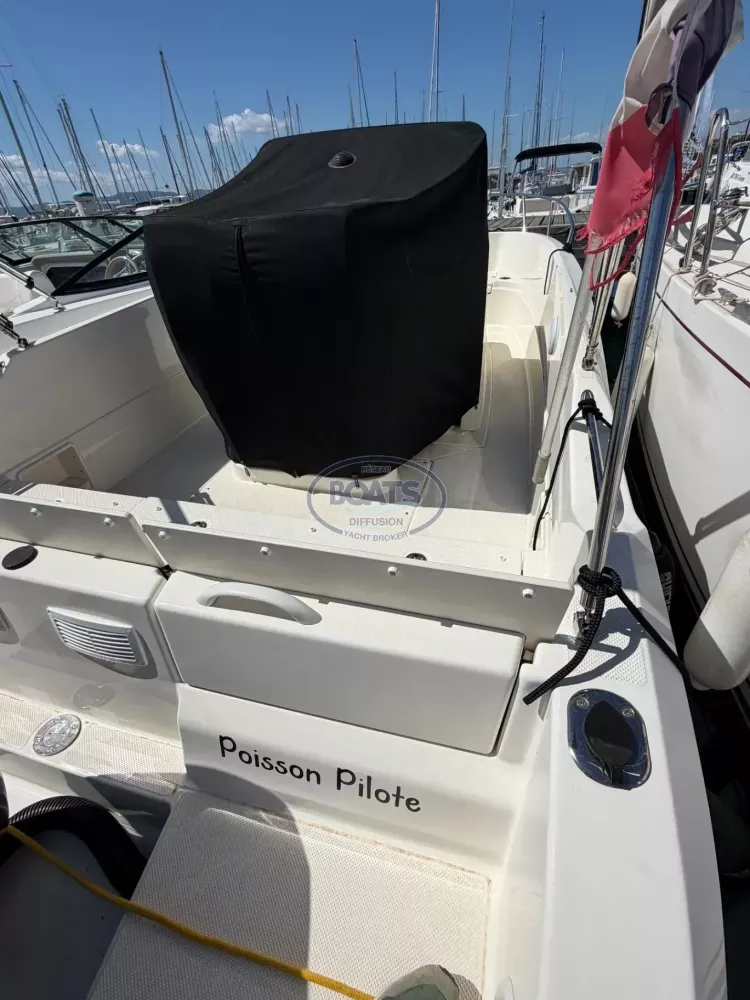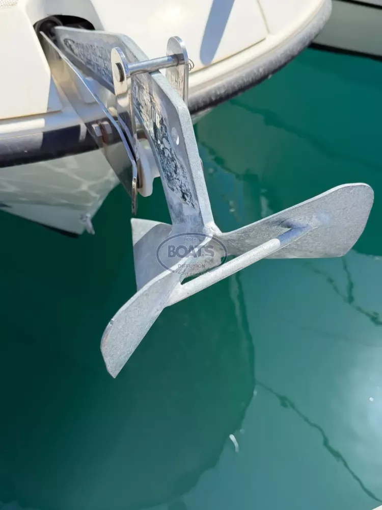 Grand espace autour du poste de pilotage, coussin banquette arrière, 2 siéges avec bolster, bain de soleil avant, équipé d 'une cabine, coffre à l 'avant et à l 'arrière.