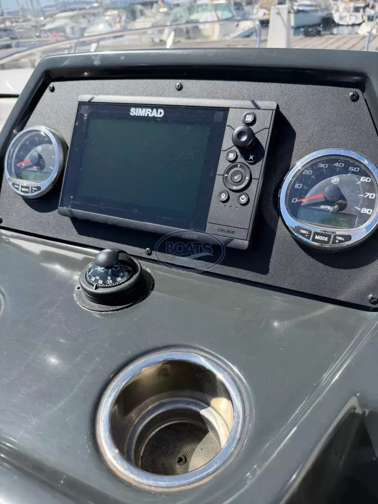 Propulsé par un moteur Mercury Hors-bord de 200CV avec gestion des paramétres sur la console centrale: Loch Speedo, horametre, réglage du Trim, commande électrique, direction hydraulique.