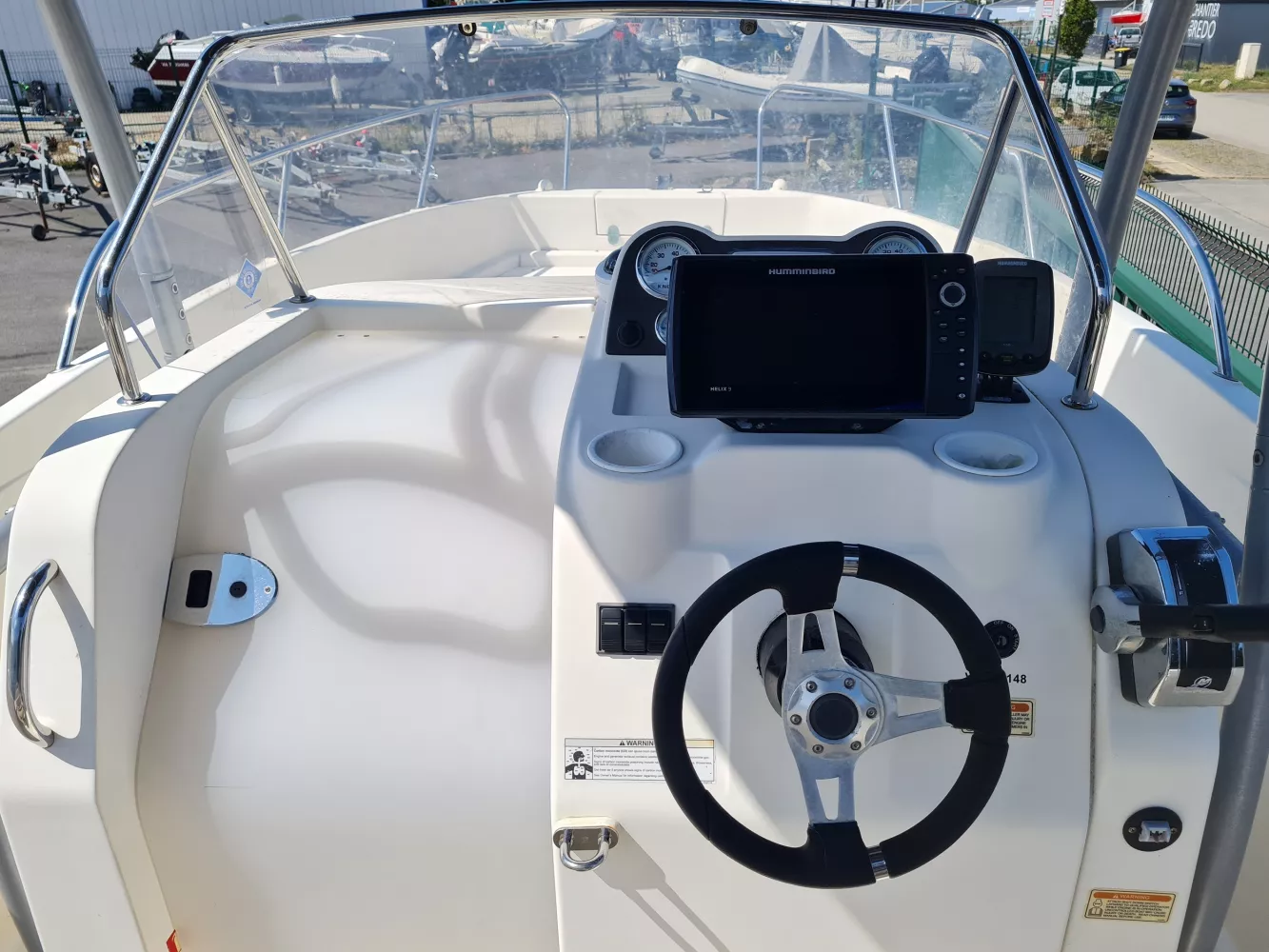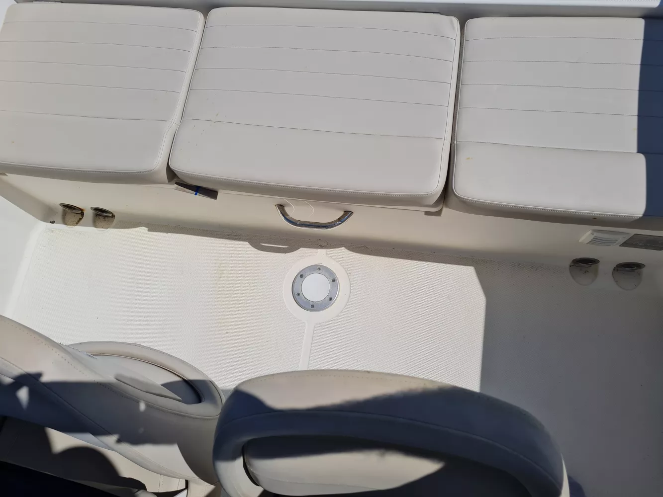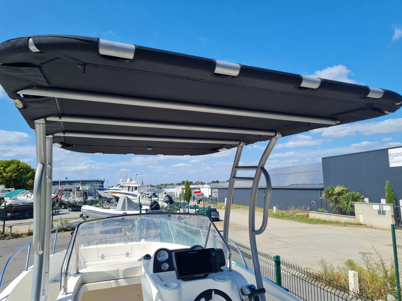 Table de pique nique / Coussin de bain de soleil avant / Coussin de cabine / Compas / T-top avec toile neuve / Combiné GPS sondeur Humminbird Hélix 9 SI avec carte / Sellerie dossier arrière neuve / Plateforme + échelle de bain.