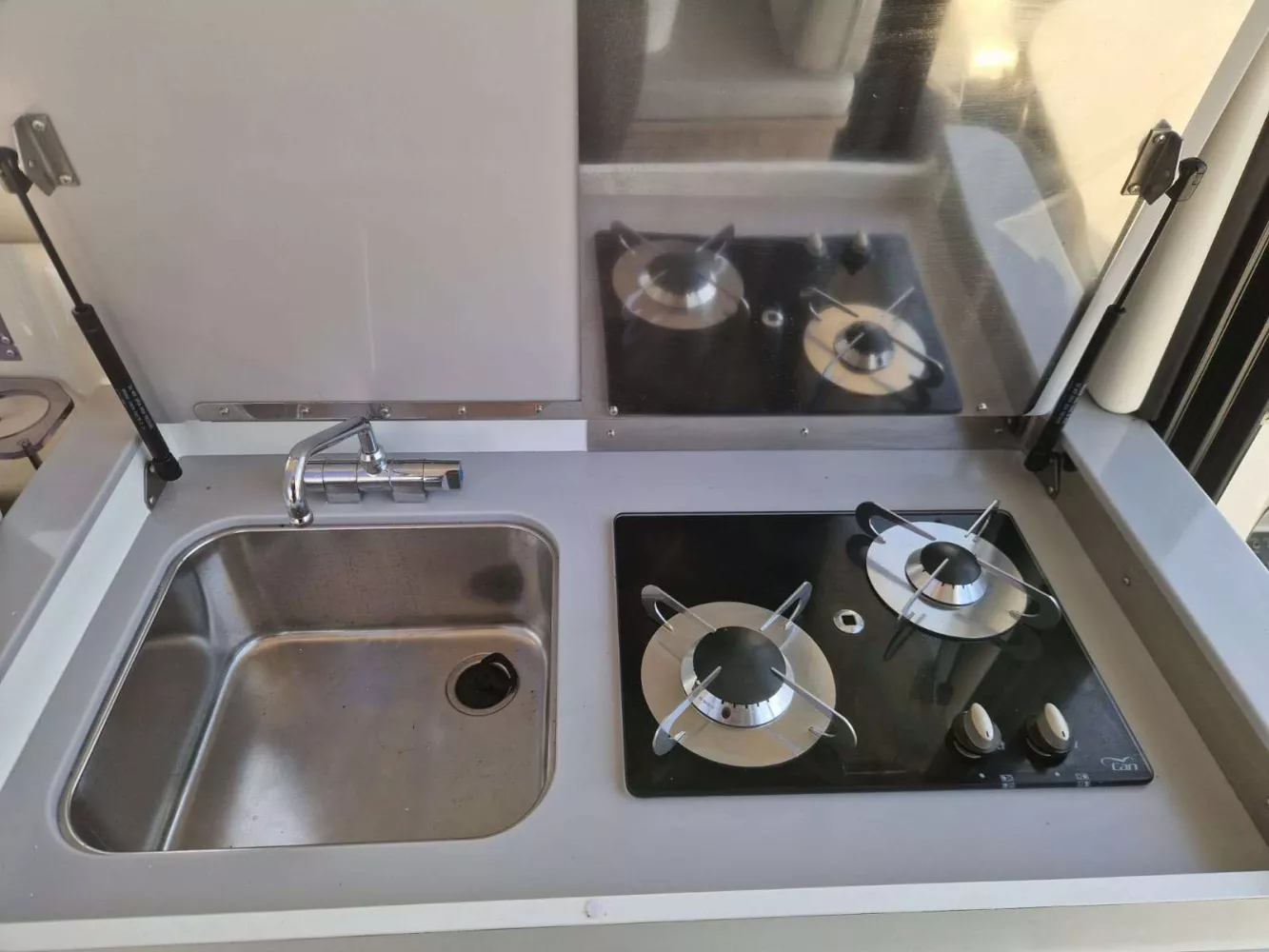• Cuisine (Réchaud 2 feux gaz, évier et rangements)