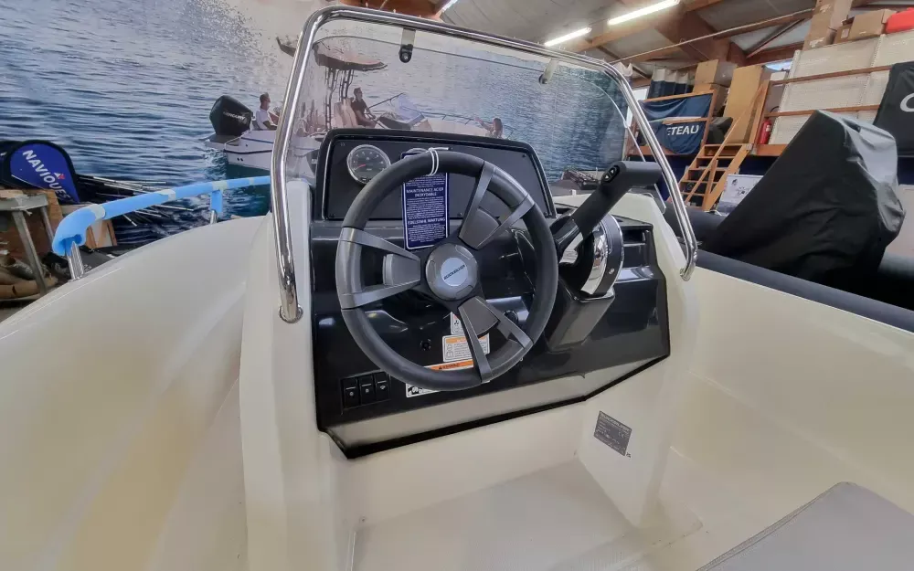 Davier à rouleau, échelle de bain, feux de navigation, baille à mouillage, cockpit autovideur, porte-cannes à pêche, plateformes de bain, prise électrique 12 v, compteur/compte-tours analogique, jauge de carburant, indicateur d’assiette, banquette arrière, banquette dans poste de pilotage, rangements sous banquette arrière, pré-équipement HB, montage simple batterie, pompe de fond de cale électrique & manuelle, direction mécanique, extincteur, application mobile VesselView