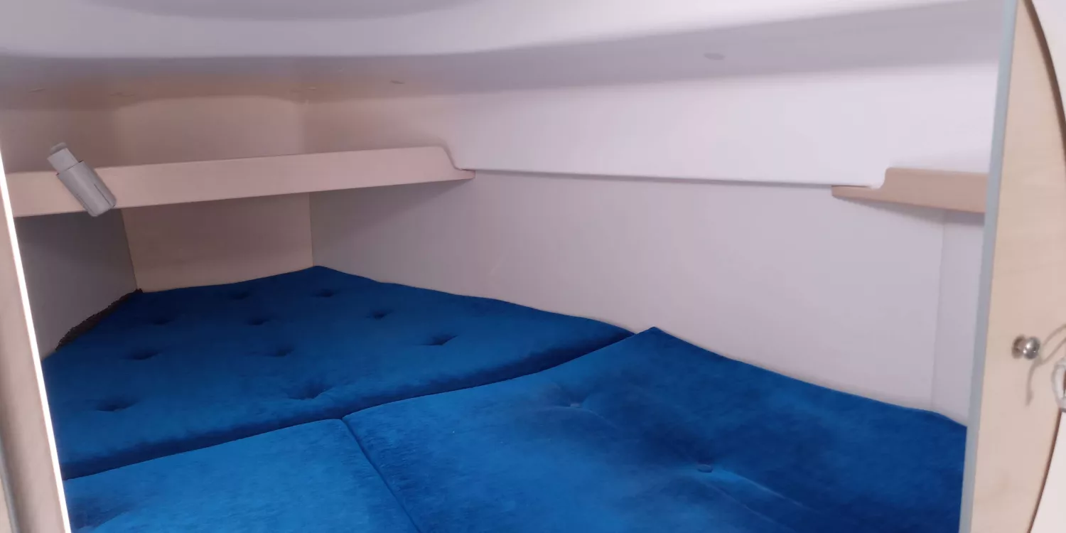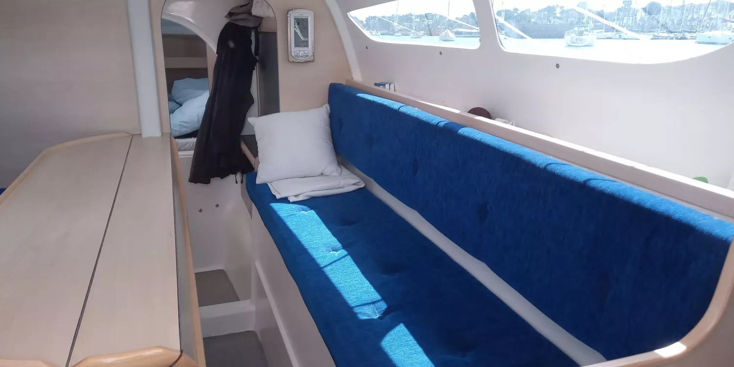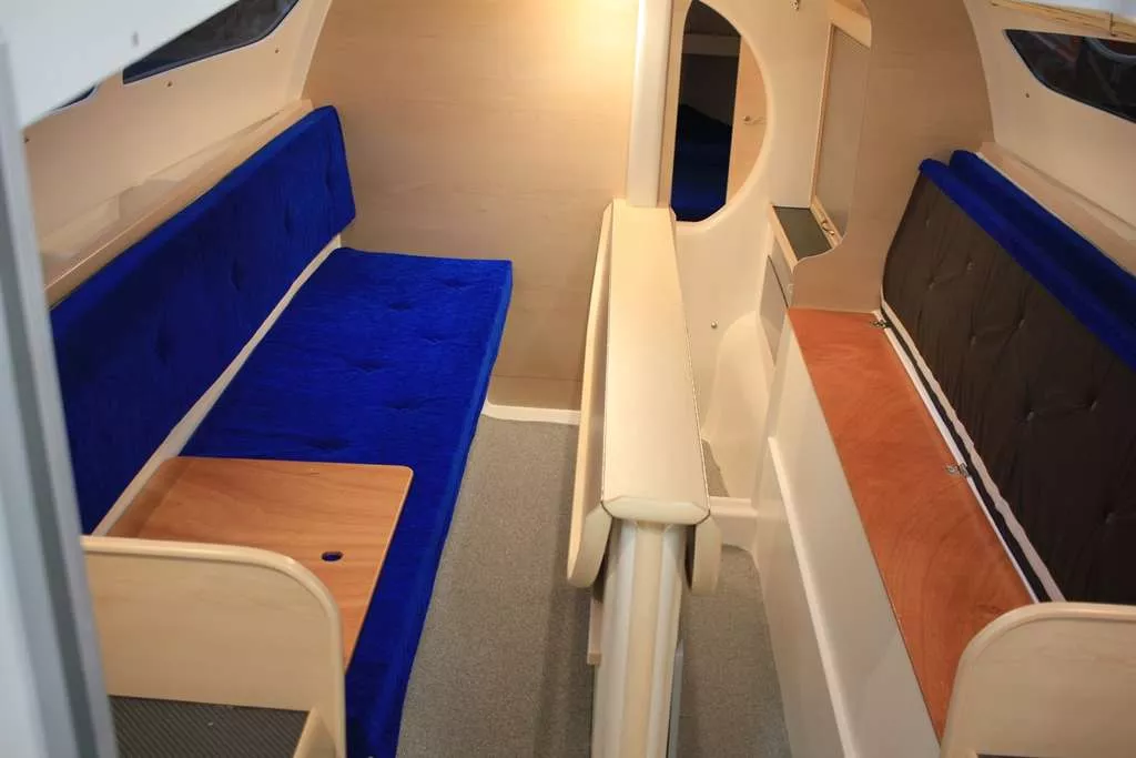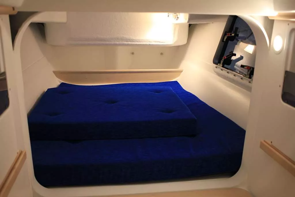 *Intérieur : 1 cabine double à l’avant avec rangements, 1 cabine d’appoint à l’arrière avec rangements, carré convertible en couchage simple, store occultant, table avec panneaux repliables, rideaux Ocean Air Shade, moquette, cabinet WC marin et réservoir à eaux noires (60 L), système de ventilation, porte coulissante, cuisine (évier avec eau sous pression 90 L, réfrigérateur 45 L, réchaud 2 feux).
