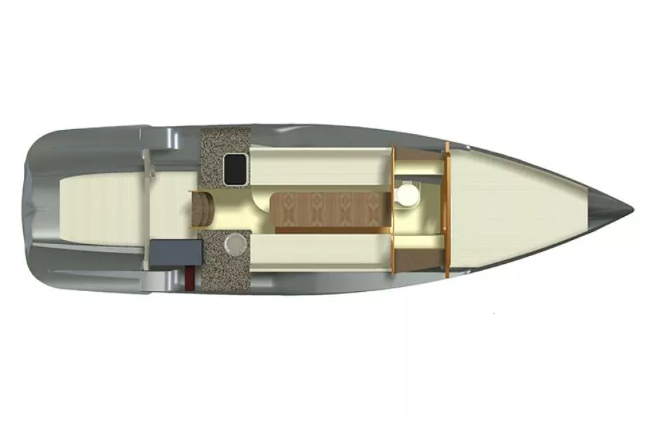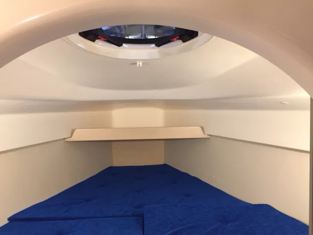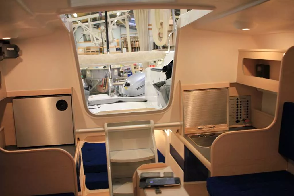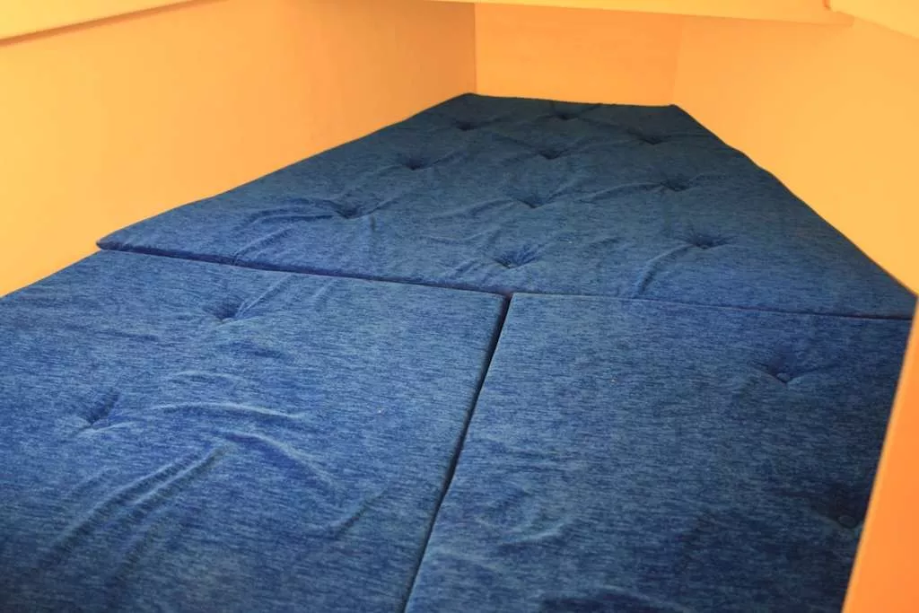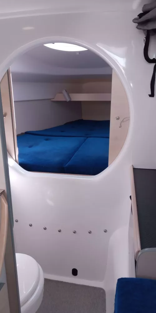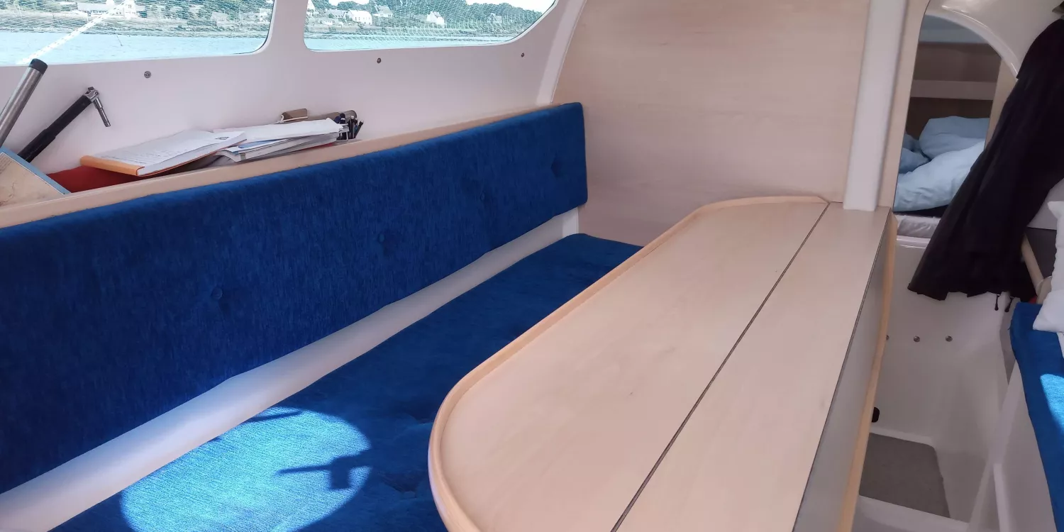 *Intérieur : 1 cabine double à l’avant avec rangements, 1 cabine d’appoint à l’arrière avec rangements, carré convertible en couchage simple, store occultant, table avec panneaux repliables, rideaux Ocean Air Shade, moquette, cabinet WC marin et réservoir à eaux noires (60 L), système de ventilation, porte coulissante, cuisine (évier avec eau sous pression 90 L, réfrigérateur 45 L, réchaud 2 feux).