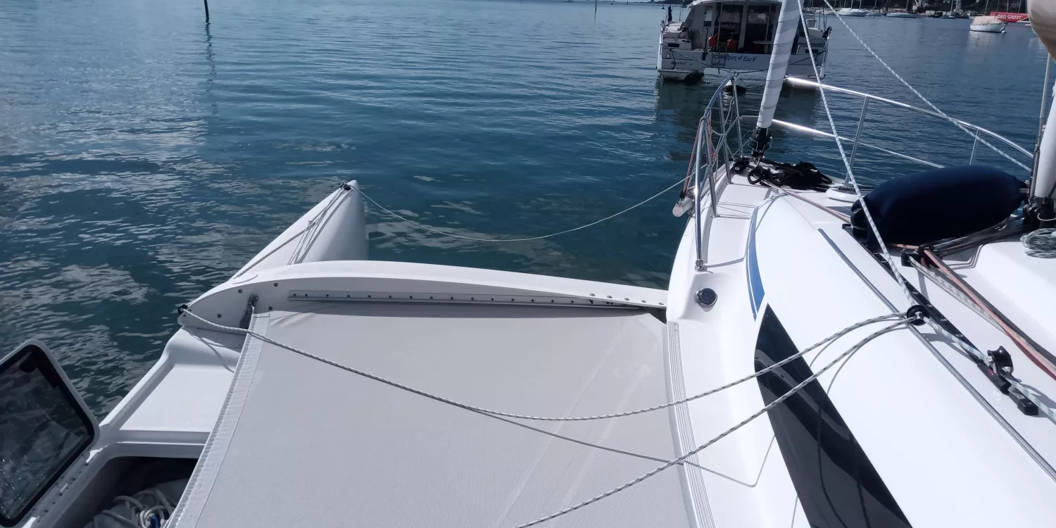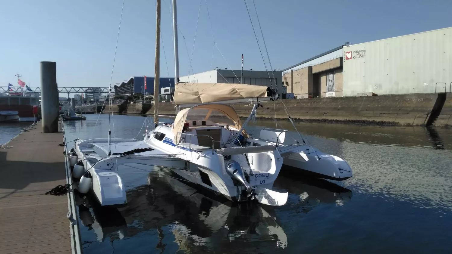 *Extérieur : Barre franche, manœuvres au cockpit, 4 winches Andersen self-tailing, deux bailles à bouts, bancs de cockpit, table de cockpit amovible, capote de roof et fermeture arrière, douchette avec eau sous pression, filets trampolines changés en 2023, waterstays changés en 2025, panneaux solaires (1 x 50 W + 2 x 38 W), batterie de servitude LFP 100 Ah, convertisseur pur sinus DC-AC 600 W, prise de quai.