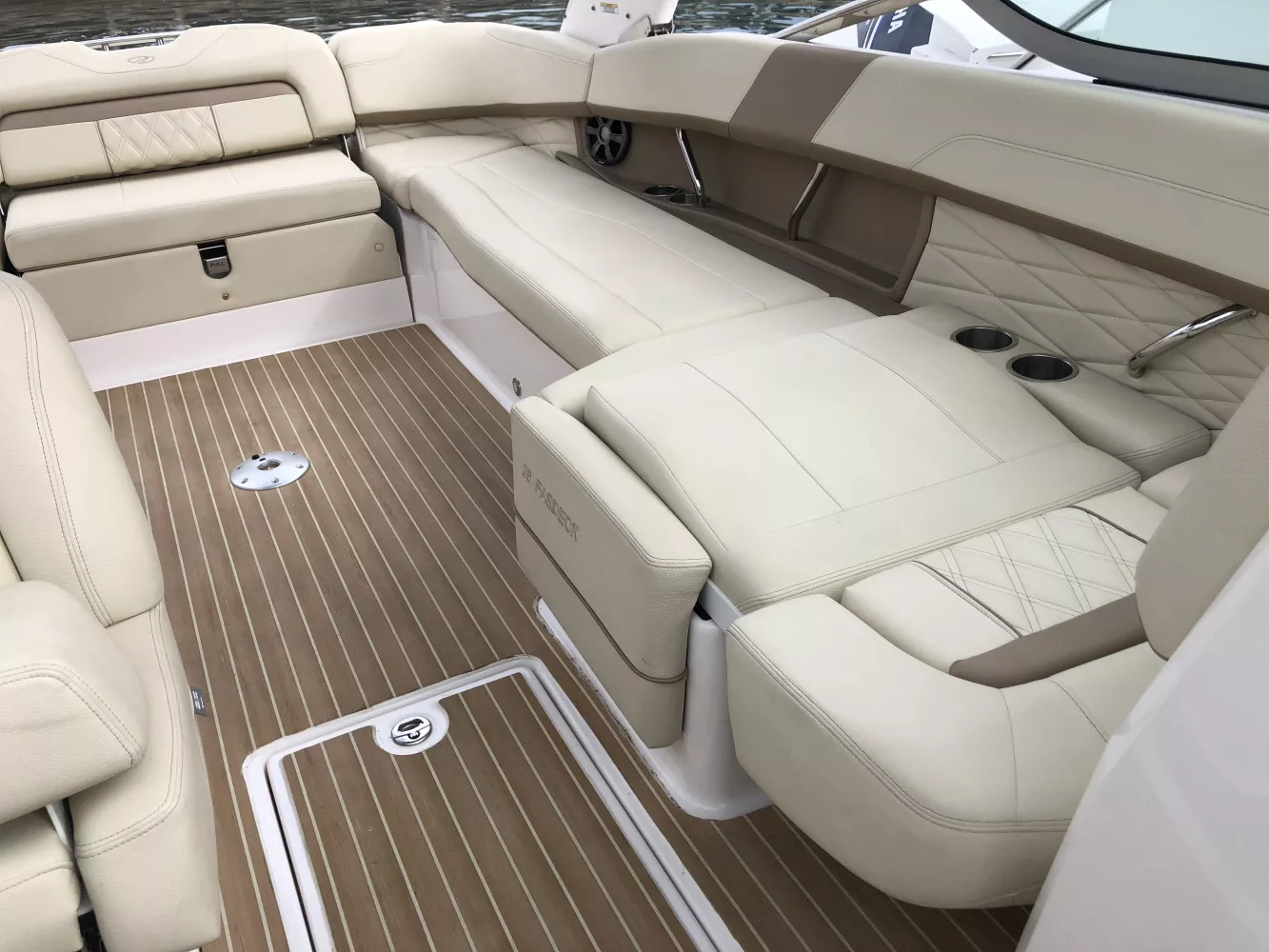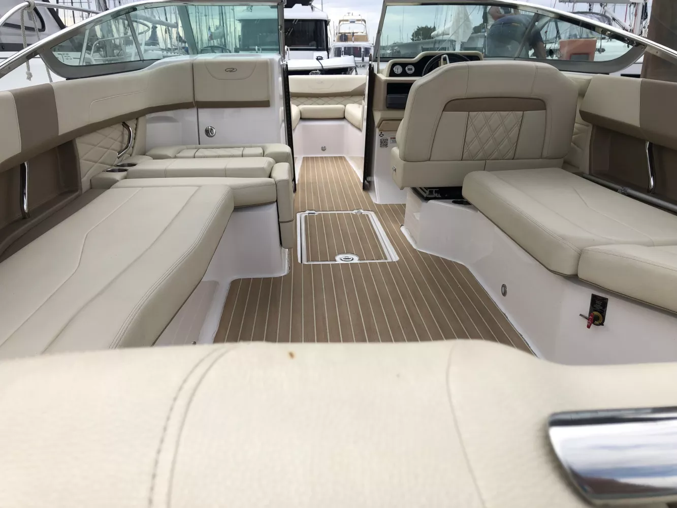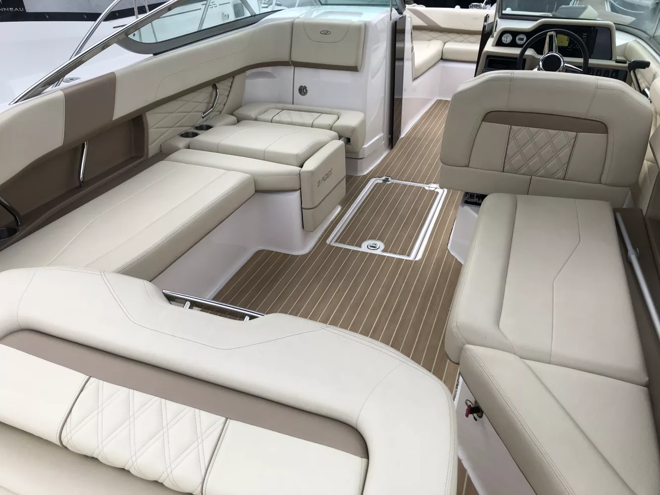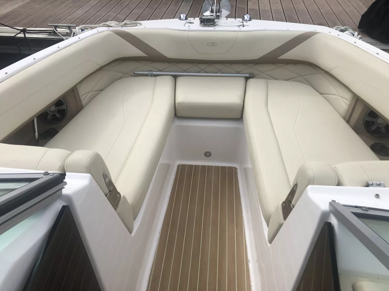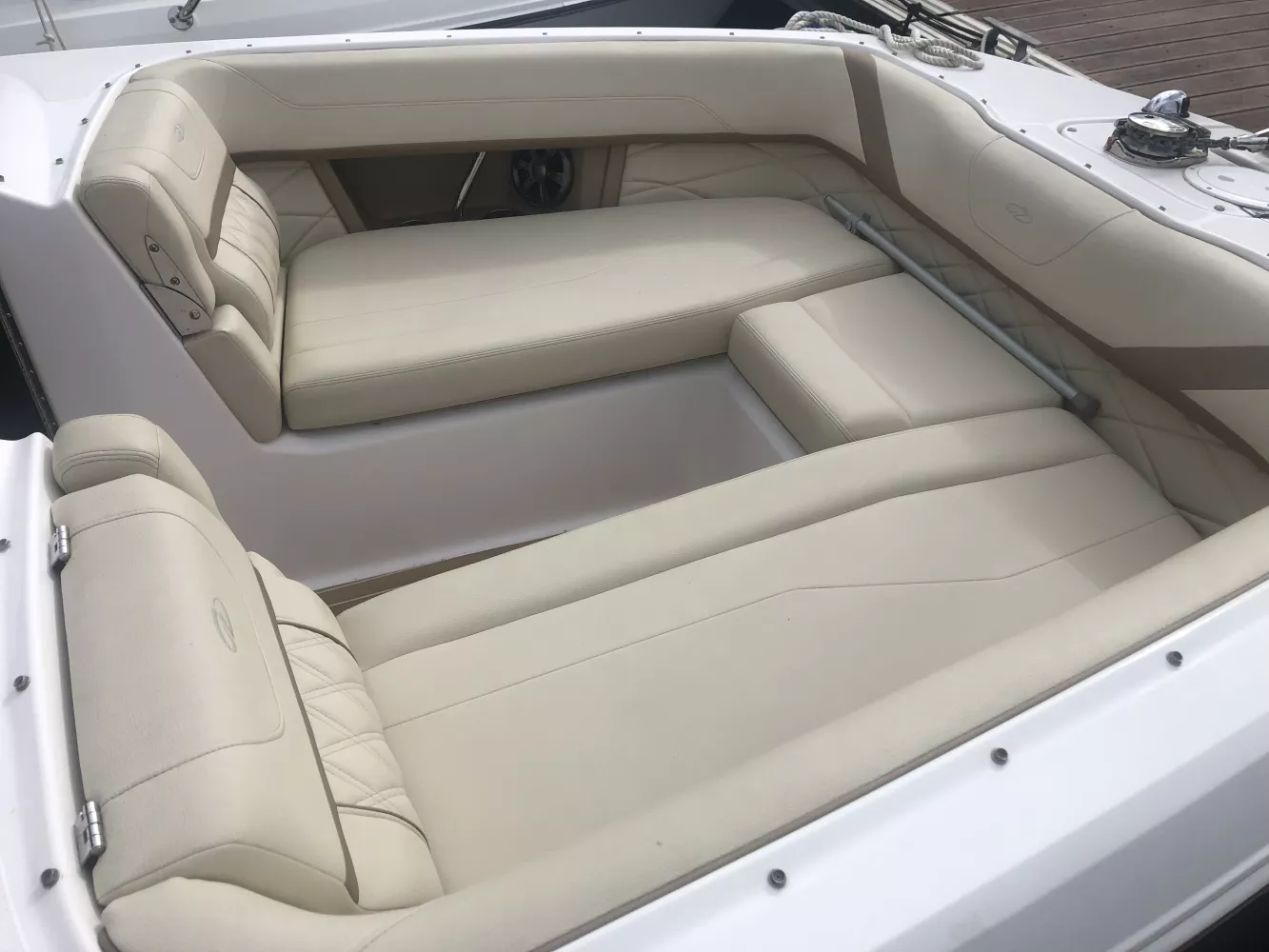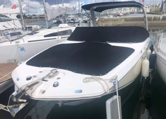 Motorisation : Moteur Volvo 300Cv V8. Essence. (110 heures). Transmission Z. Entretien pro's. Réservoir 280 Lts. Equipements : Compartiment toilette. Intérieur cuir crème. Vastes zones d'assises. Radio FUSION + six haut-parleurs. Traceur GARMIN. Armement de sécurité. Taus Av & Ar plus taud d'hivernage complet. Guindeau électrique. Glacière. Table de cockpit. Réservoir eau 45 Lts. Bimini. Visible sur simple appel au 06.47.17.62.13