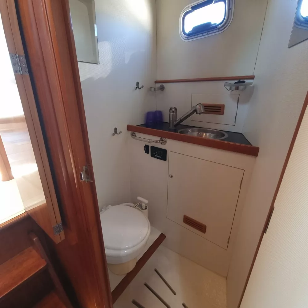 Salle d'eau : WC manuel sur holding tank, lavabo et douche