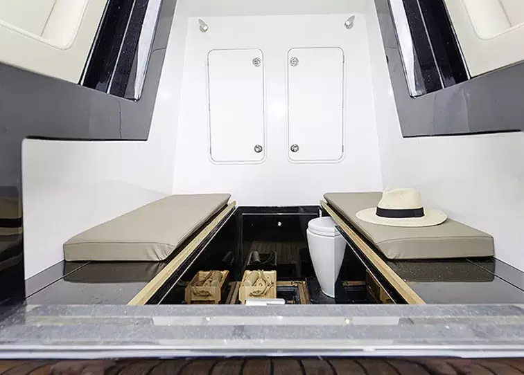 La console intègre une cabine fonctionnelle, équipée de WC marin avec réservoir eaux noires, permettant des sorties prolongées ou des nuitées occasionnelles.