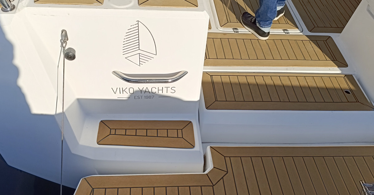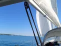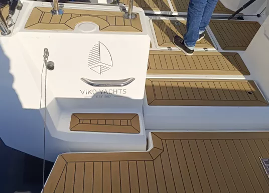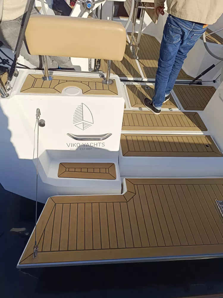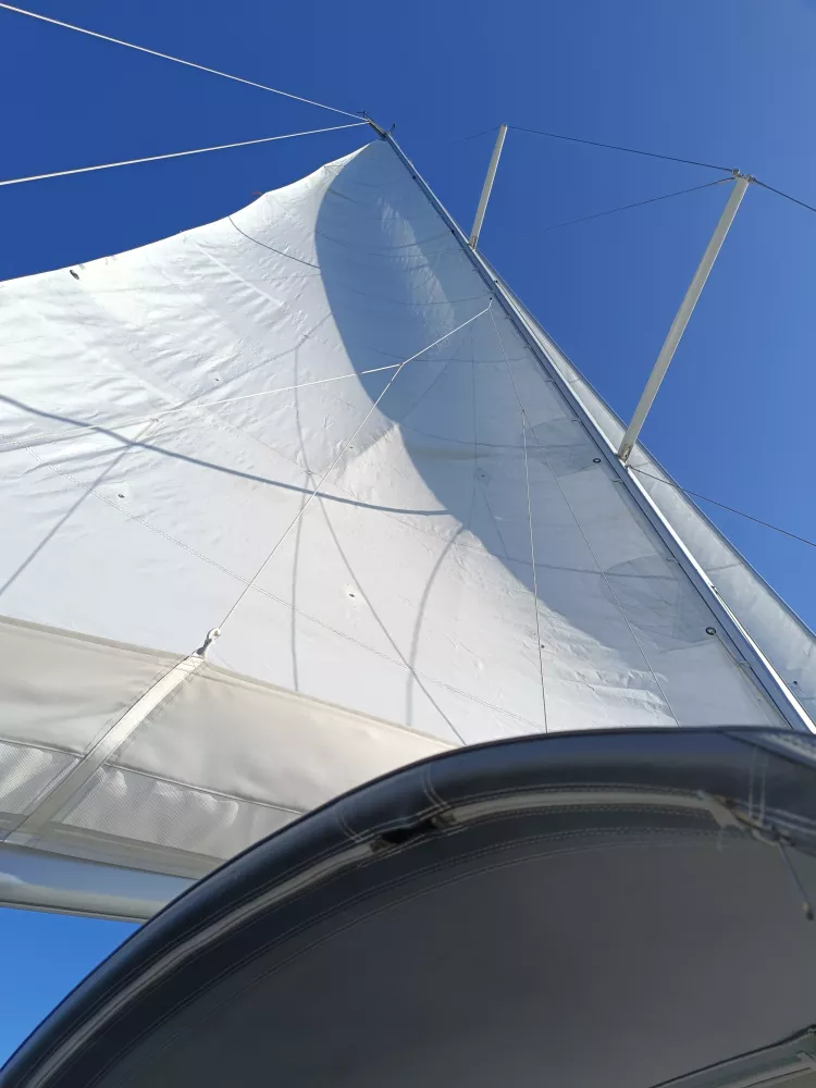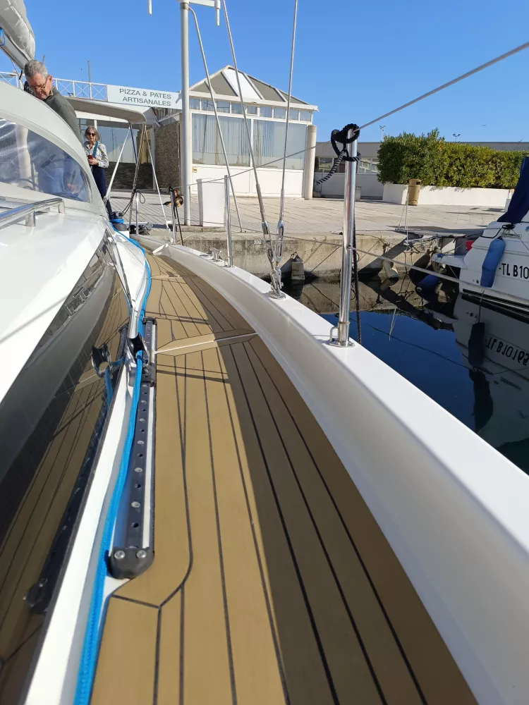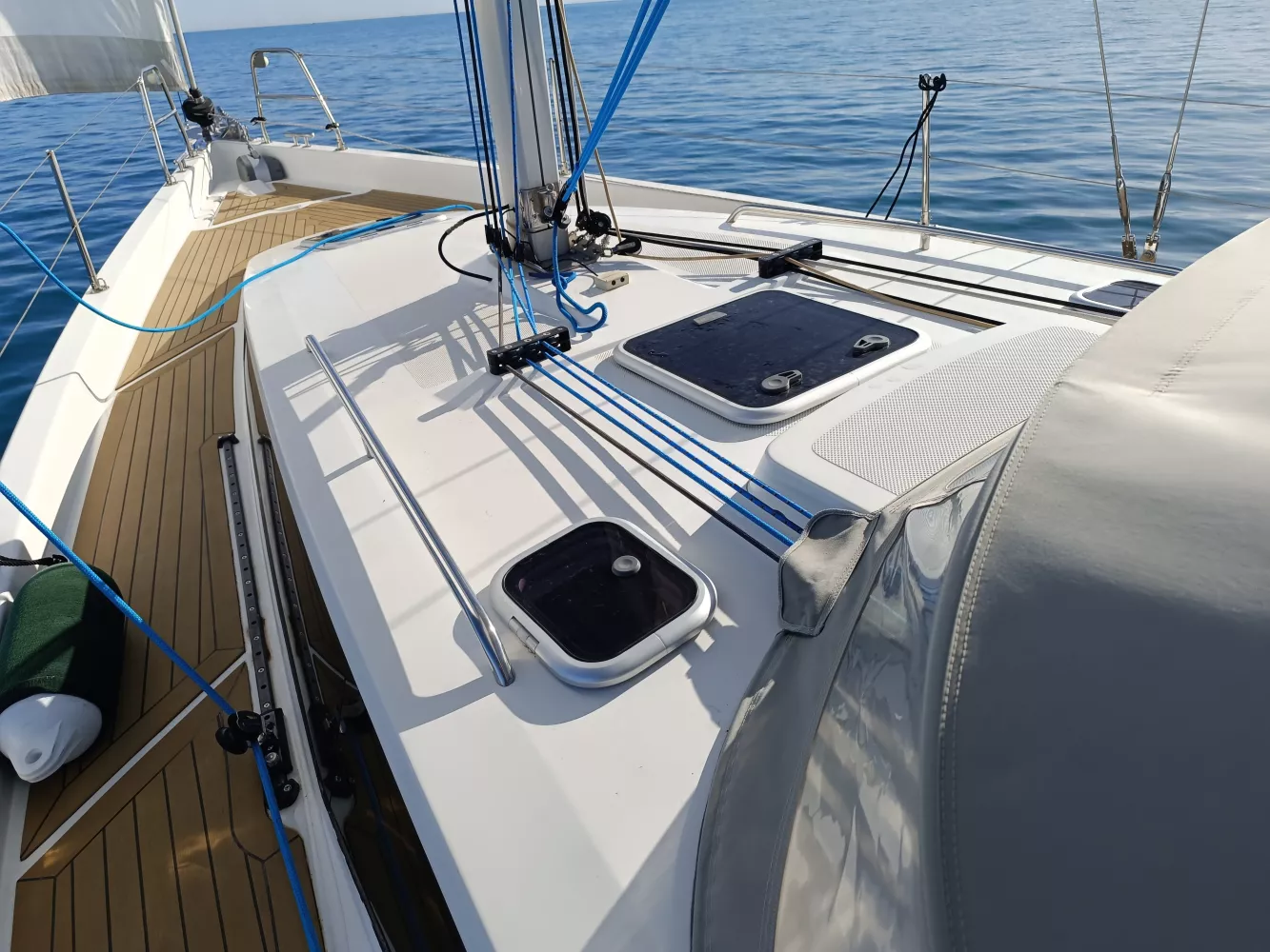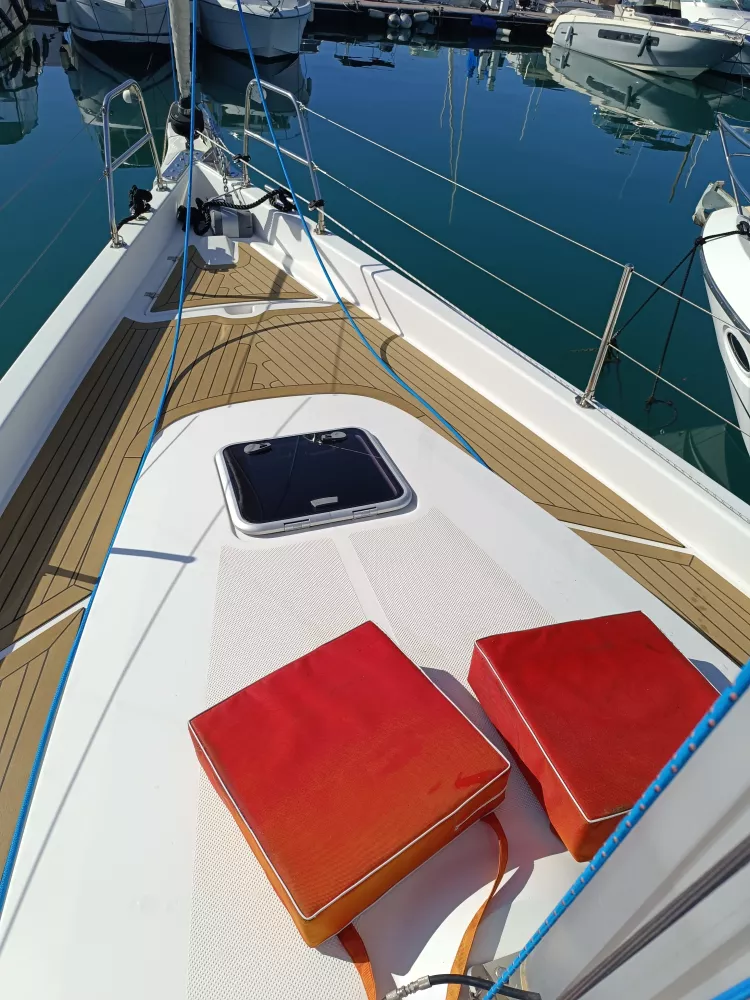 Coque blanche avec hublots panoramiques, delphiniere, Moteur 30CV Yanmar, jeu de voiles avec protection UV du génois, GV full batten à corne, lazzy bag, Flexiteek complet, double barre à roues, table de cockpit, plage arriere avec echelle de bain, guindeau , bimini, capote de roof, coussins