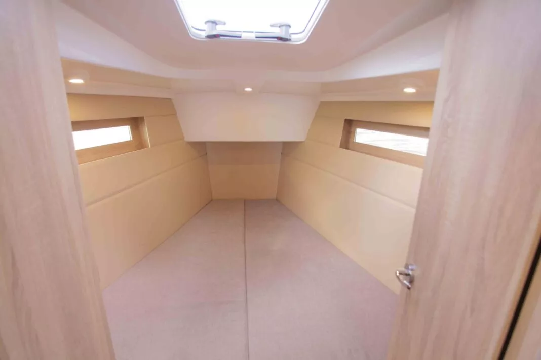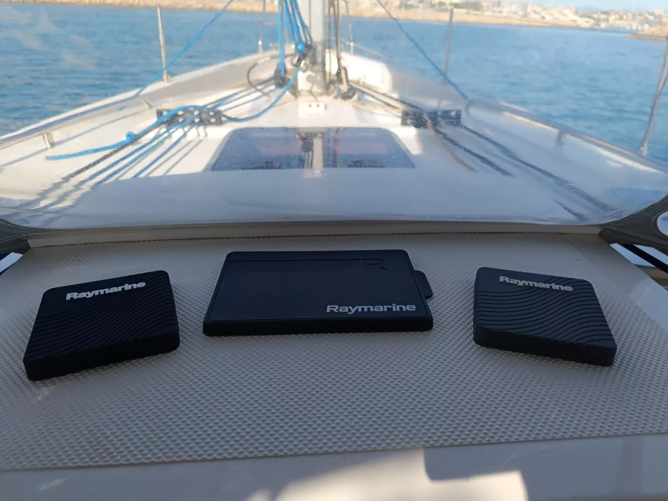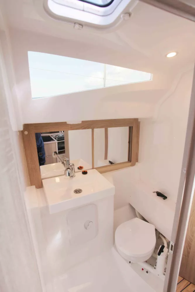 Intérieur, eau sous pression electrique, eclairage Leds, Salle d’eau avec vasque et WC chimiques. Réfrigerateur, double Batterie, Chauffe-eau, pilote automatique, GPS, VHF Raymarine