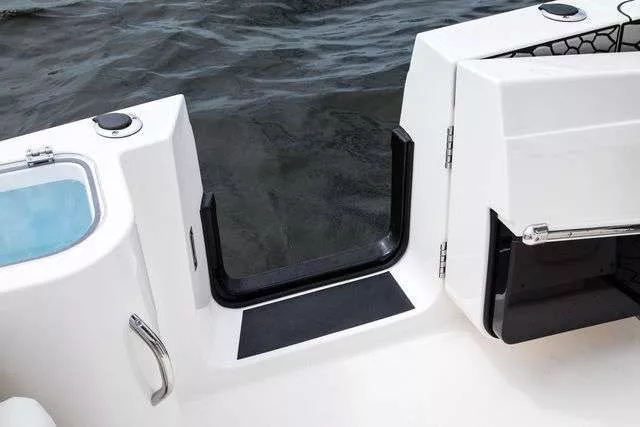 Extérieur : Pensé pour la pêche, il dispose d'une porte latérale facilitant l'accès à bord ou la remontée de prises volumineuses. Sa coque performante assure une stabilité remarquable, même dans le clapot.